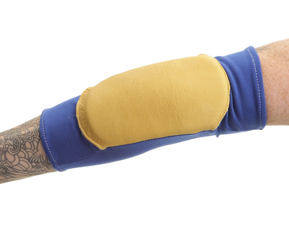 Elbow pad, pull on style, memory foam padding conforms to the natural curves of the arm, 4-way stretch breathable polycotton with grain leather cover.