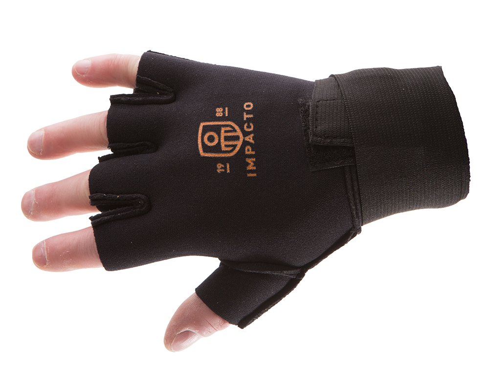 IMPACTO half finger snug fitting Anti-Fatigue gloves. Neoprene construction helps maintain body heat, massages as it supports, relieving stress and strain. Detachable elastic wrist support with hook and loop closure.