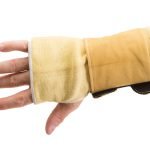 Fingerless style. Made with 100% KEVLAR® knit. Grain leather cover offers abrasion protection. VEP padding in the palm absorbs and dissipates impact and vibration. Grain leather wrist support with hook and loop closure.