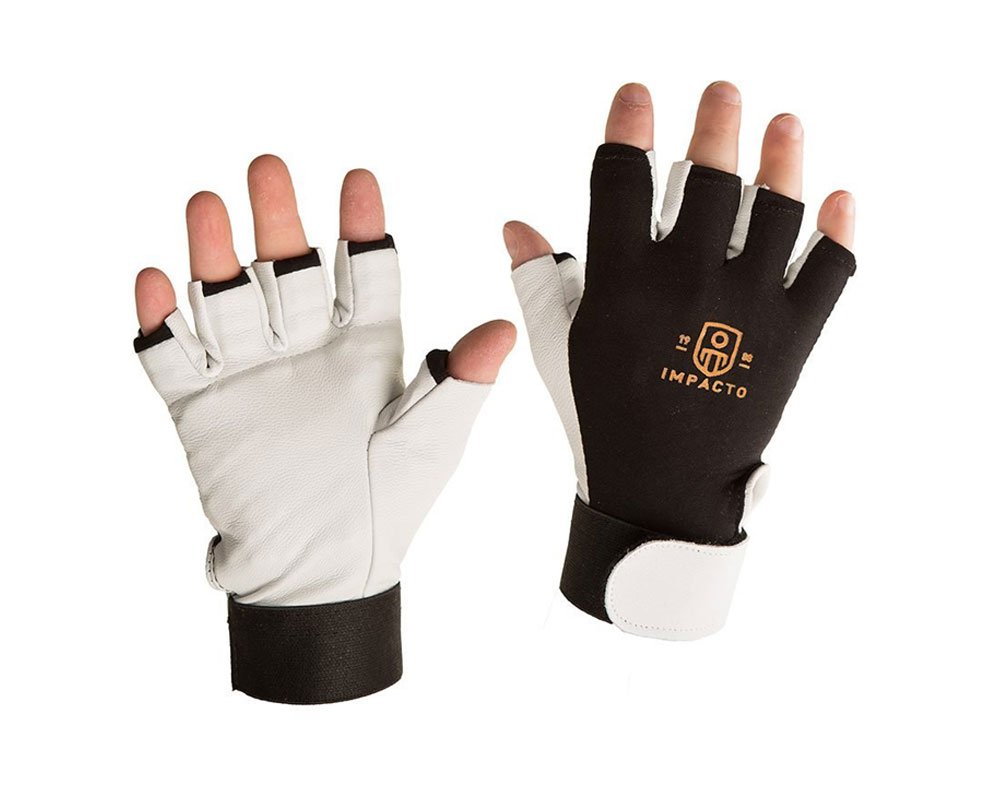 Impacto BG401 made with nylon back and soft leather palm, half finger with thumb gussets and hook/loop wrist closure. Offers great dexterity and tactile feedback.