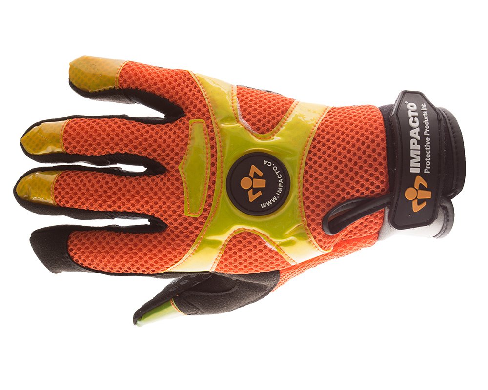 IMPACTO Anti-Vibration High Visibility Air Glove. Utilizing patented Air Glove® technology in the palm, fingers and thumb. Mechanic style glove style designed for maximum comfort, dexterity and safety. Hi Viz and color enhanced gloves used with vibration power tools at night or in low-light conditions.