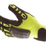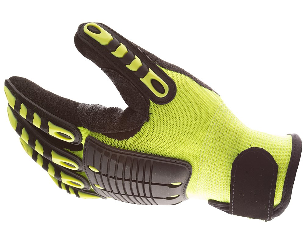 IMPACTO Back Tracker Anti-Impact Glove with Back of the Hand Protection. Heavy duty TPR on back of fingers, thumb and back of the hand protects against bruises and bumps. Antislip nitrile dipped palm offers excellent gripping. Sewn-on palm pad protects from impact. Reinforced patches in the thumb web area assure long wear and protection. High-visibility elastic neon green nylon laminated fabric. Adjustable hook and loop closure.