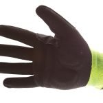 High-visibility elastic neon green nylon laminated fabric. Heavy duty TPR on back of fingers, thumb and back of the hand. Antislip nitrile dipped palm.