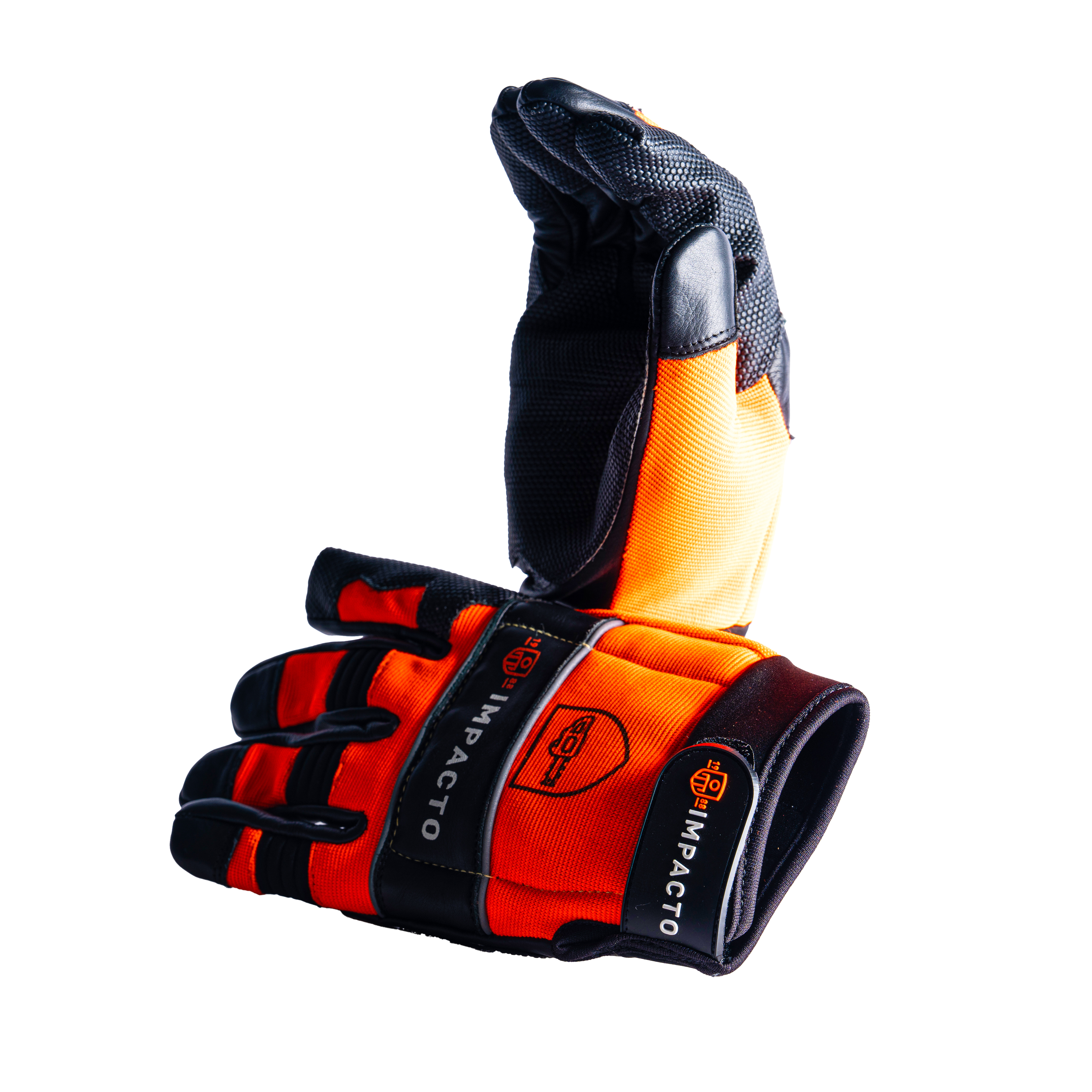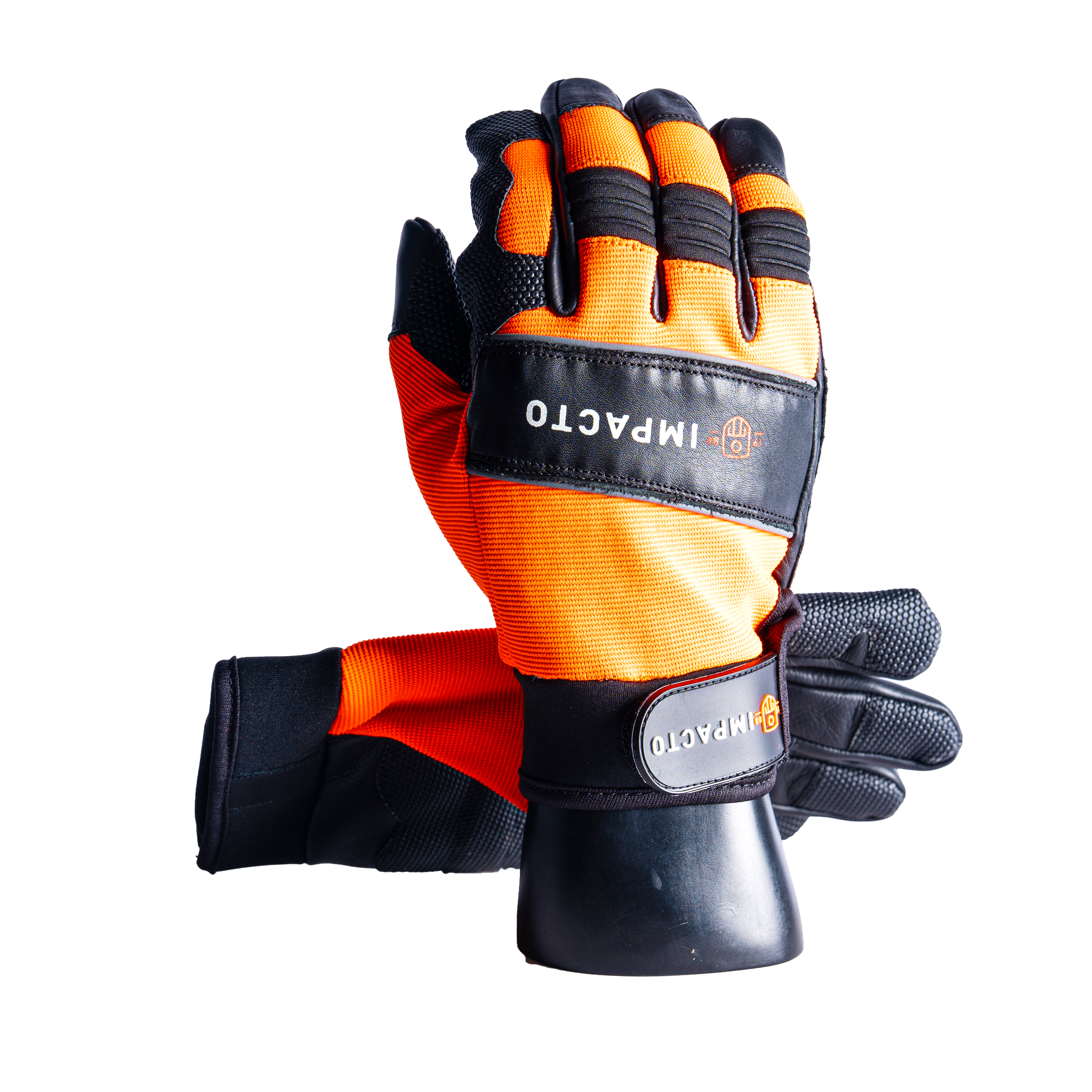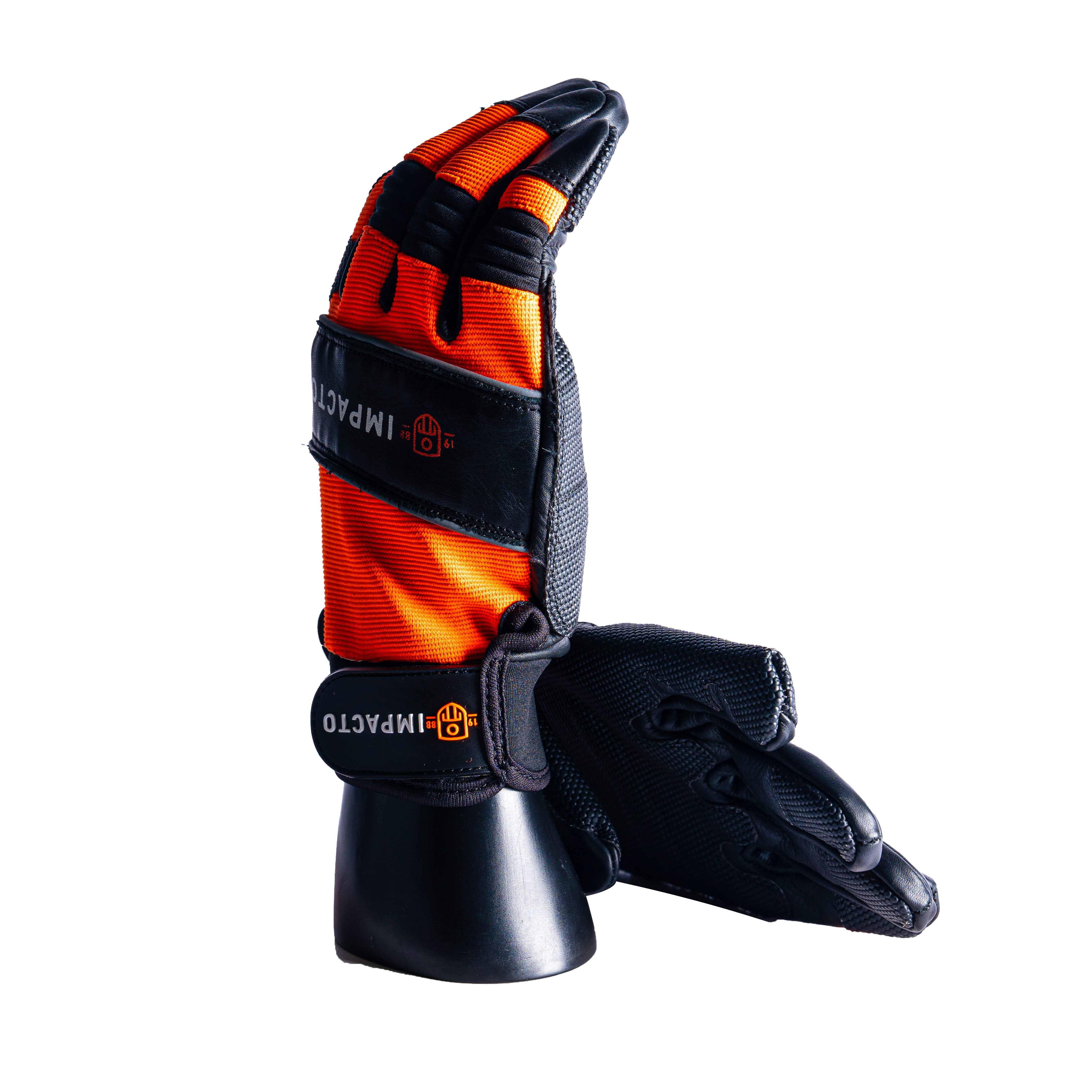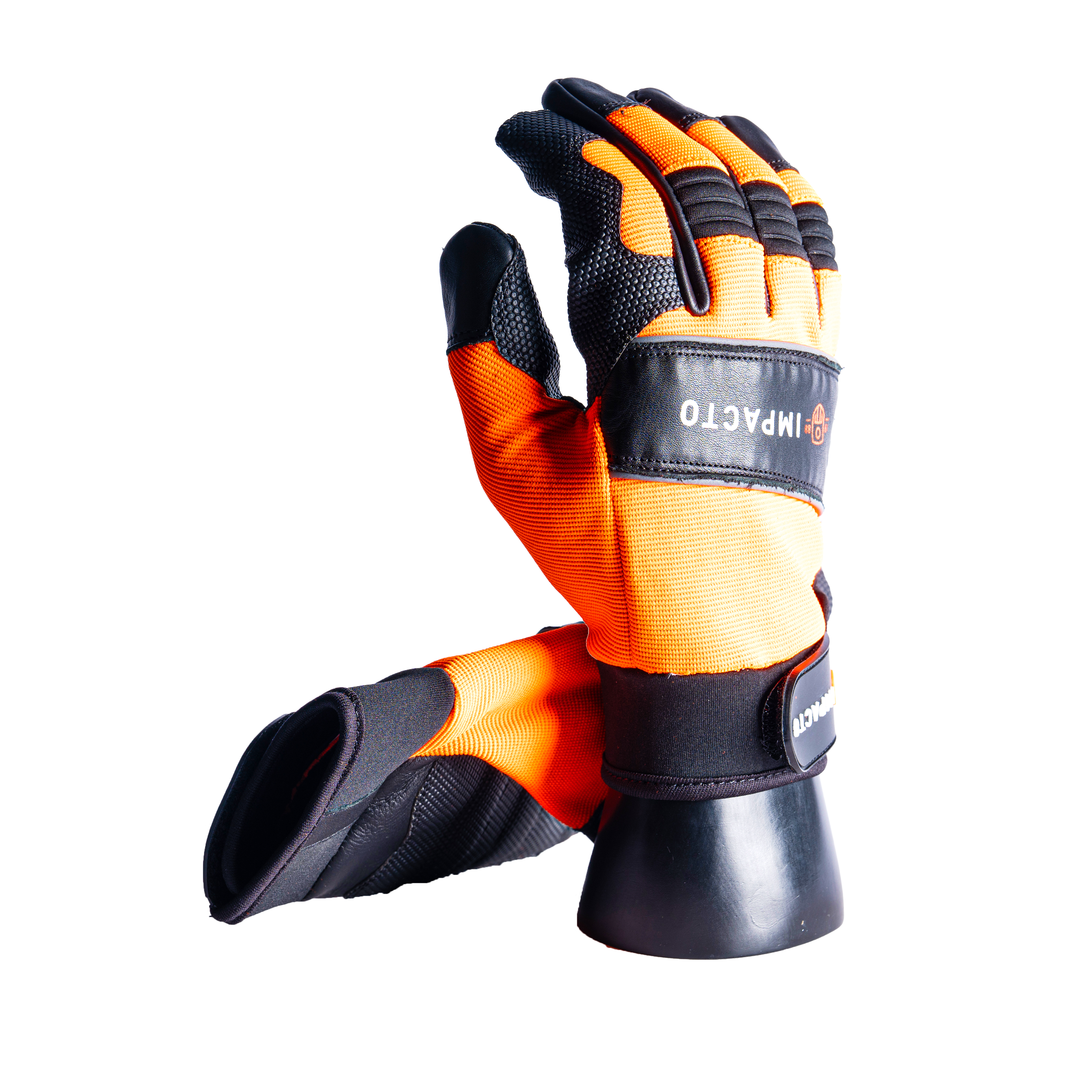 IMPACTO TimberGuard Chainsaw Glove designed to effectively halt a chainsaw running at 20 m/s upon contact with the back of the left hand. Essential for use in the forestry industry and at home while operating a chainsaw.