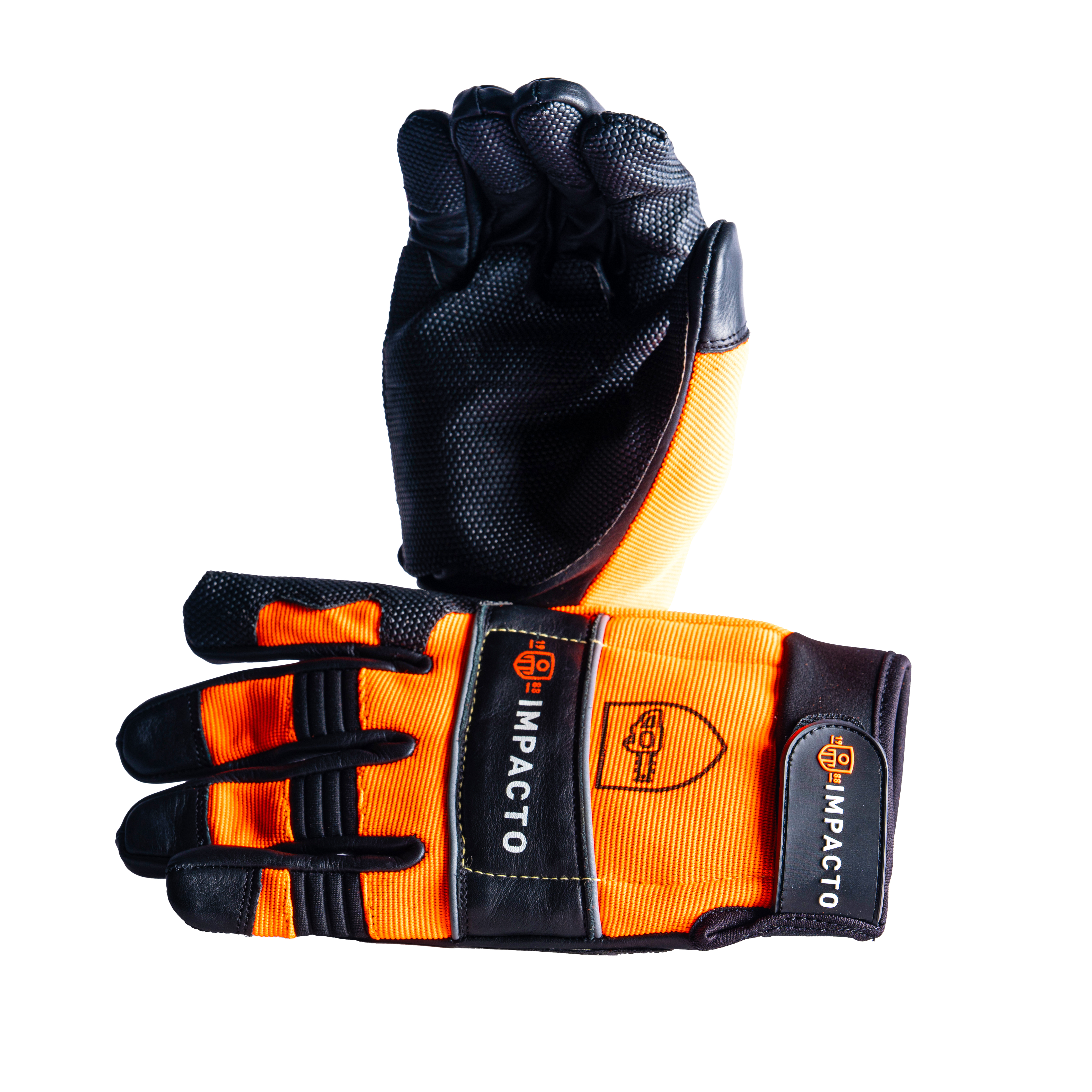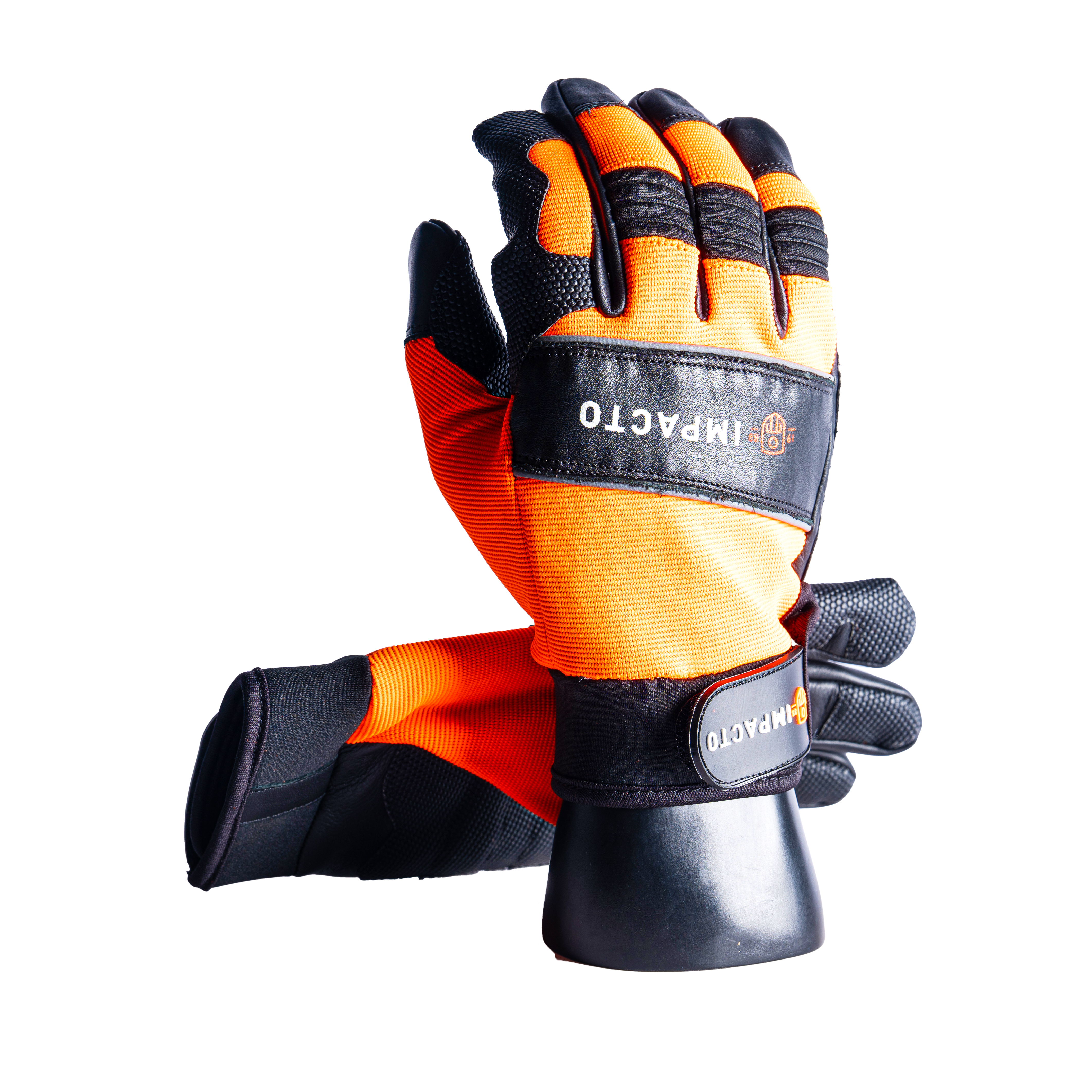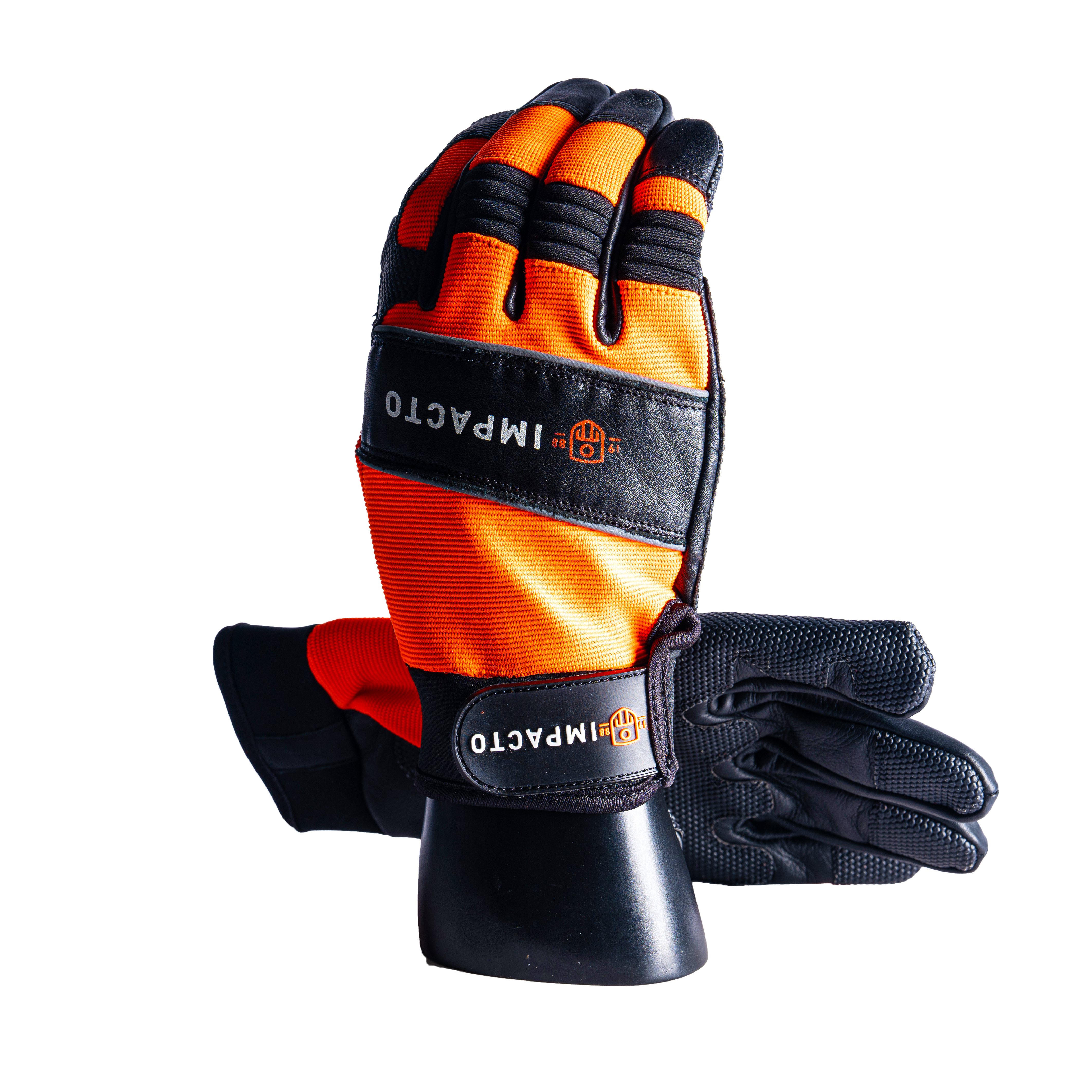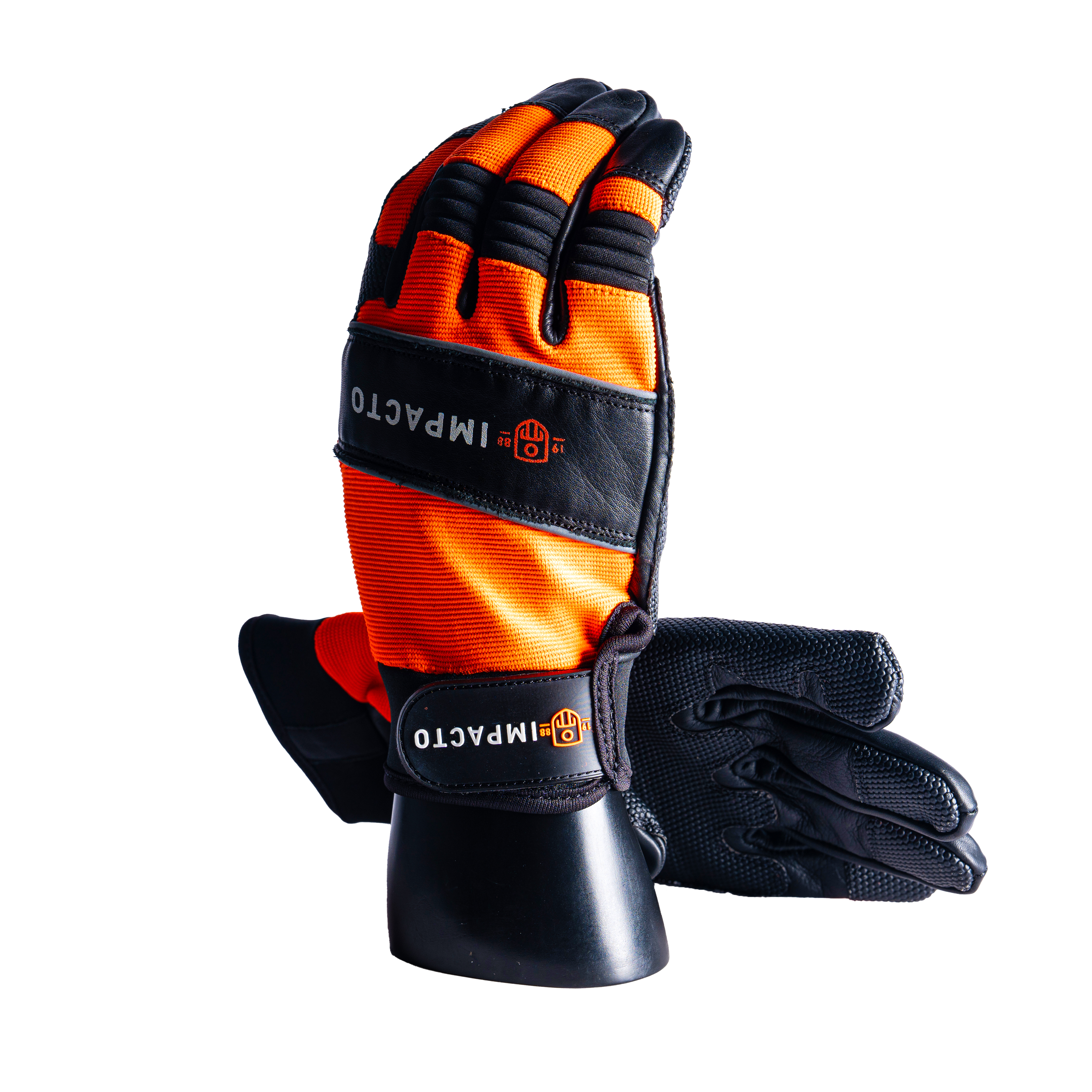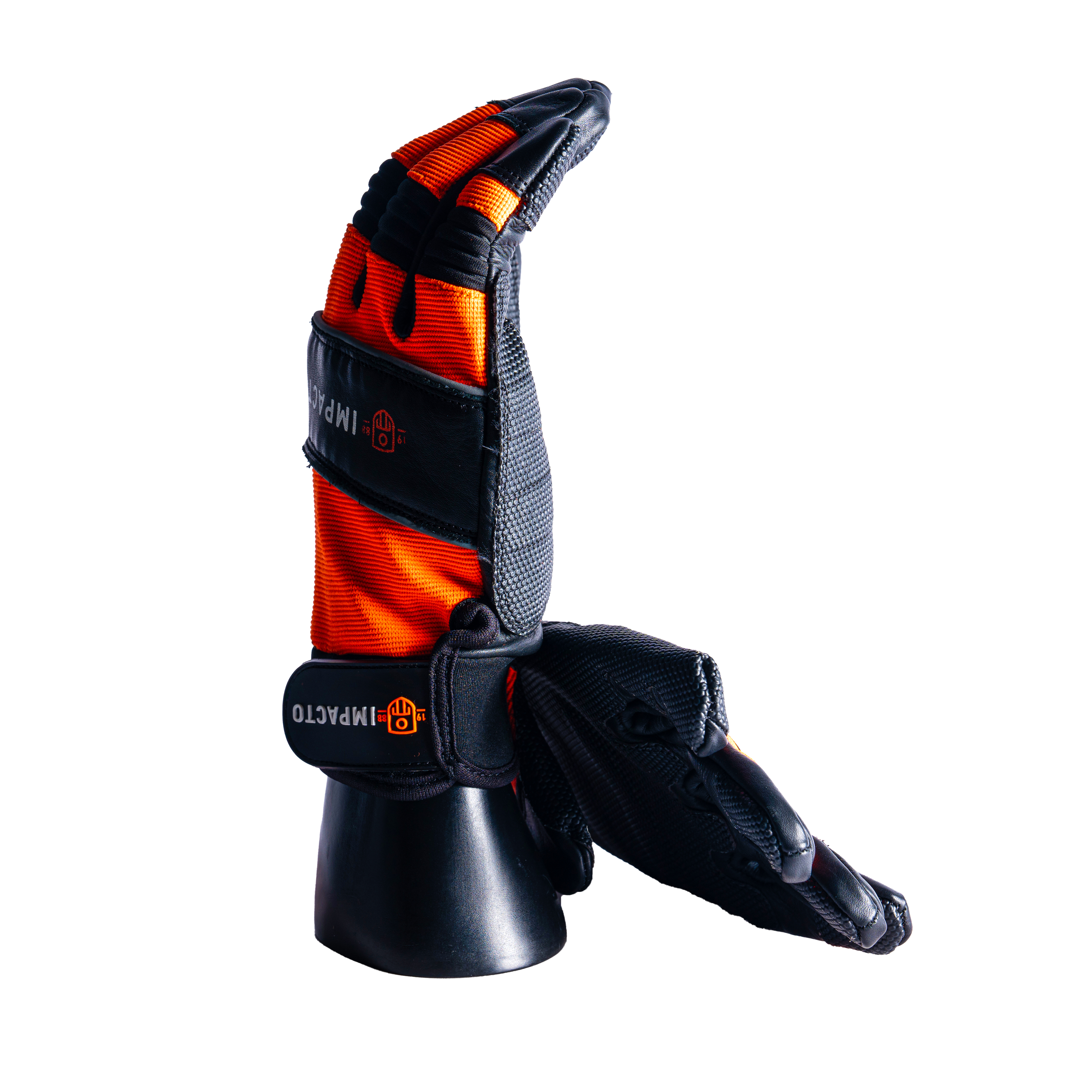 IMPACTO TimberGuard Chainsaw Glove designed to effectively halt a chainsaw running at 20 m/s upon contact with the back of the left hand. Essential for use in the forestry industry and at home while operating a chainsaw.