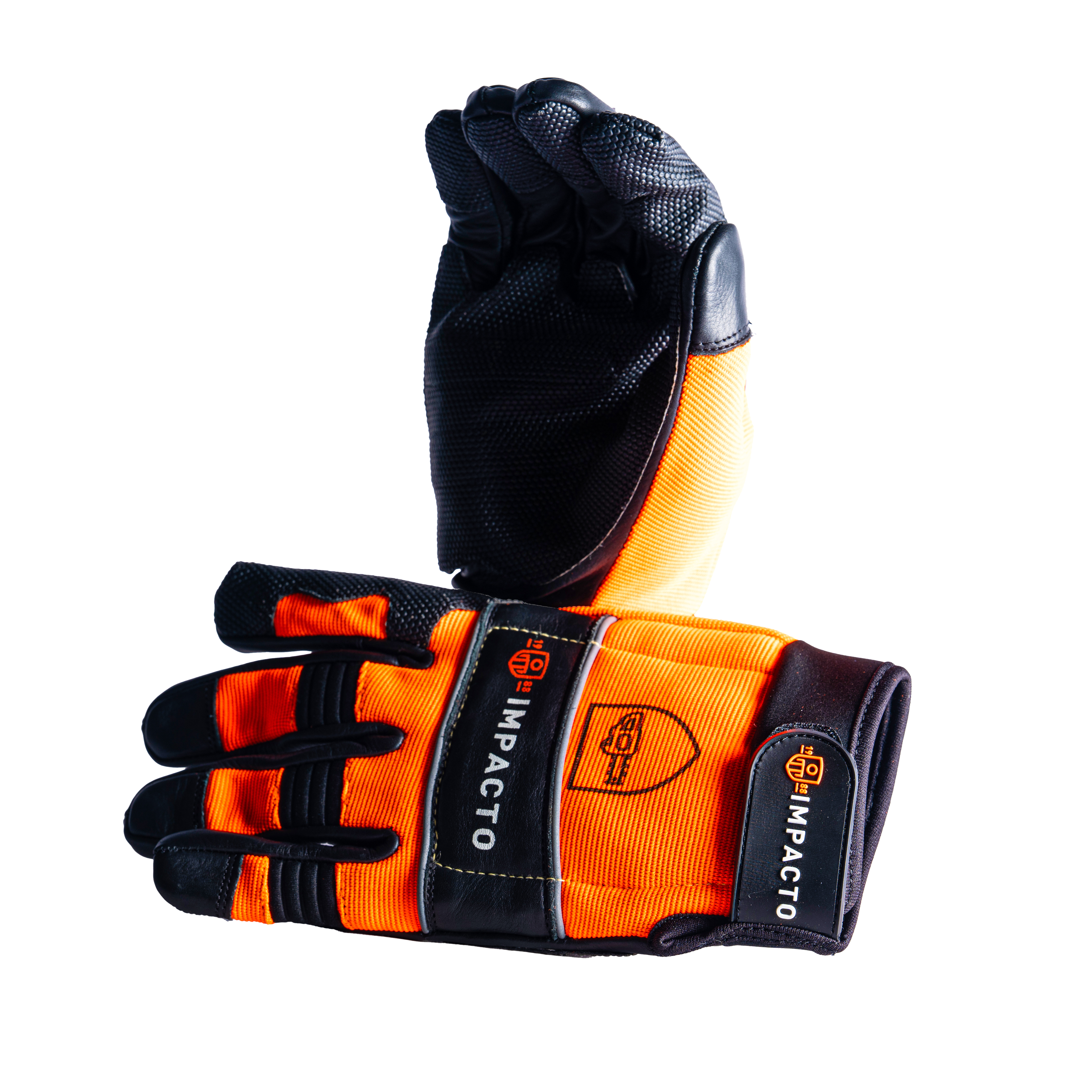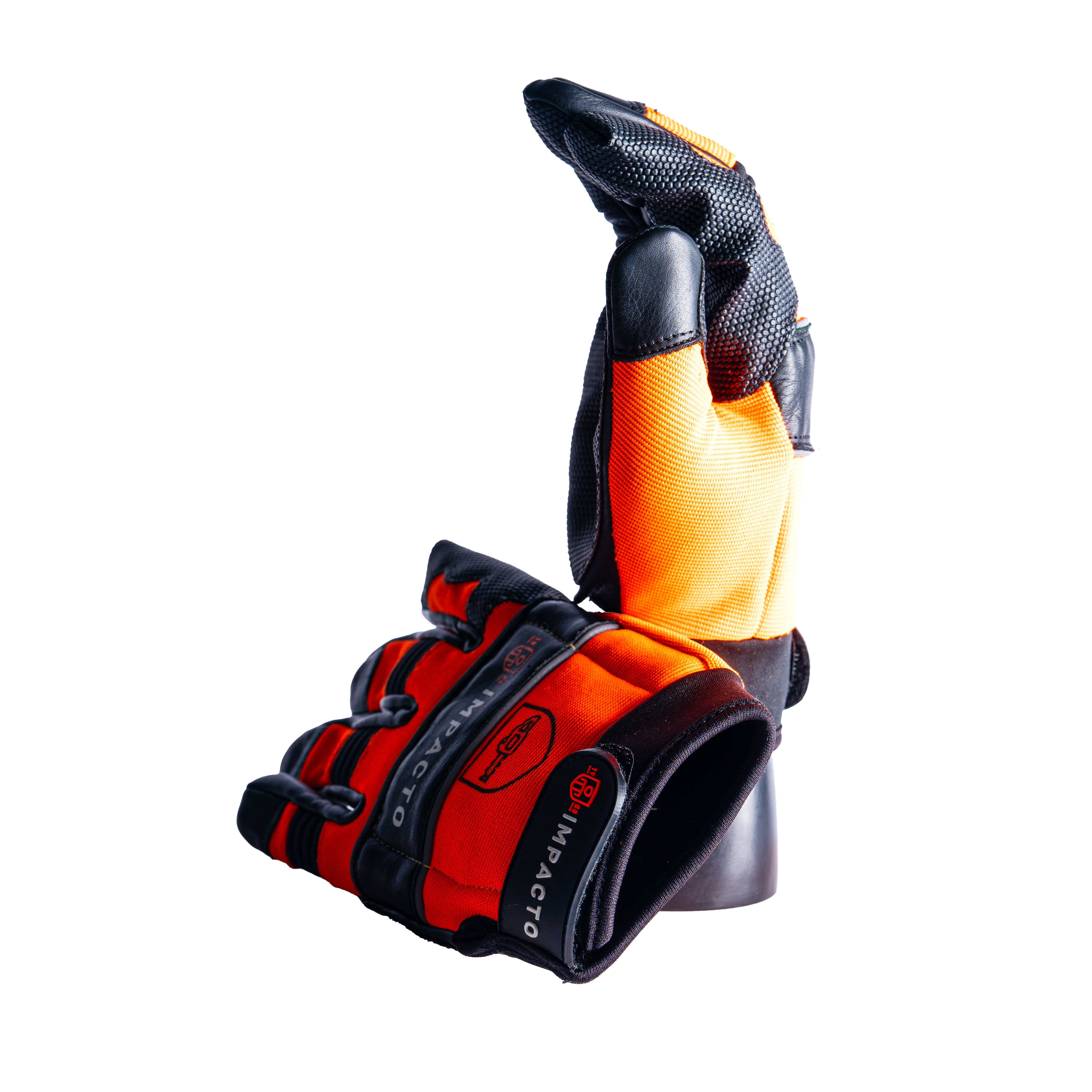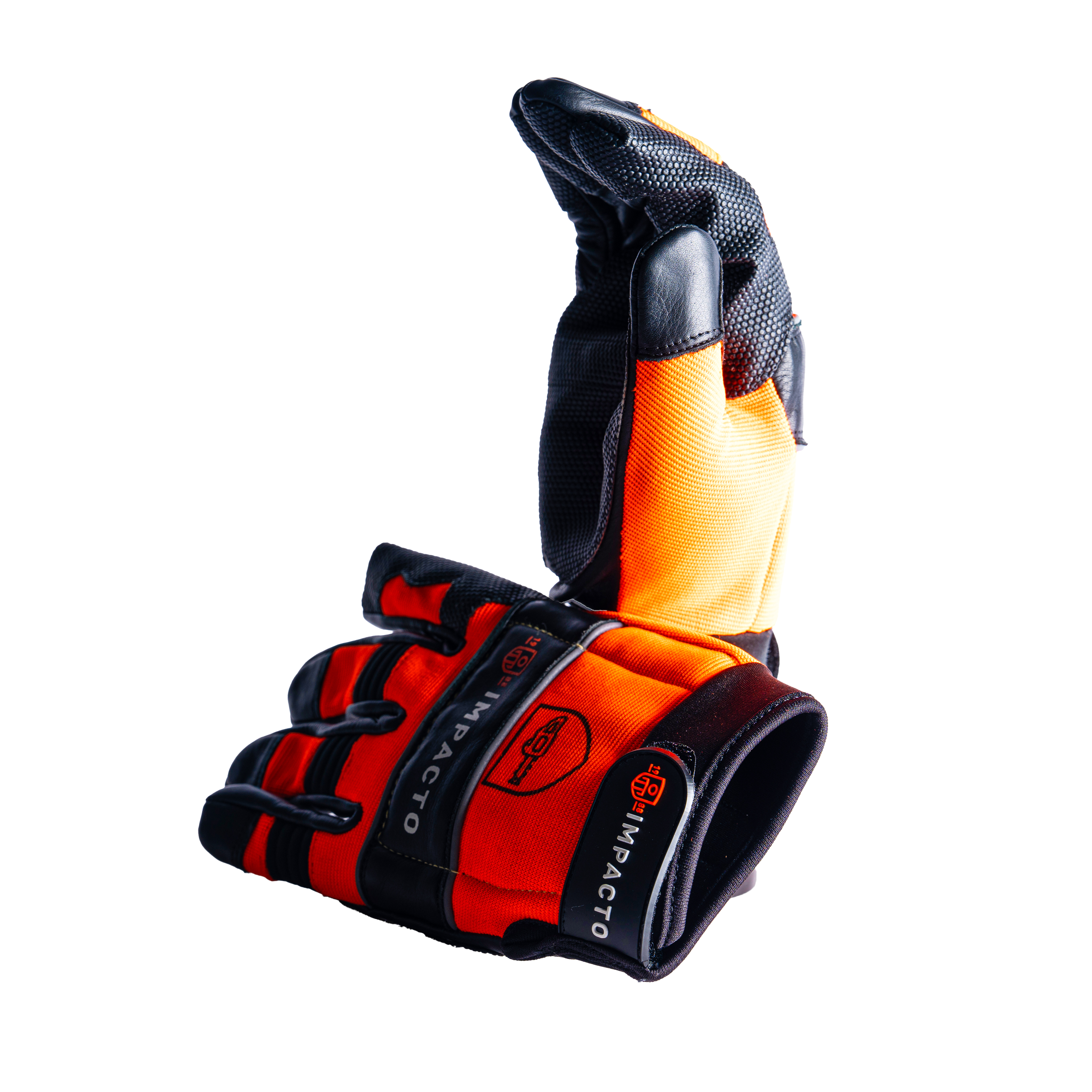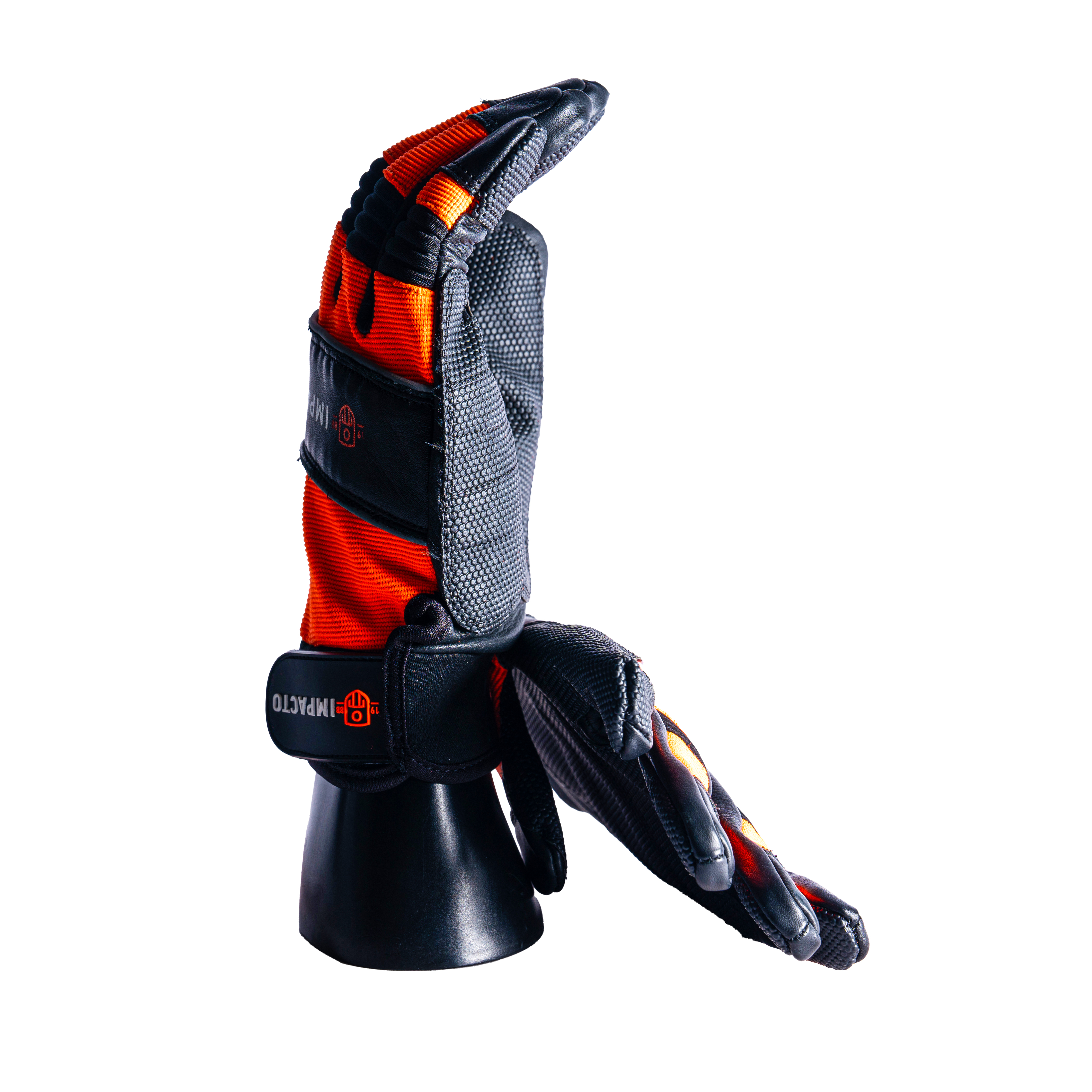 IMPACTO TimberGuard Chainsaw Glove designed to effectively halt a chainsaw running at 20 m/s upon contact with the back of the left hand. Essential for use in the forestry industry and at home while operating a chainsaw.