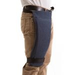 IMPACTO denim thigh pad. Impact and shock absorbing Viscolas padding. Adjustable nylon webbing belt at the waist with plastic side release buckle. Elastic leg strap with hook and loop closure.