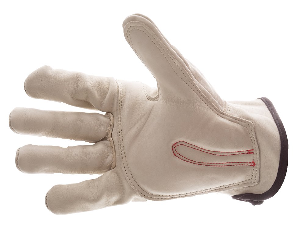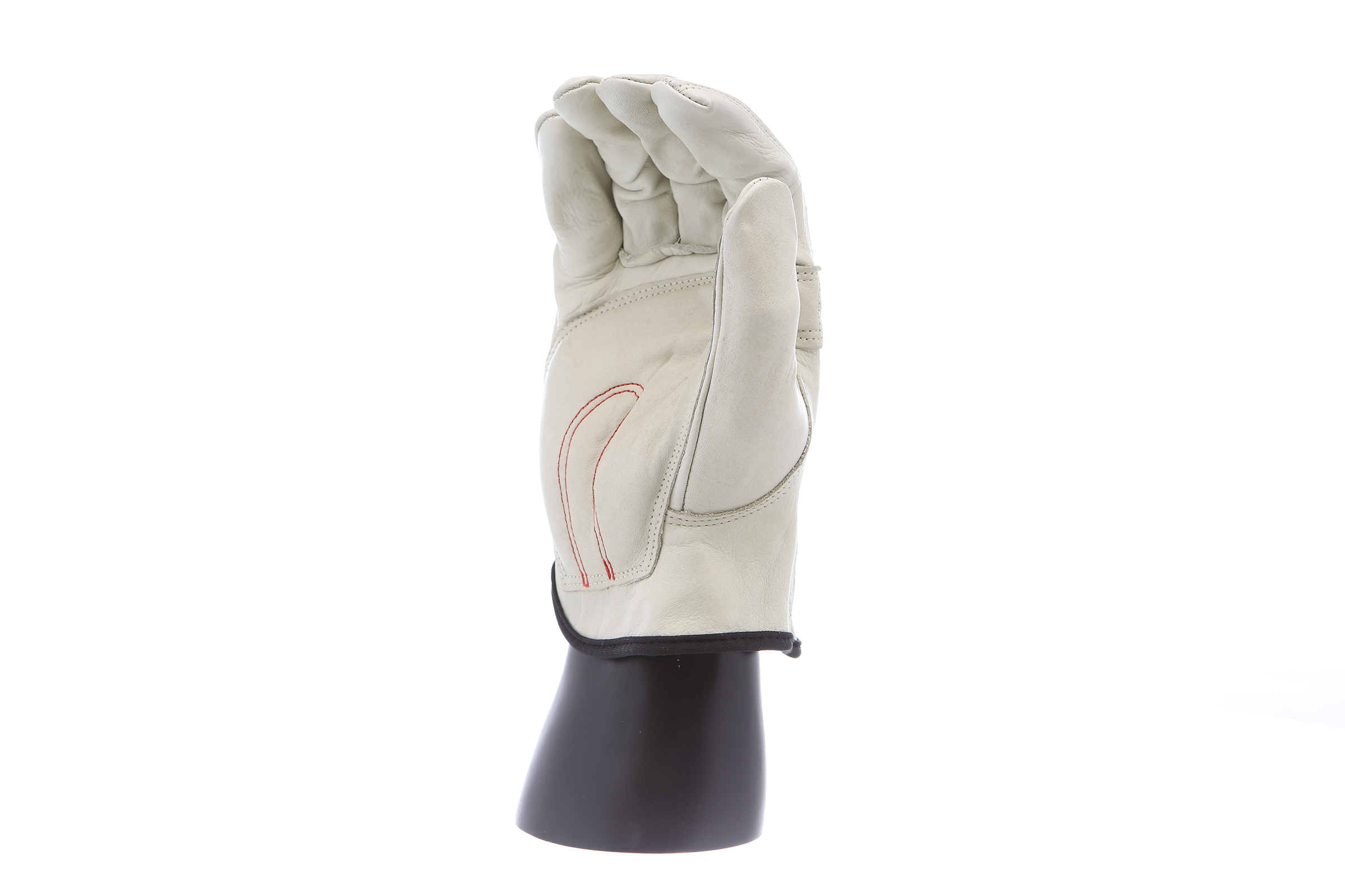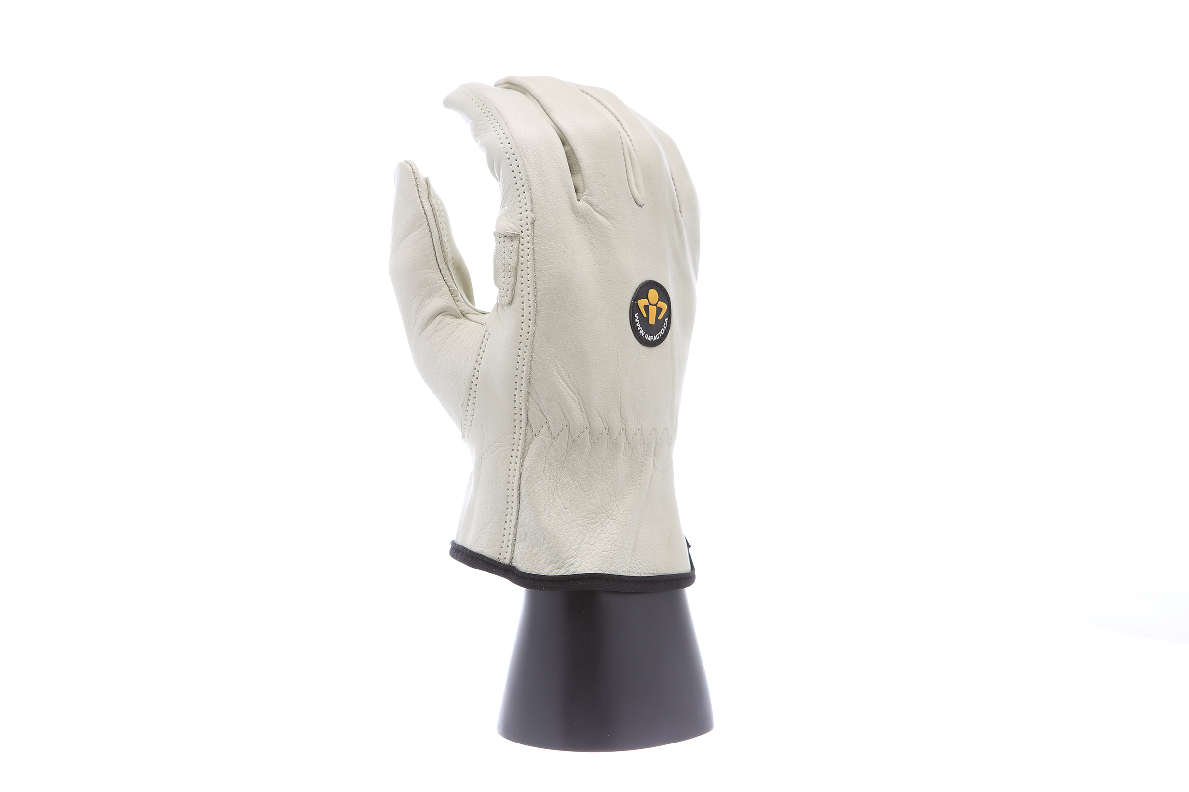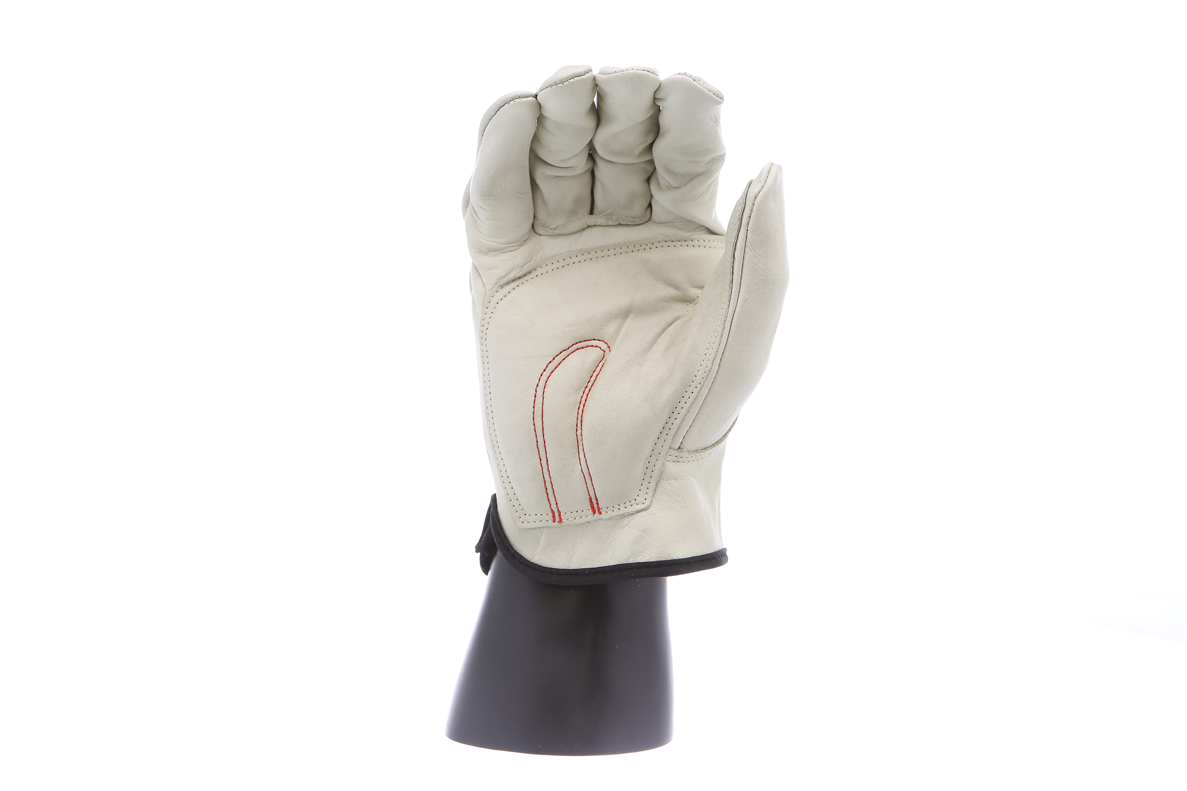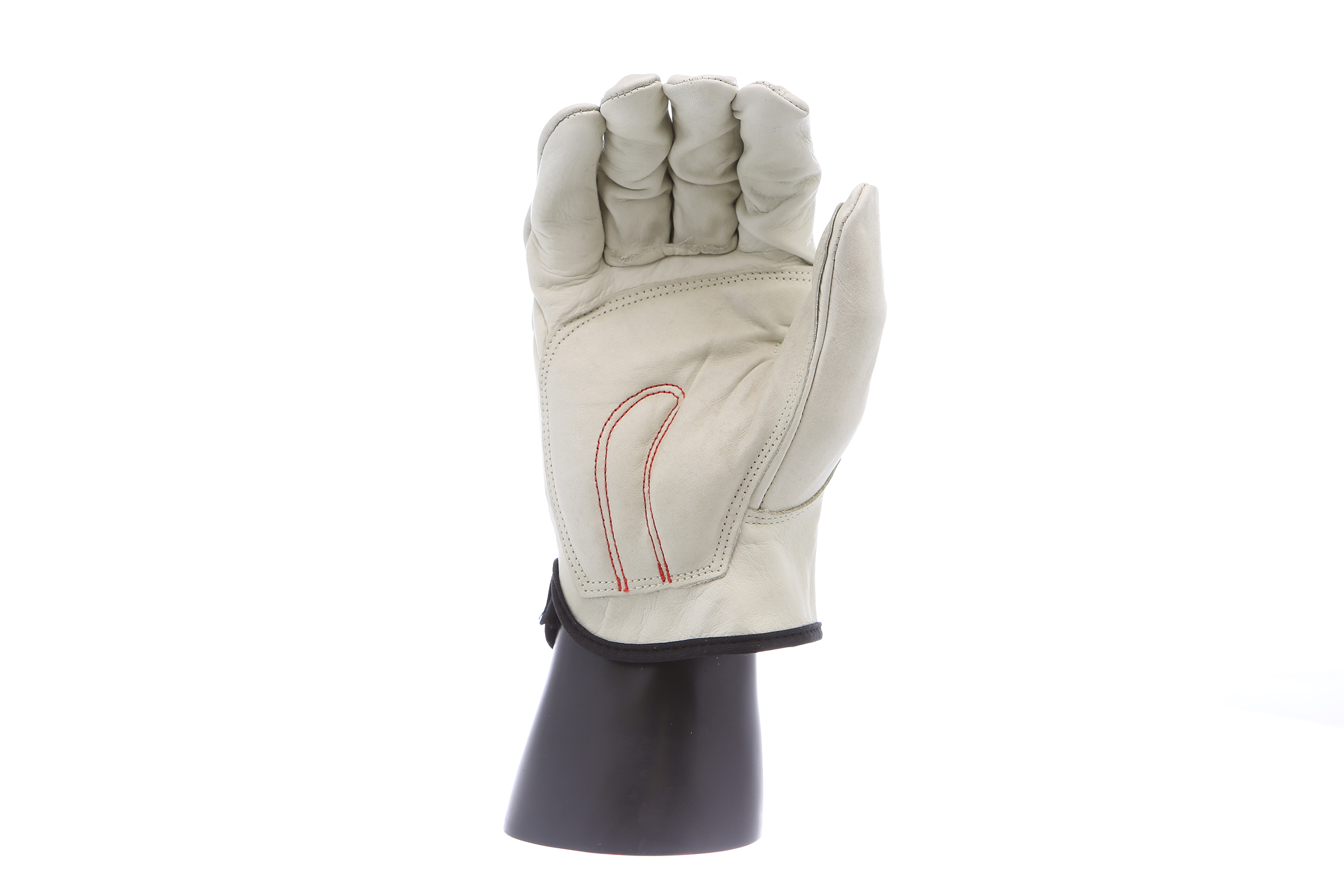 Cowhide leather glove with unique channel over the carpal tunnel keeps pressure off the median nerve. VEP palm pad protects from impact.