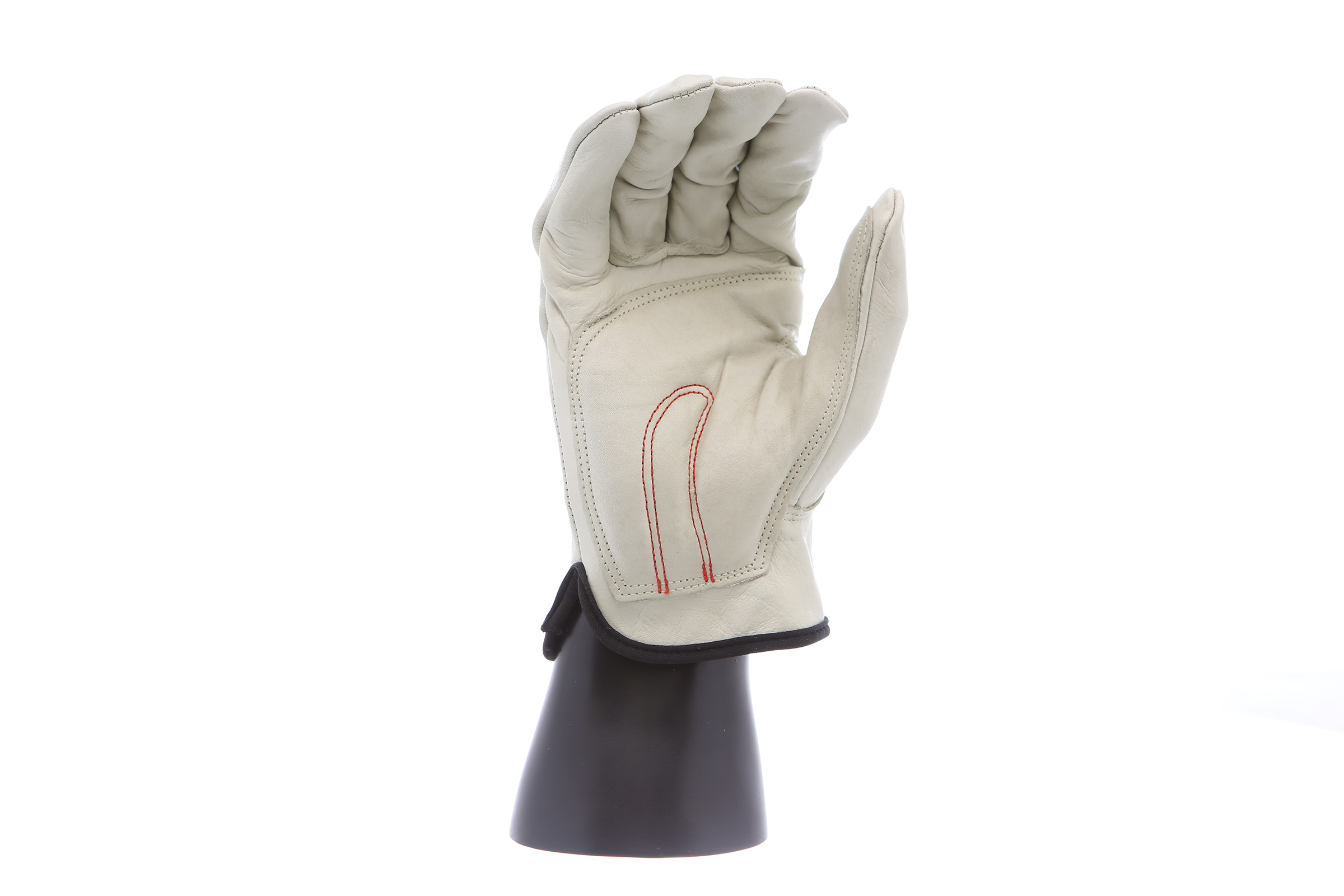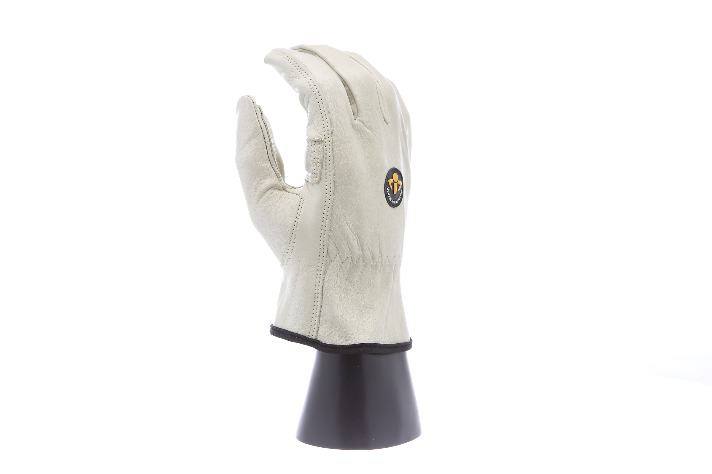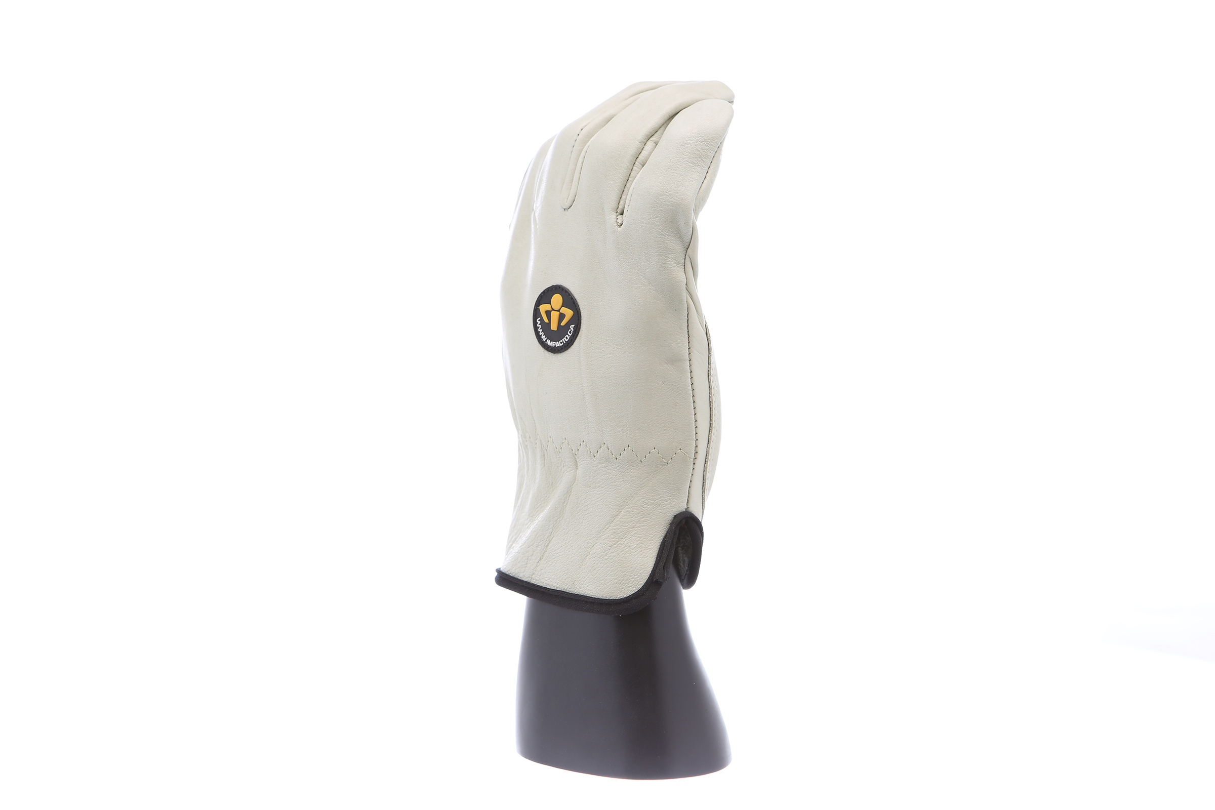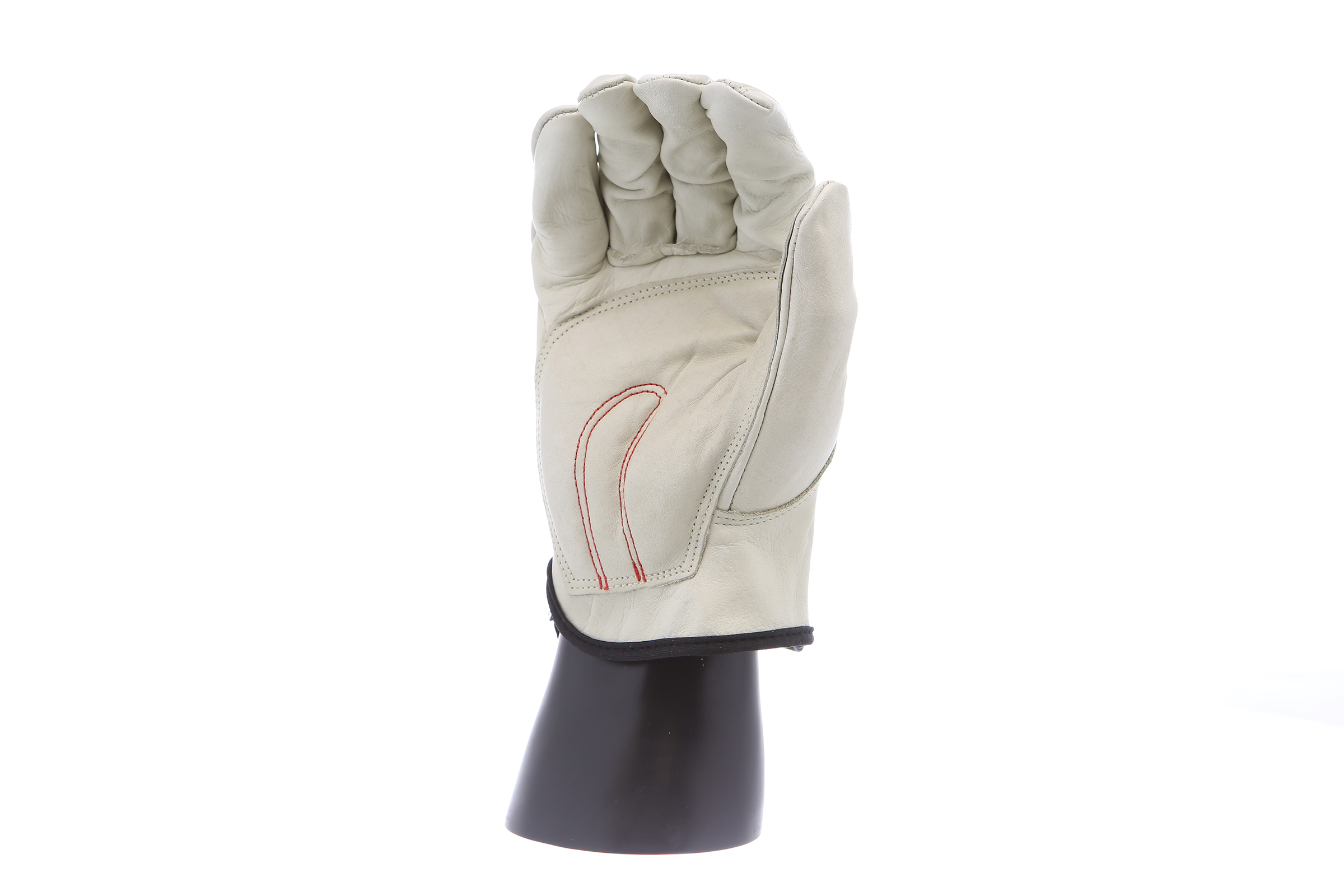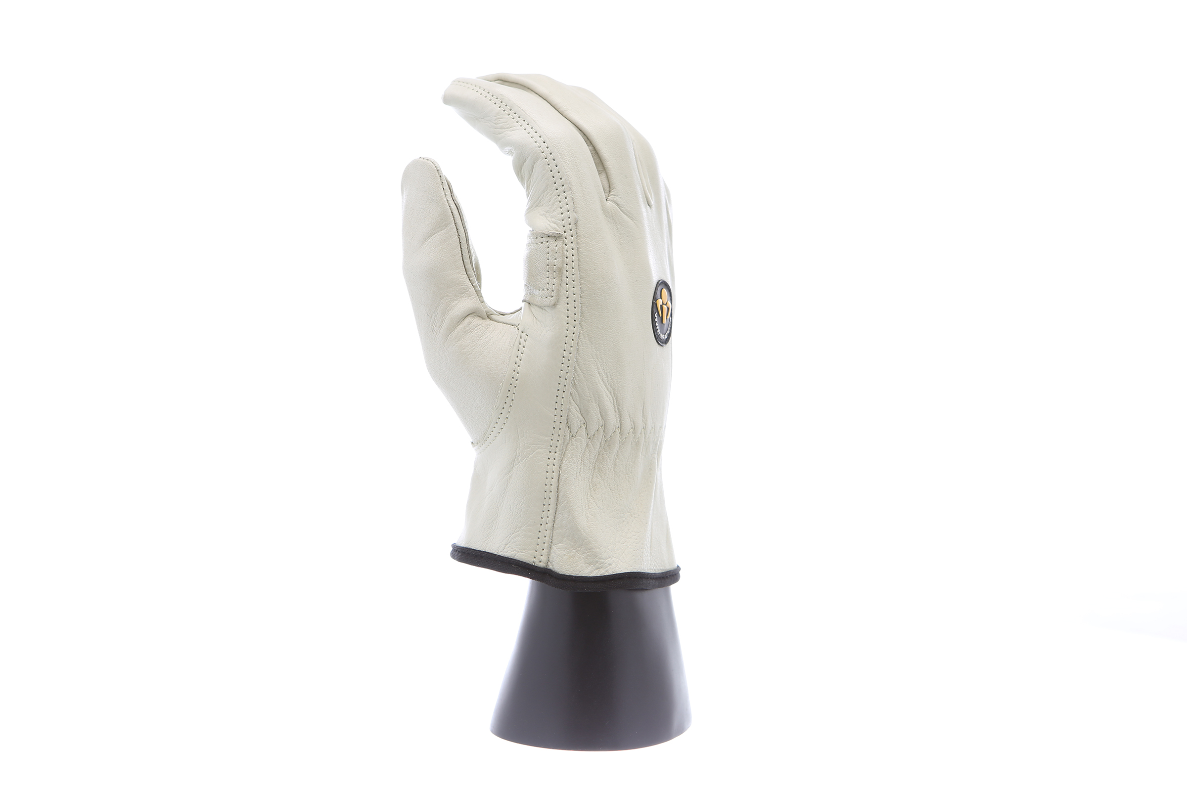 Cowhide leather glove with unique channel over the carpal tunnel keeps pressure off the median nerve. VEP palm pad protects from impact.