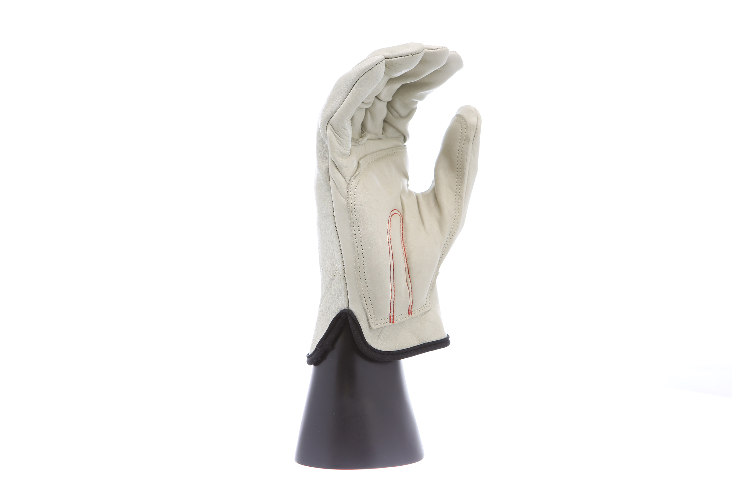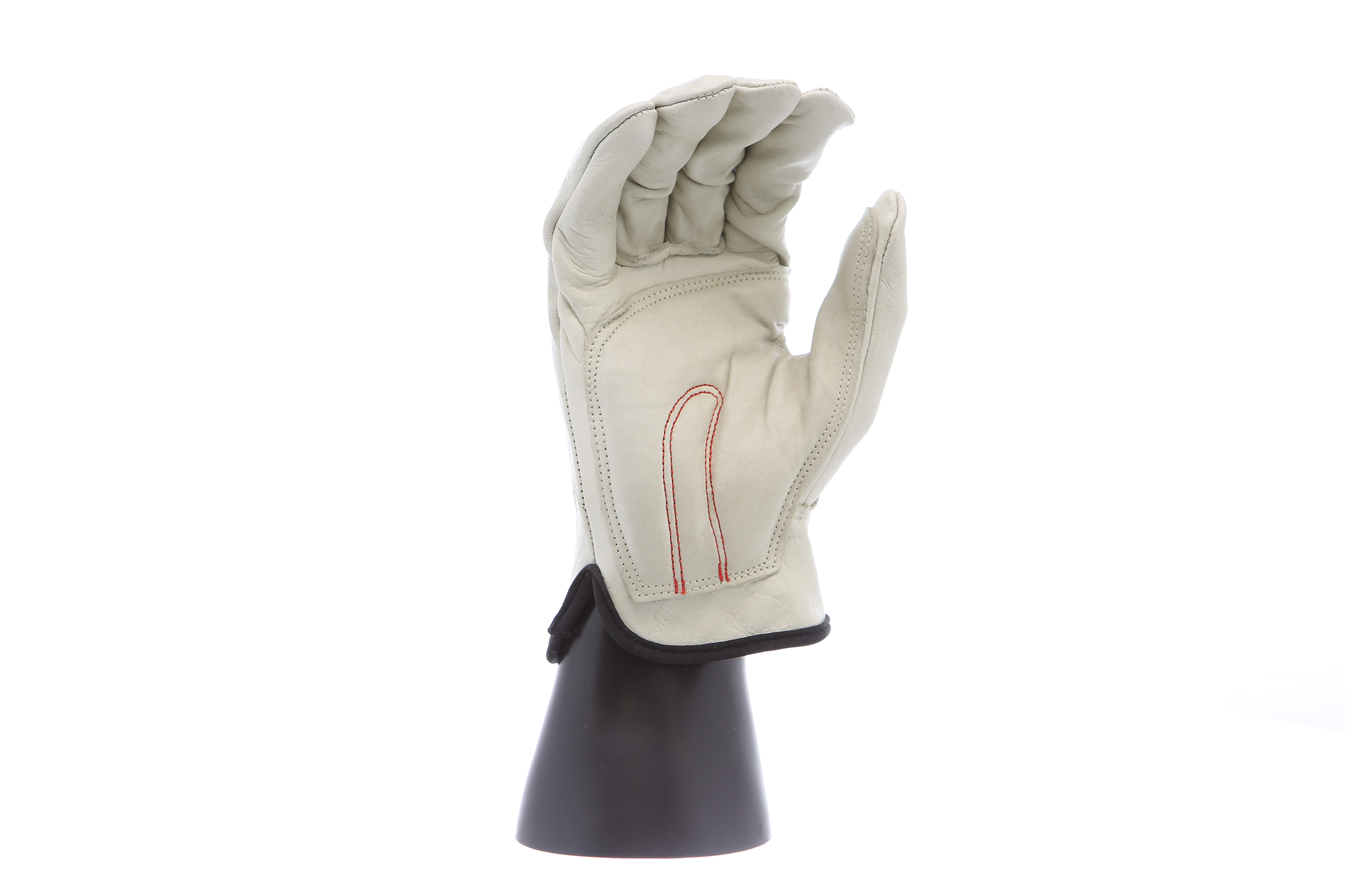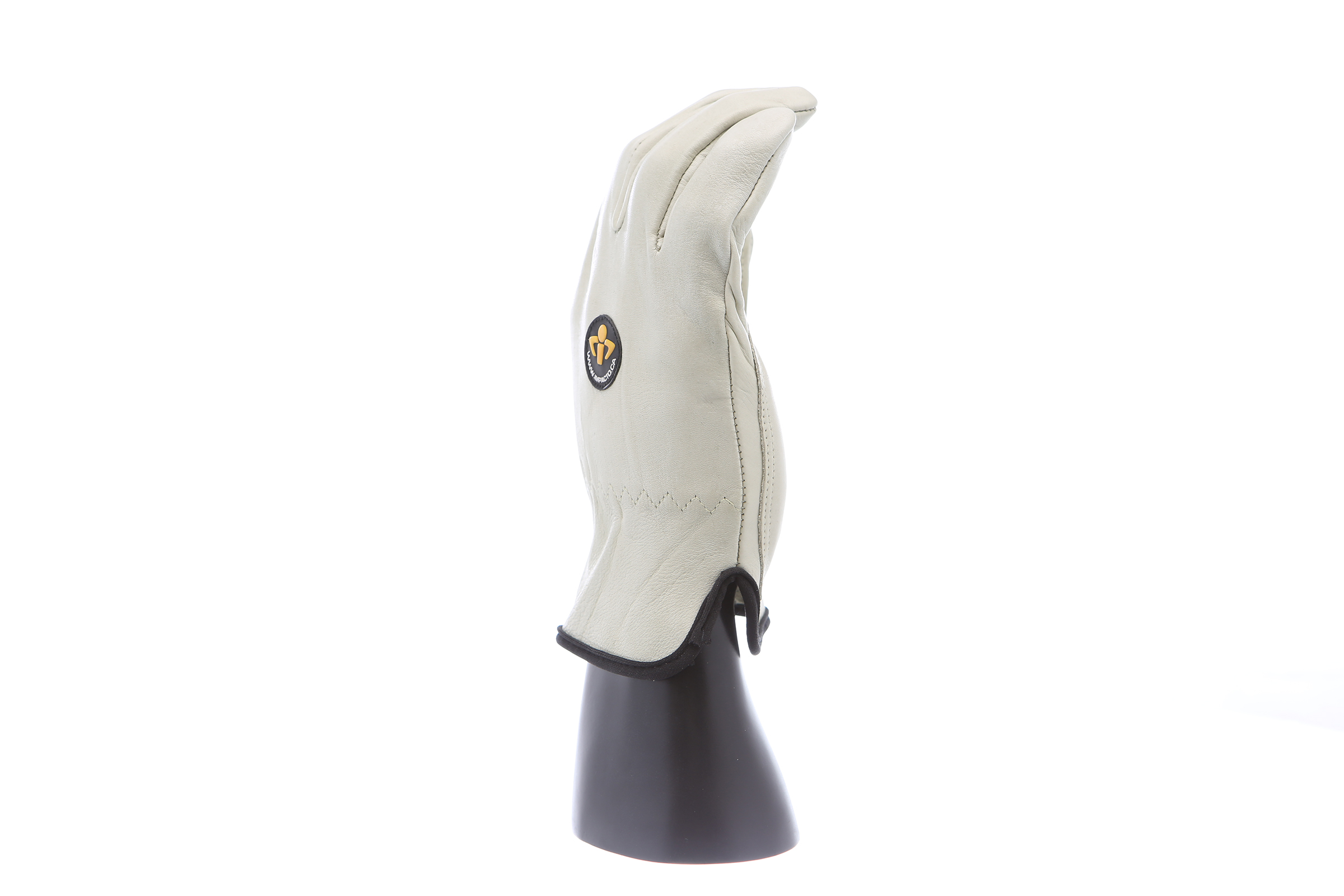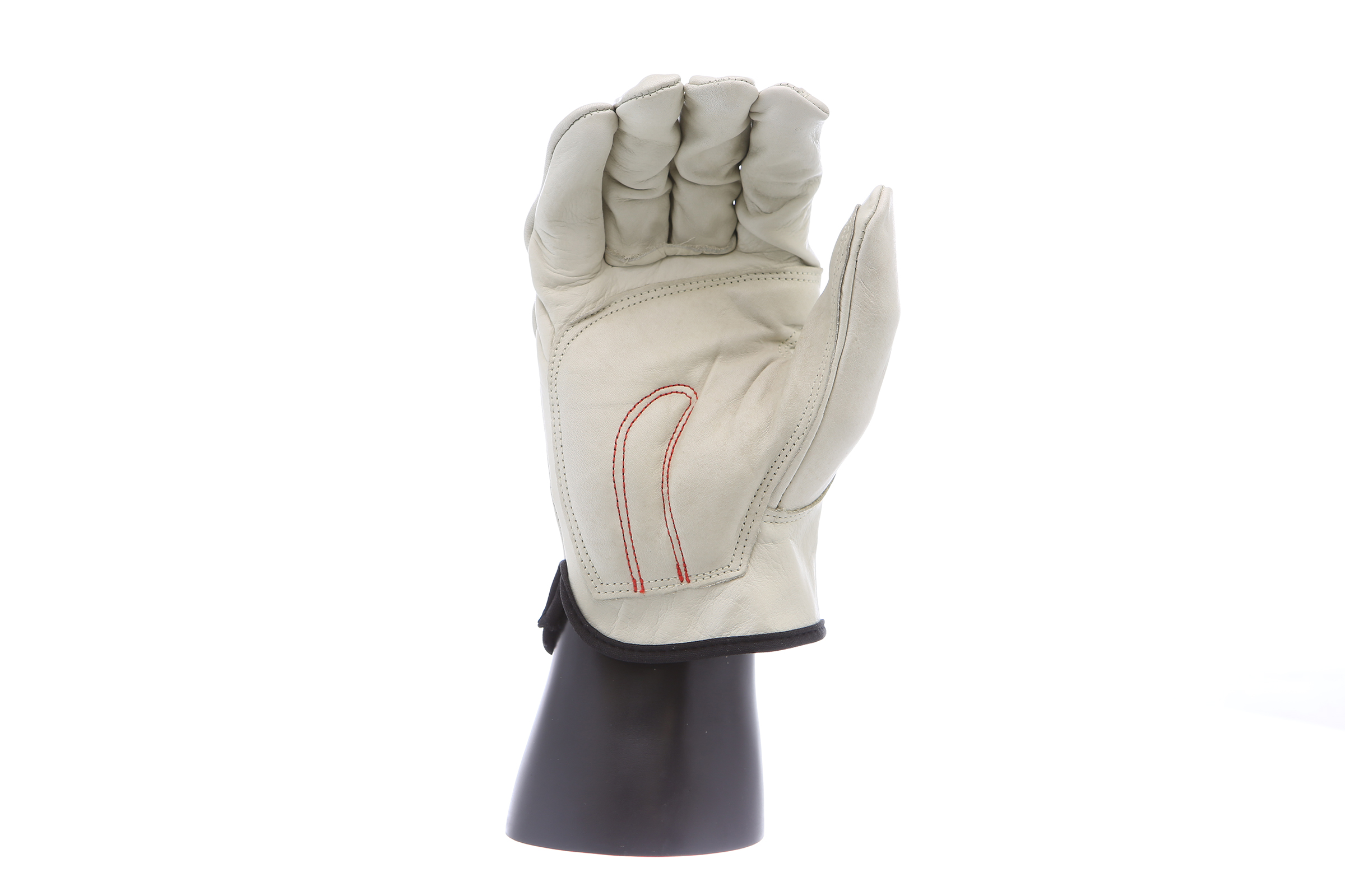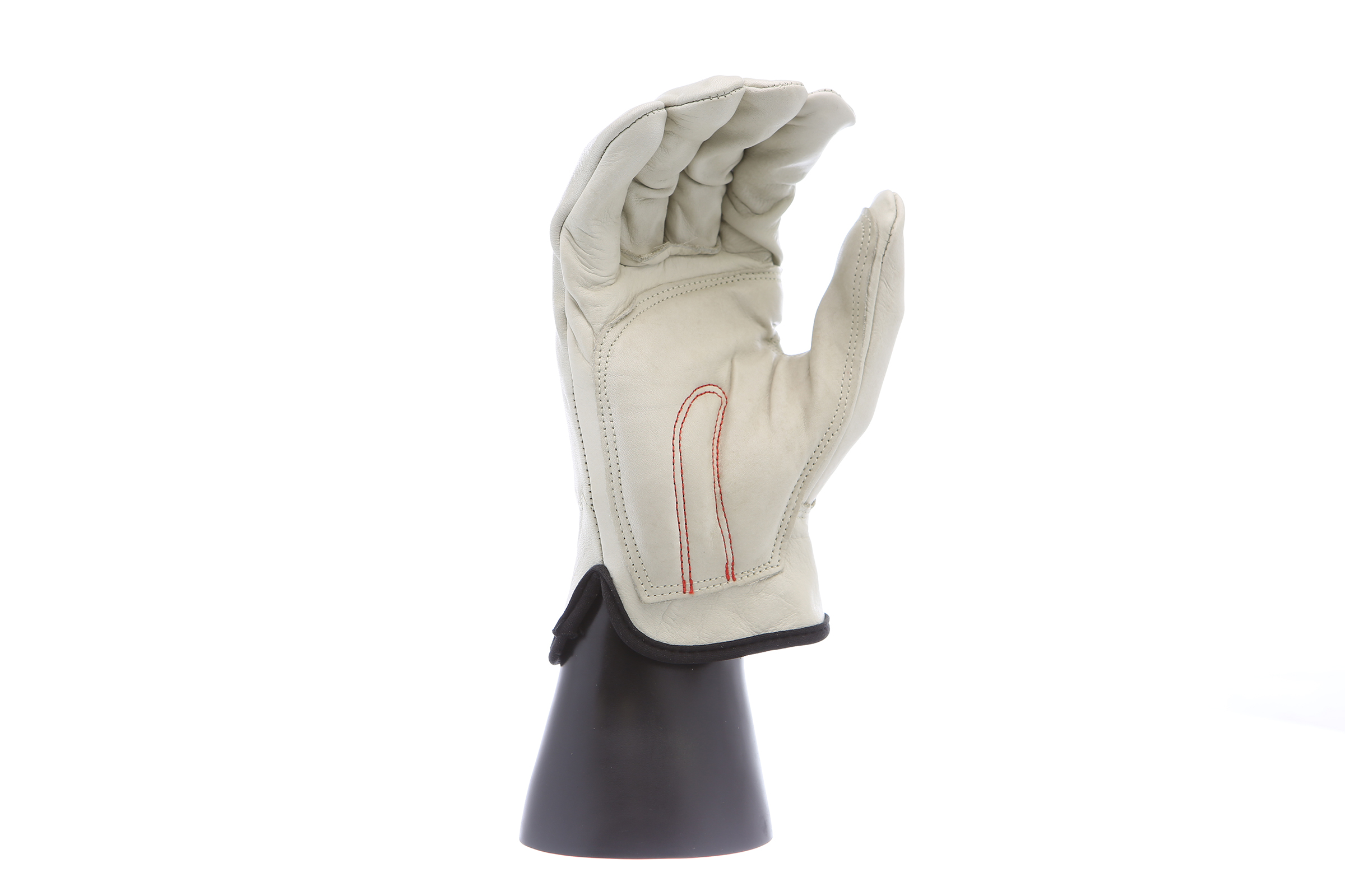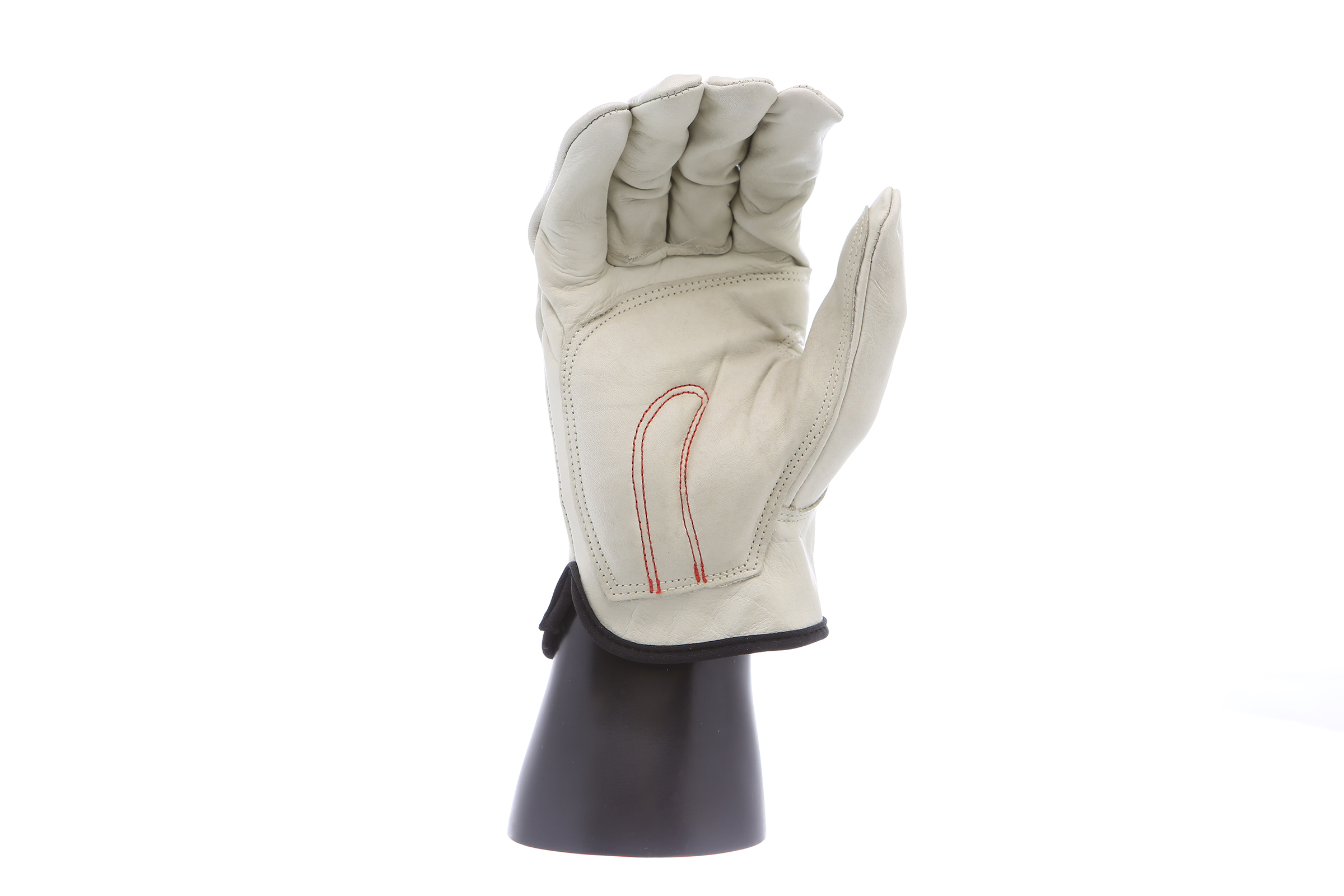 Cowhide leather glove with unique channel over the carpal tunnel keeps pressure off the median nerve. VEP palm pad protects from impact.