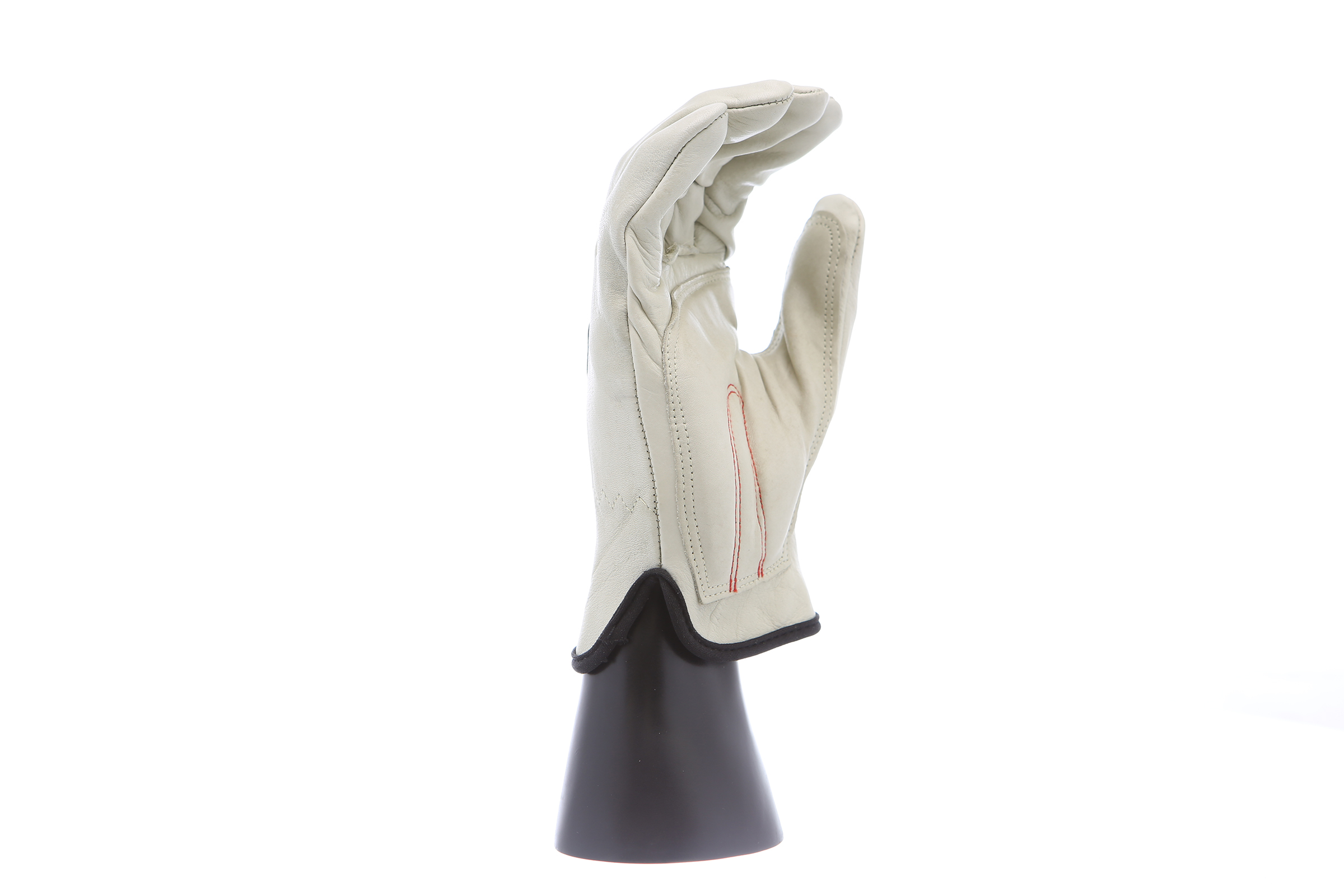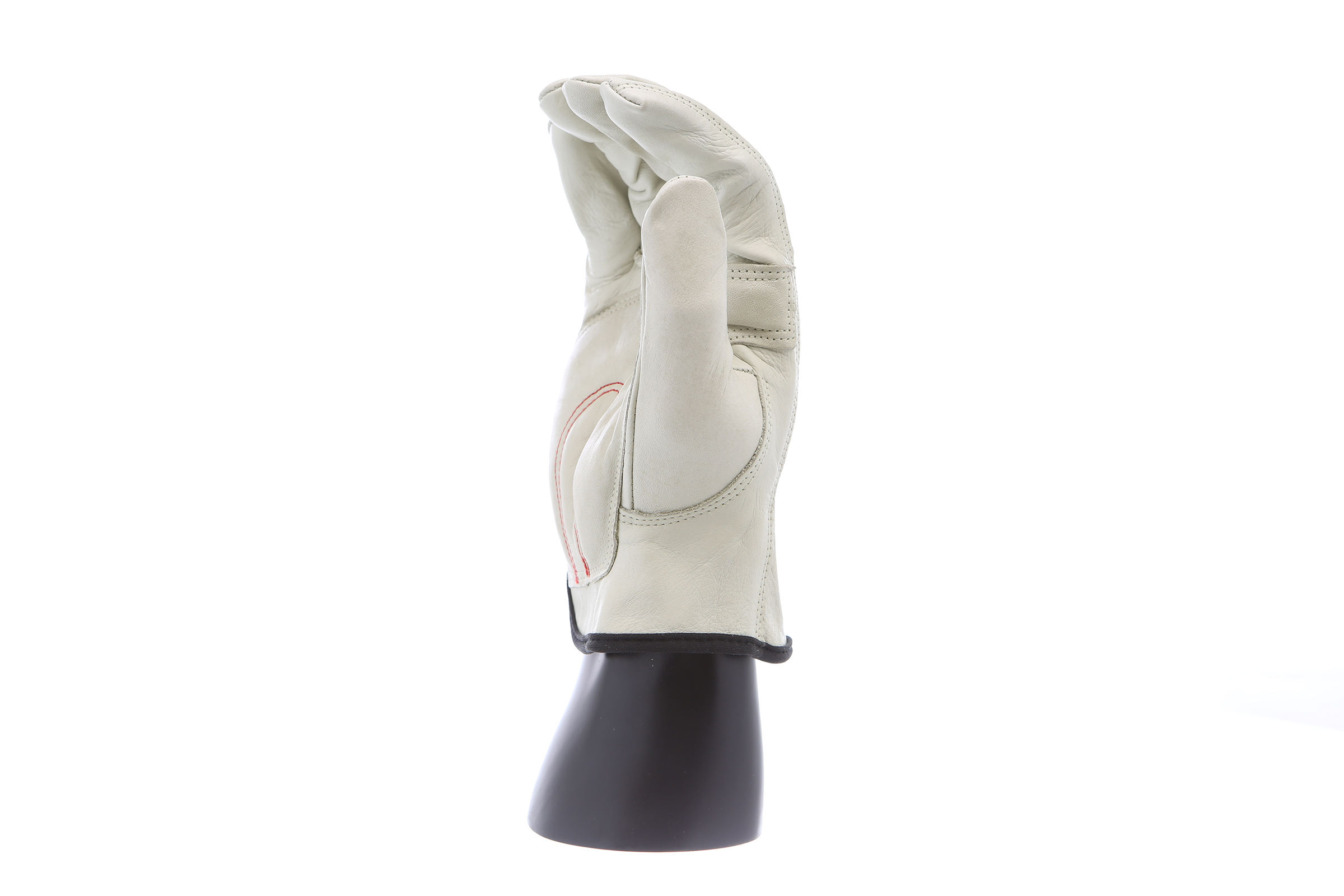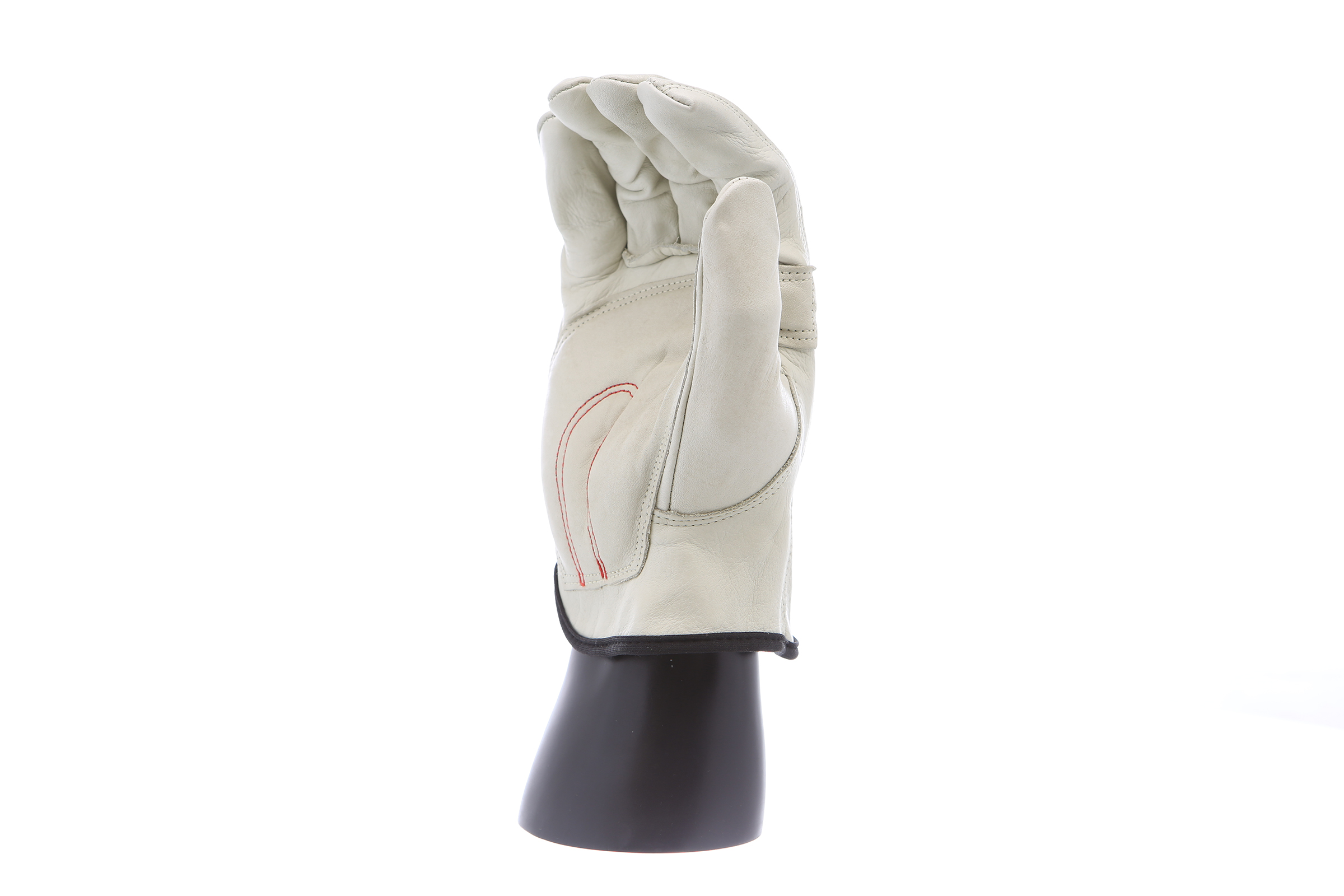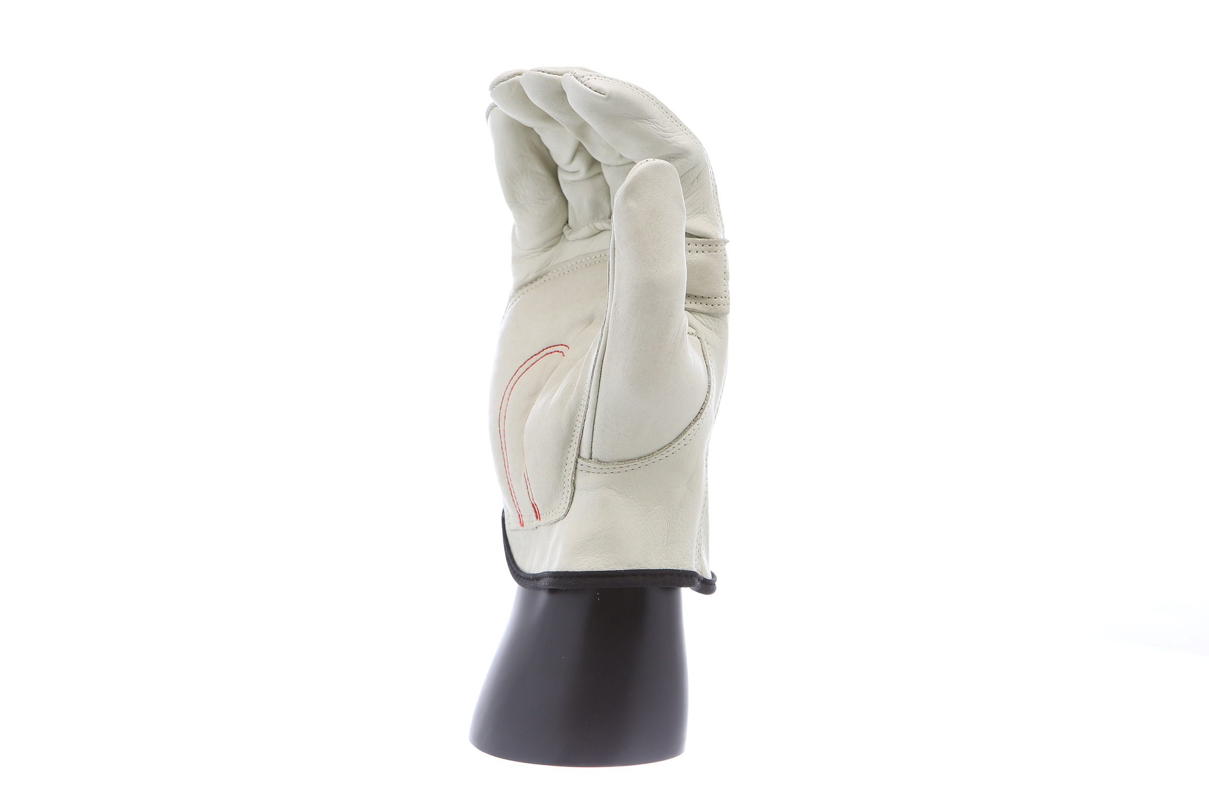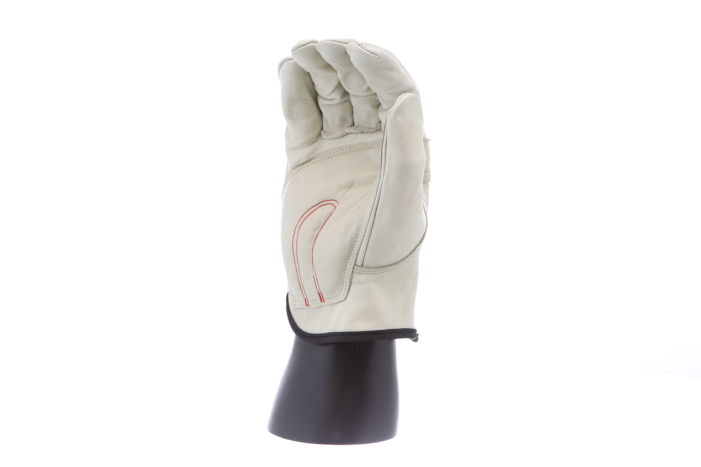 Cowhide leather glove with unique channel over the carpal tunnel keeps pressure off the median nerve. VEP palm pad protects from impact.