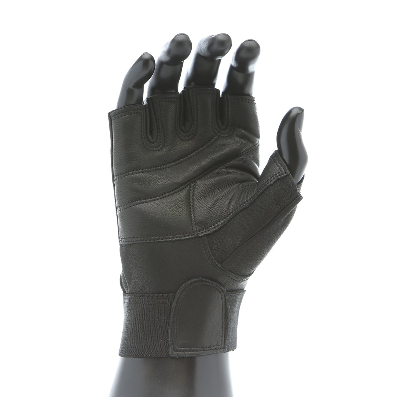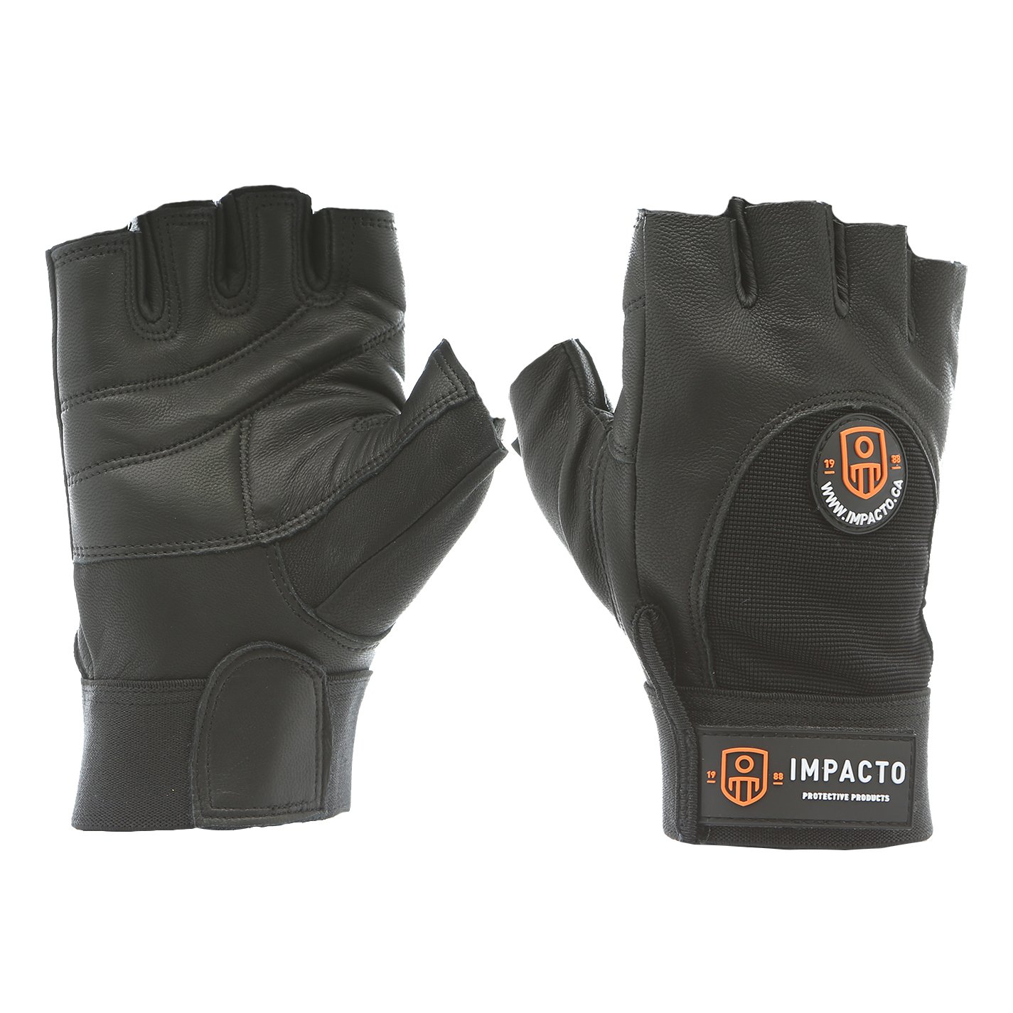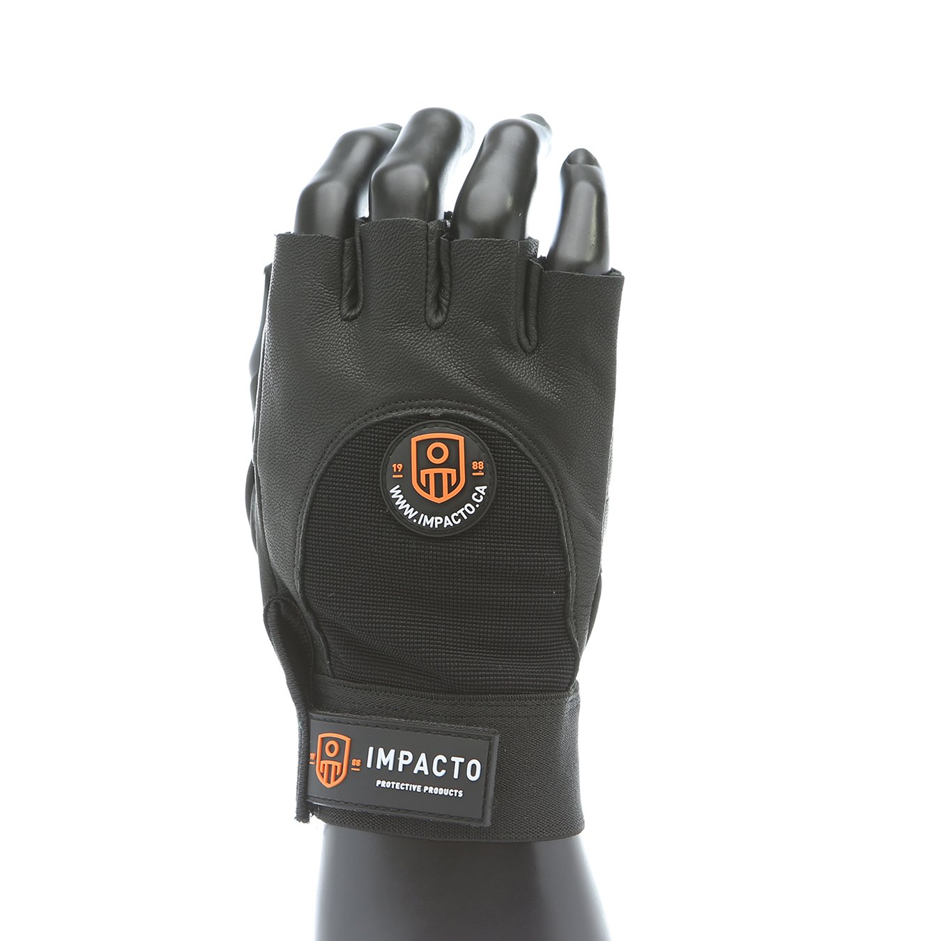 IMPACTO half finger leather work glove. Black leather palm. Gel padding in the palm and index finger. Wrist tab with hook and loop closure.