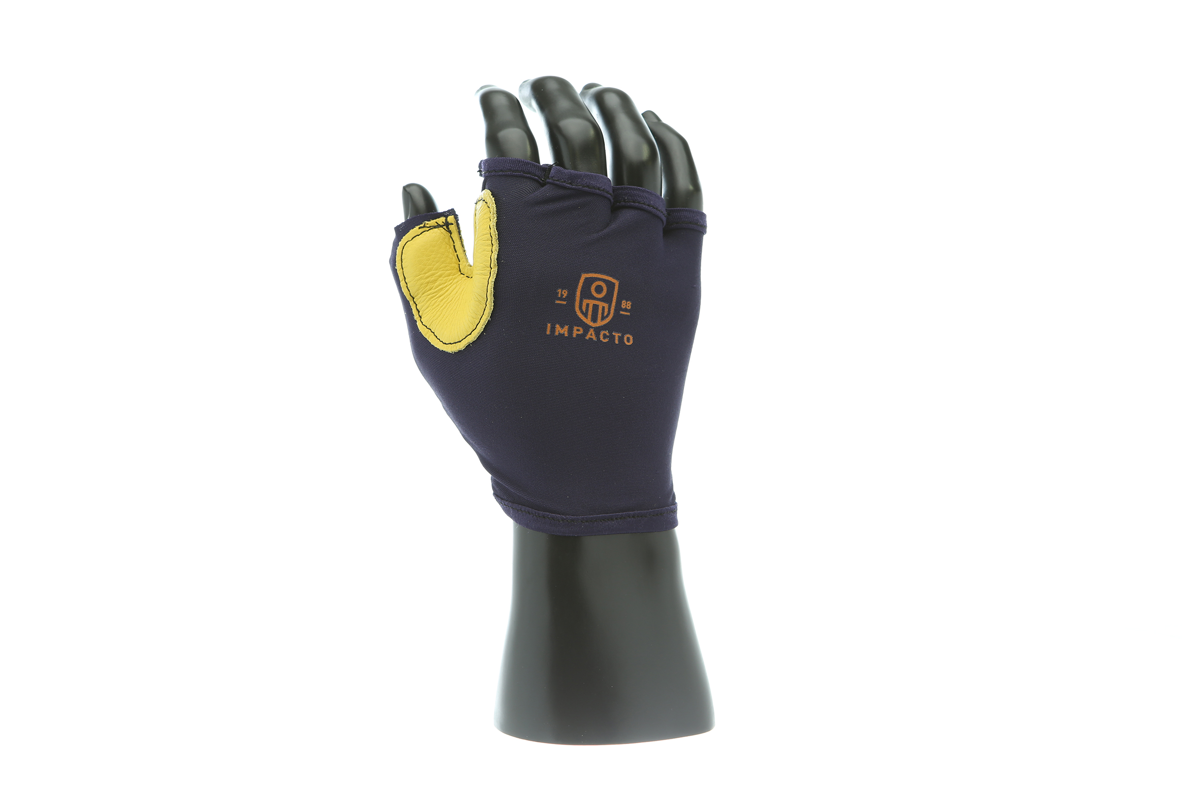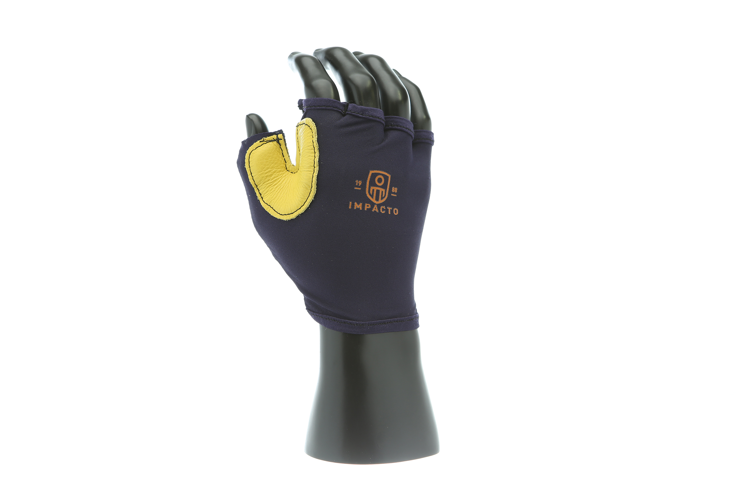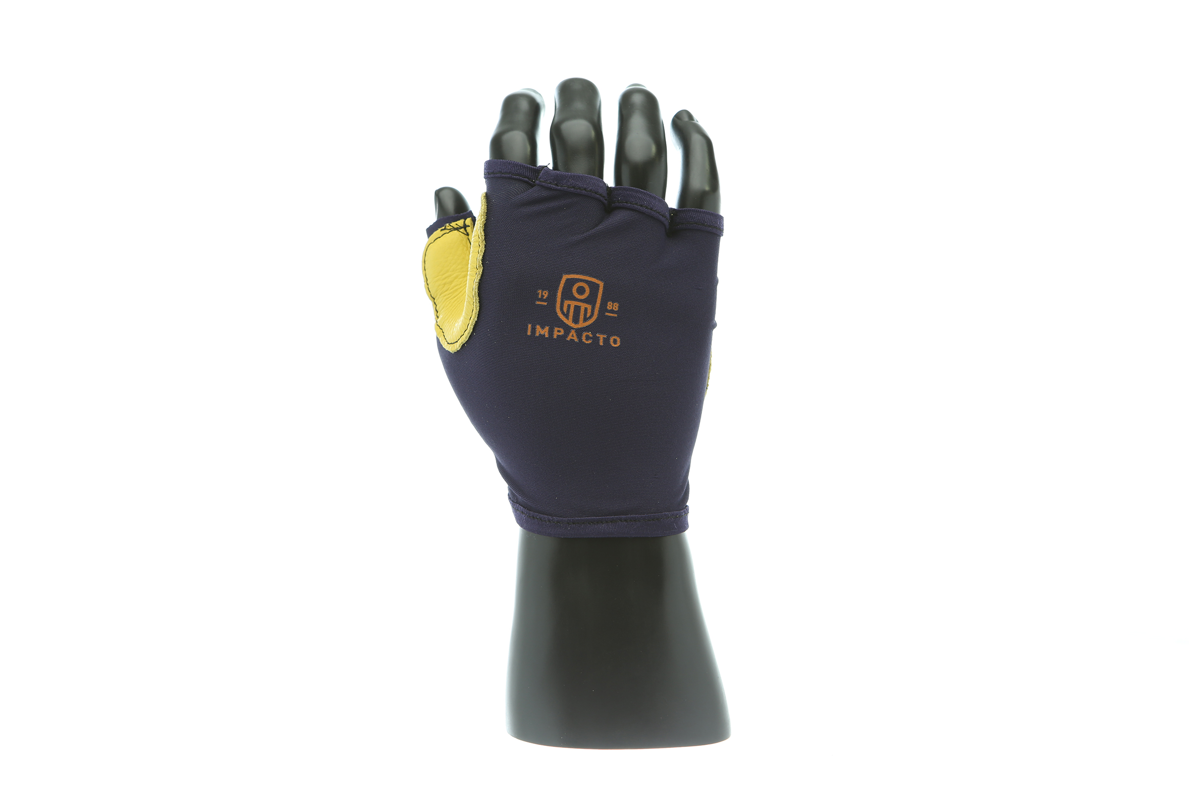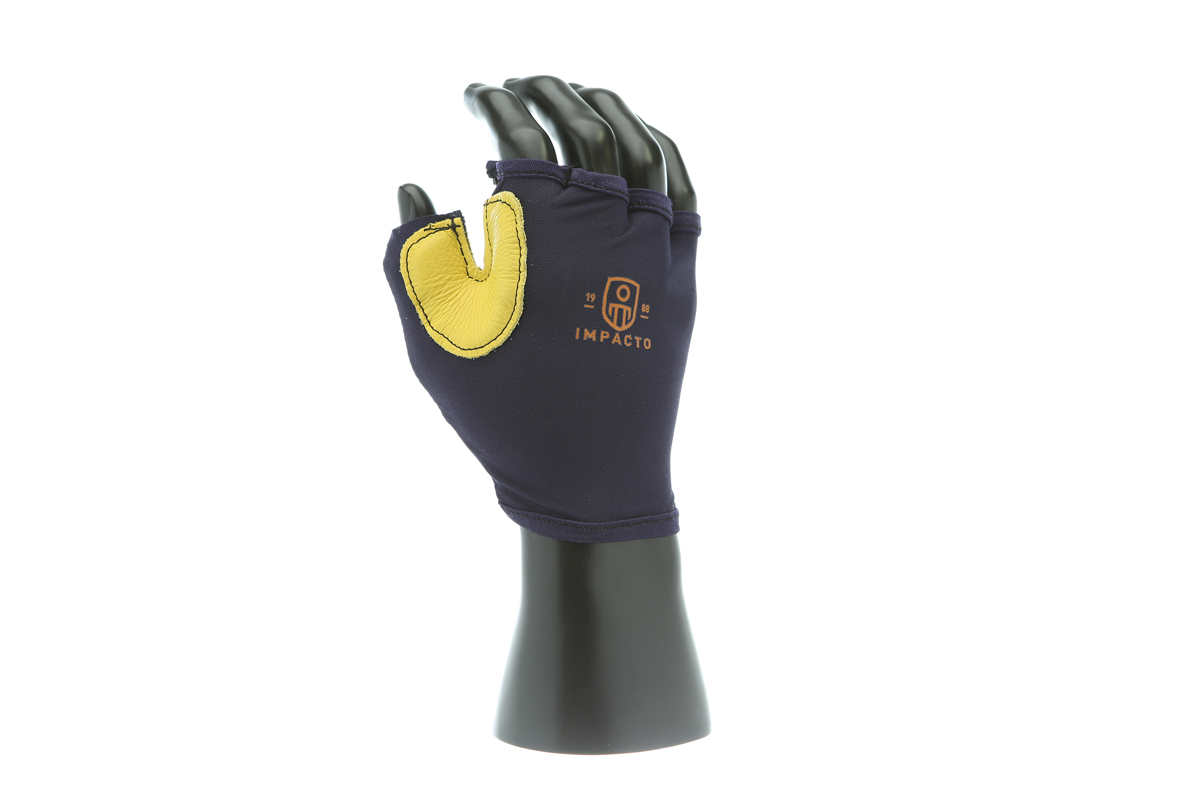 IMPACTO Fingerless glove with stretchy nylon back. Durable grain leather palm cover protects from abrasion. Impact and shock absorbing VEP padding in the palm and between the thumb and index finger.