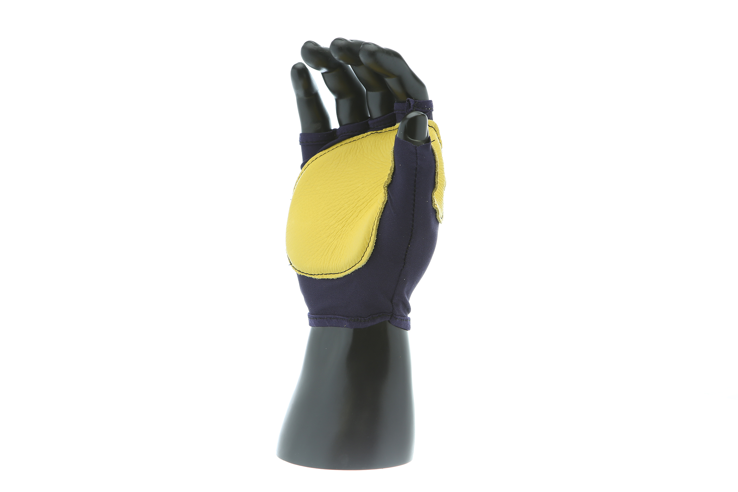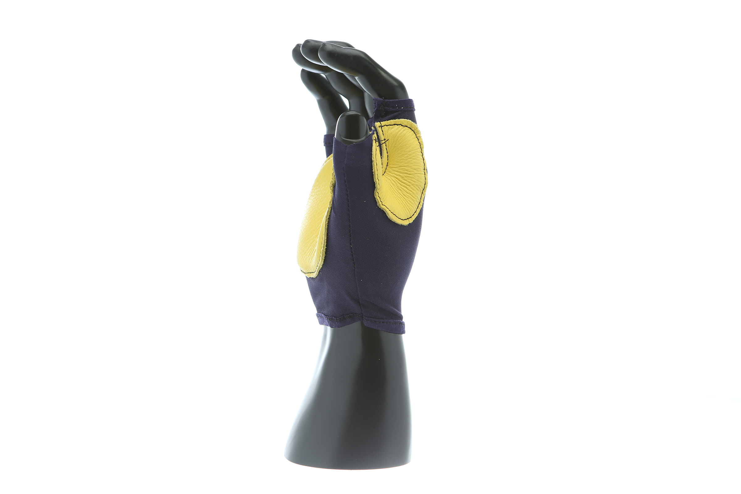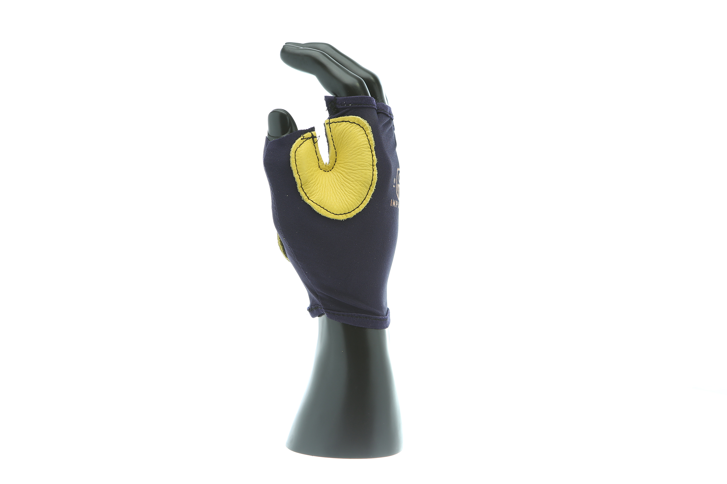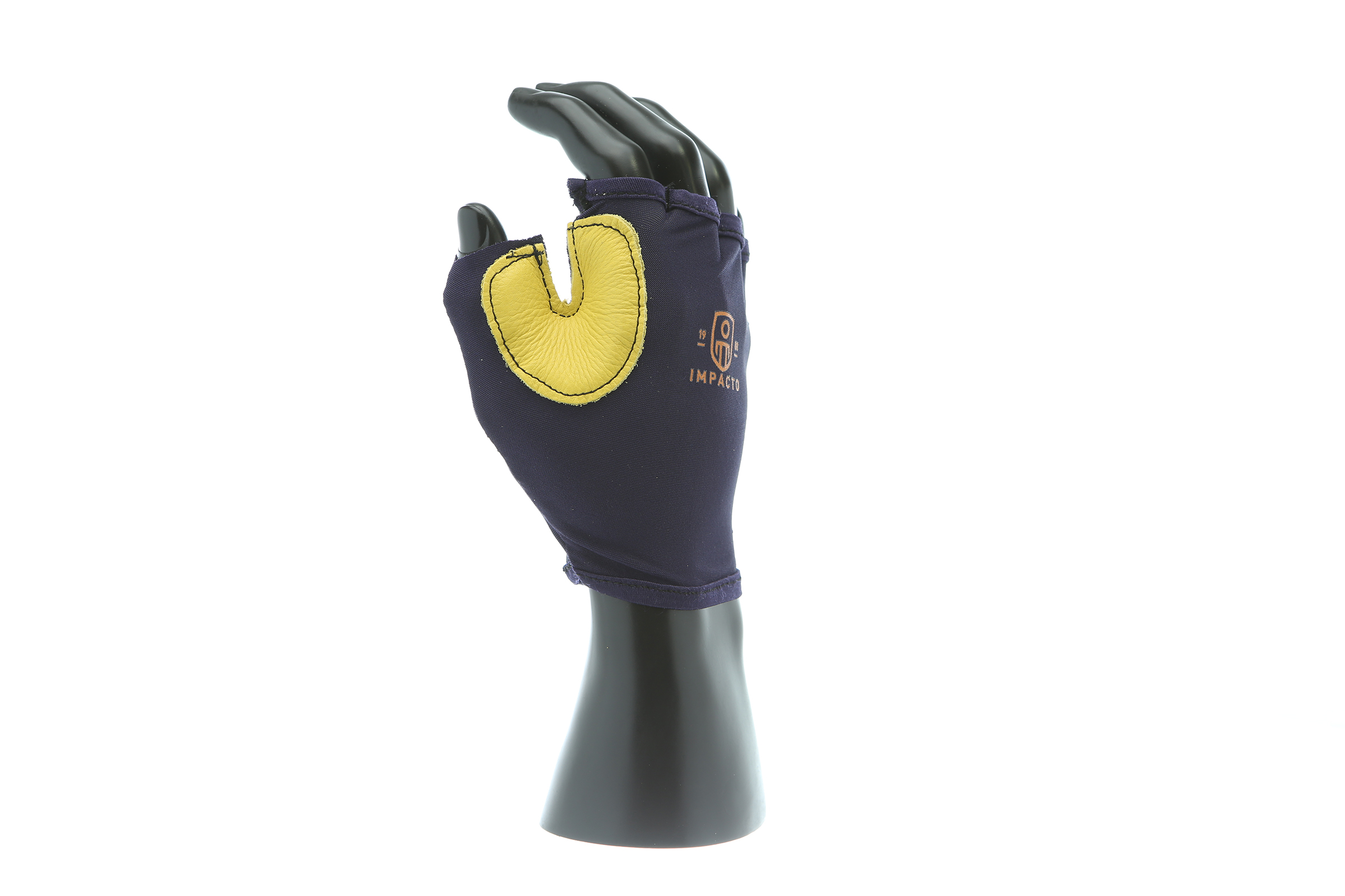 IMPACTO Fingerless glove with stretchy nylon back. Durable grain leather palm cover protects from abrasion. Impact and shock absorbing VEP padding in the palm and between the thumb and index finger.