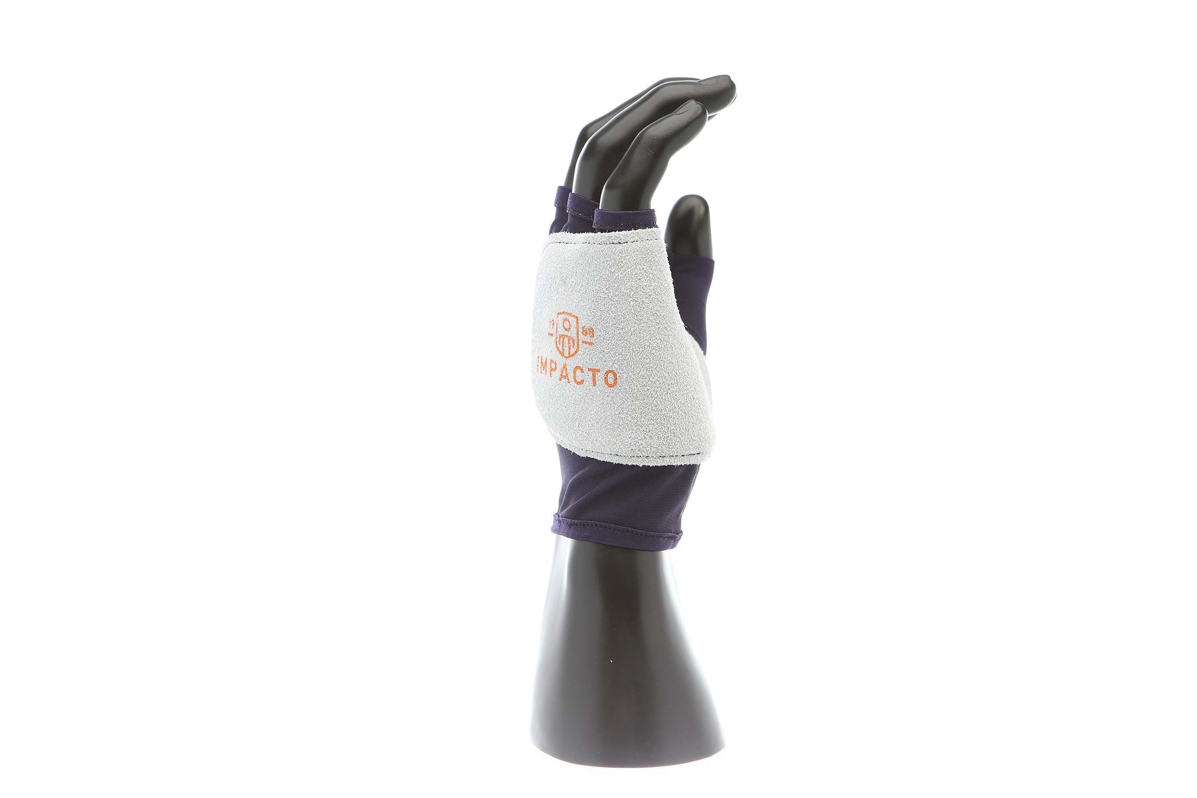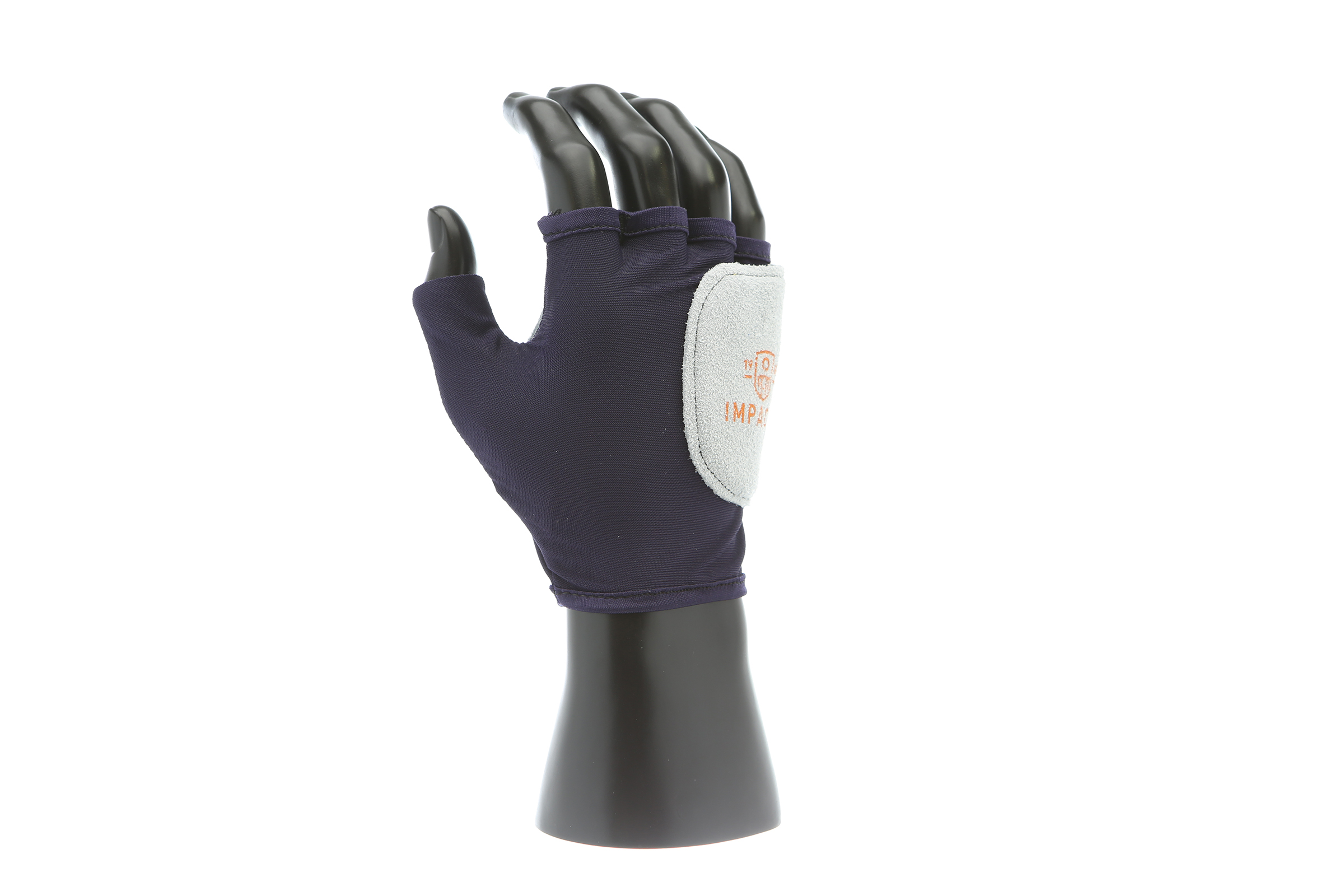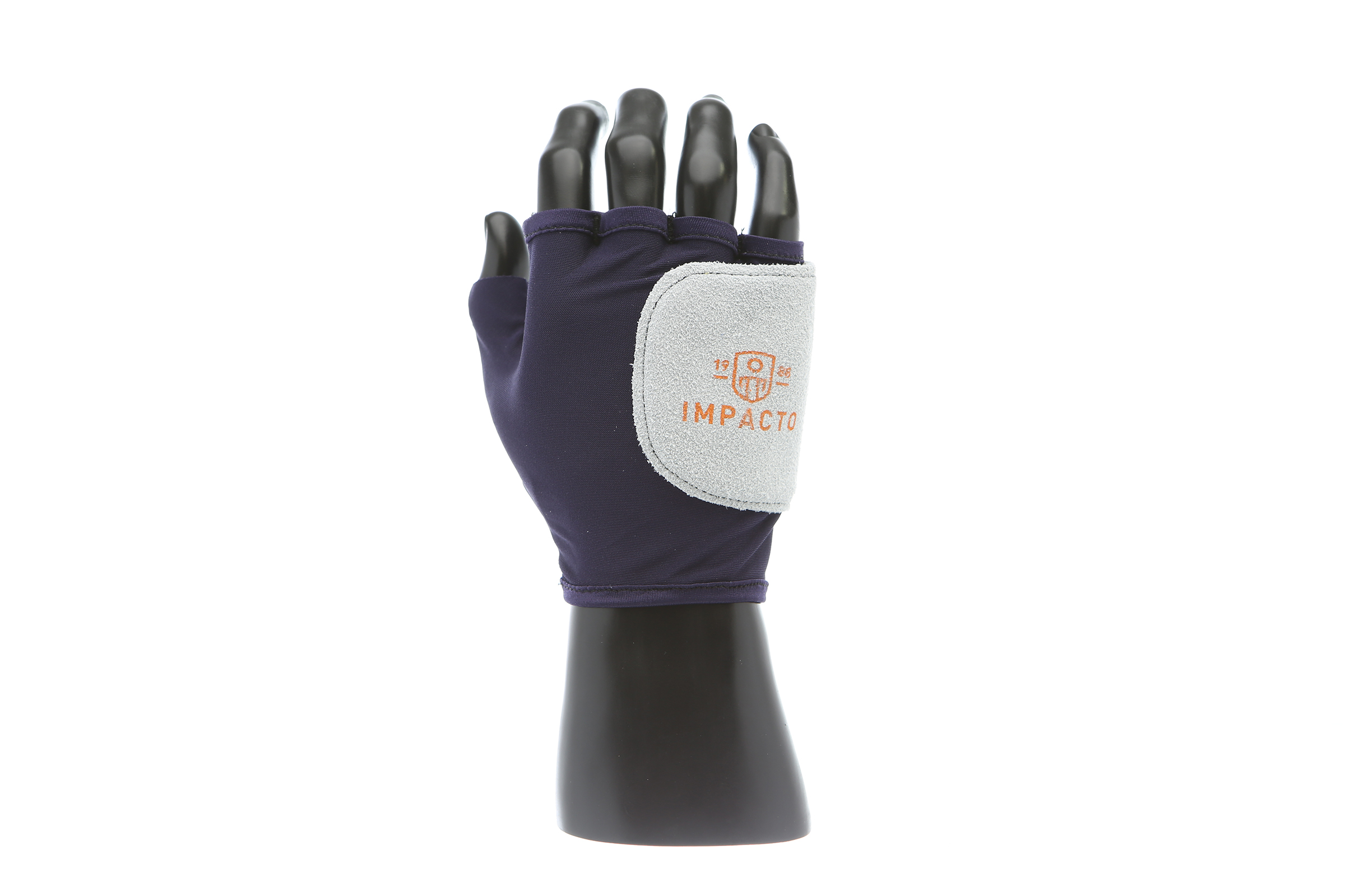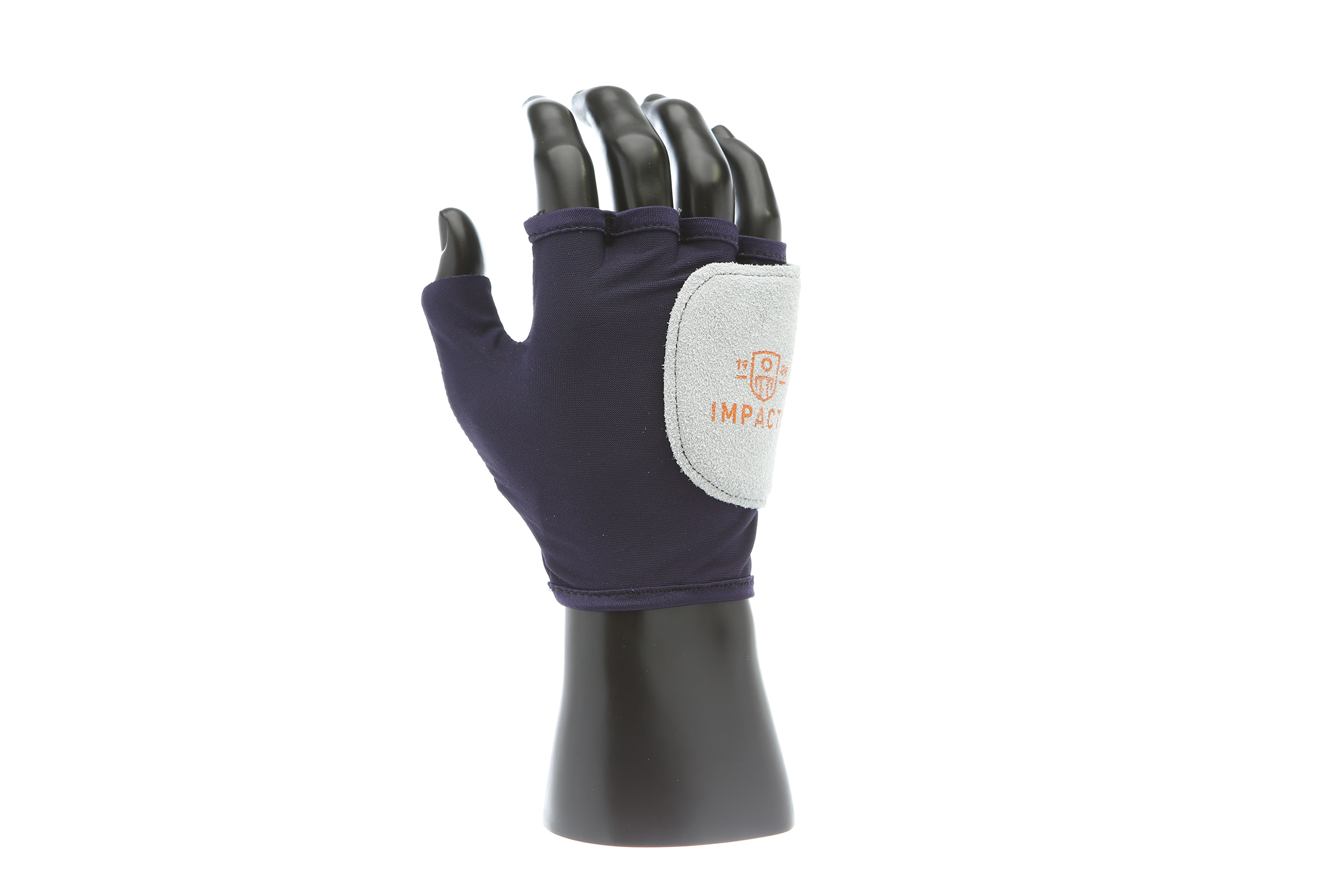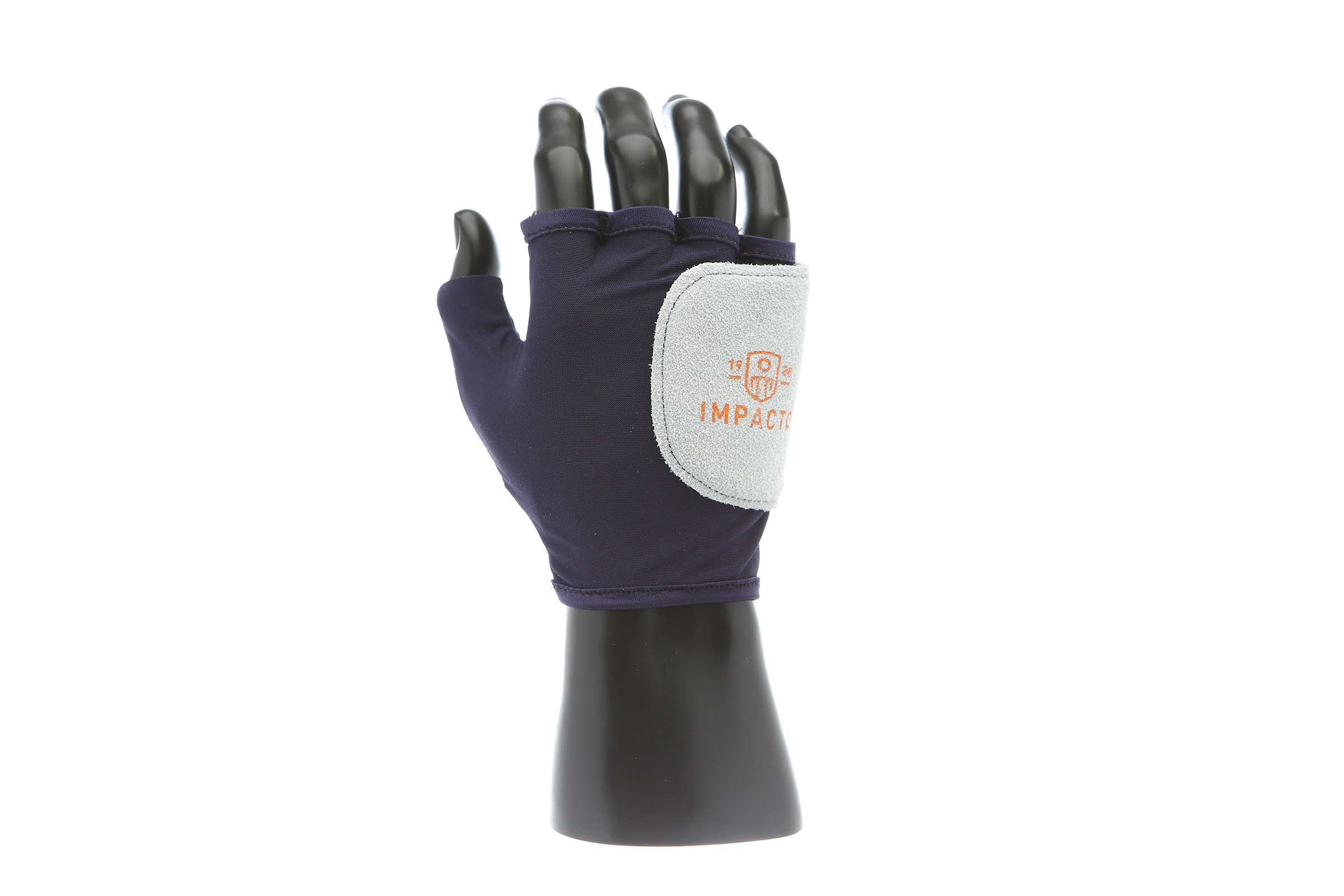 IMPACTO Fingerless nylon glove. Suede leather facing ensures abrasion protection. Impact and vibration reducing Viscolas 1/8″ padding protects the palm, edge and back of the hand.