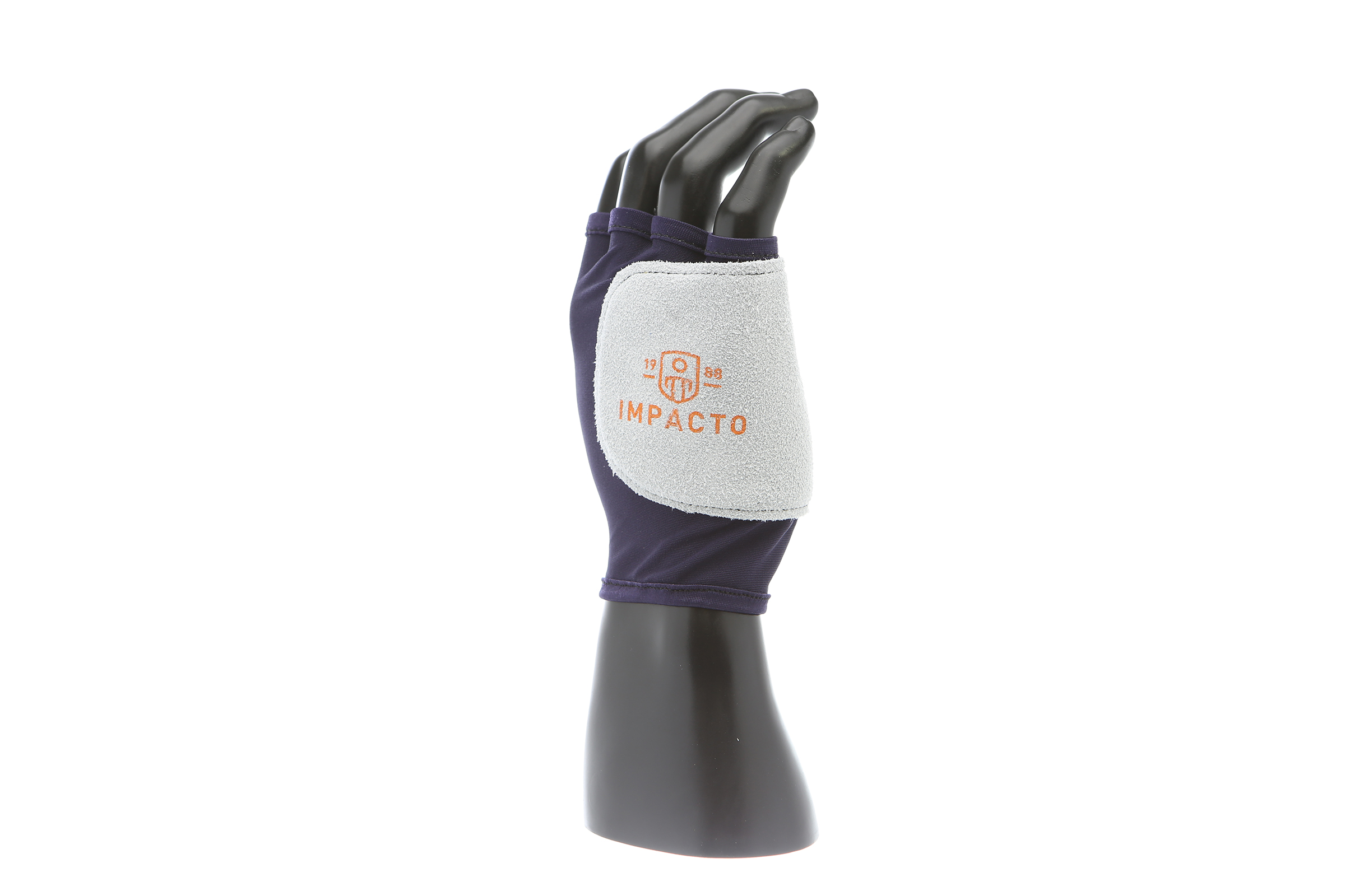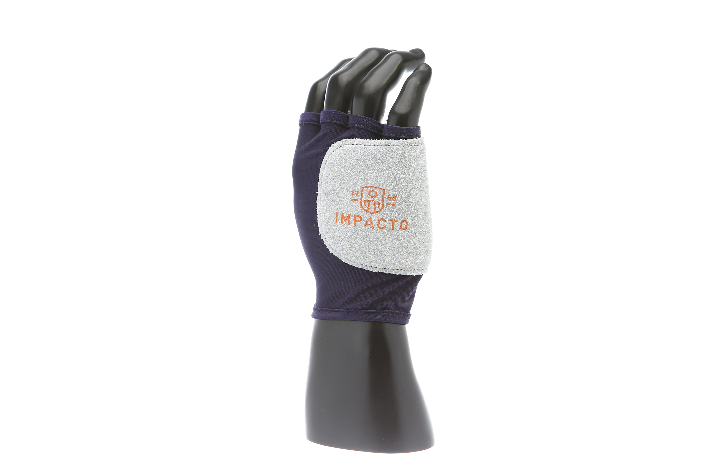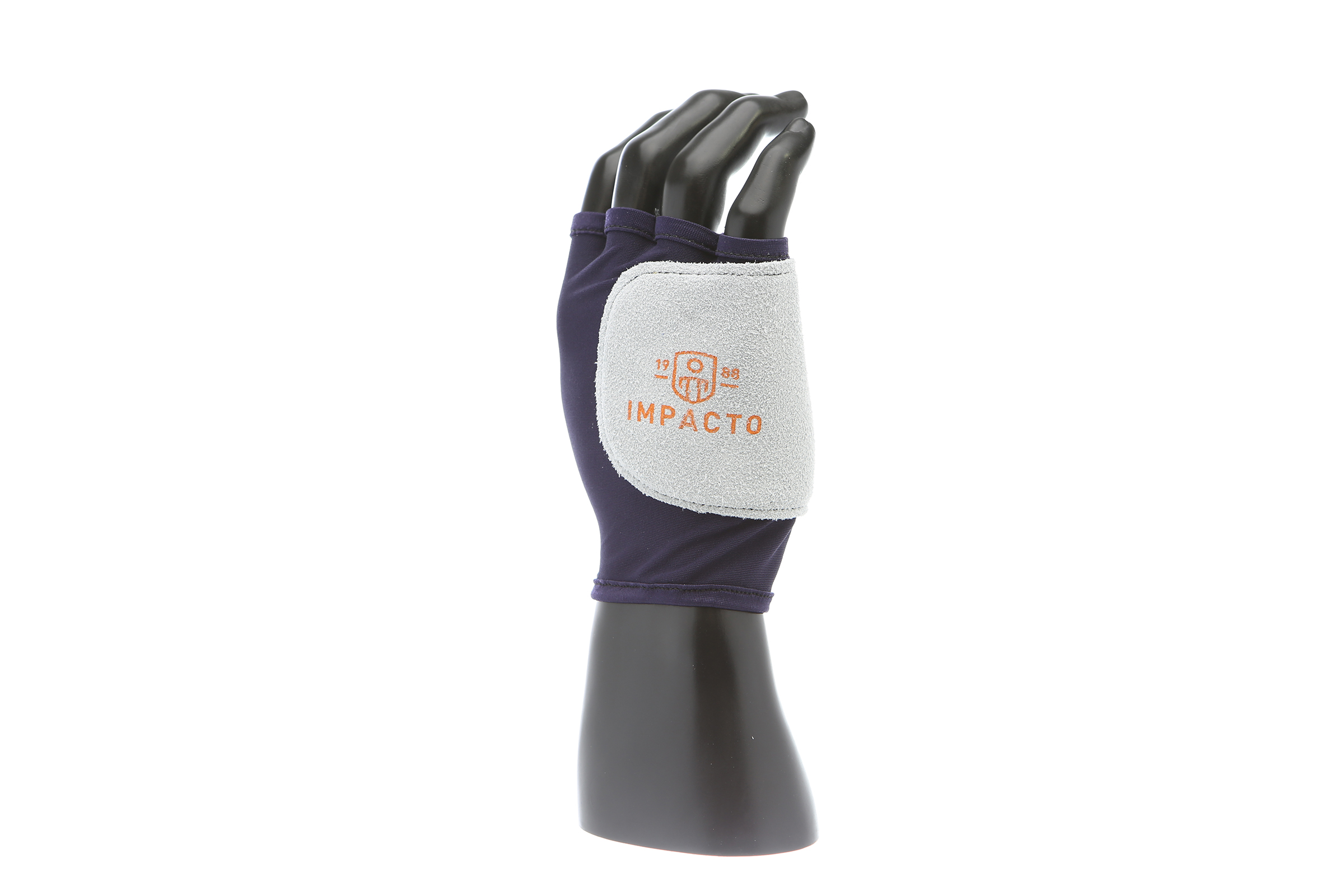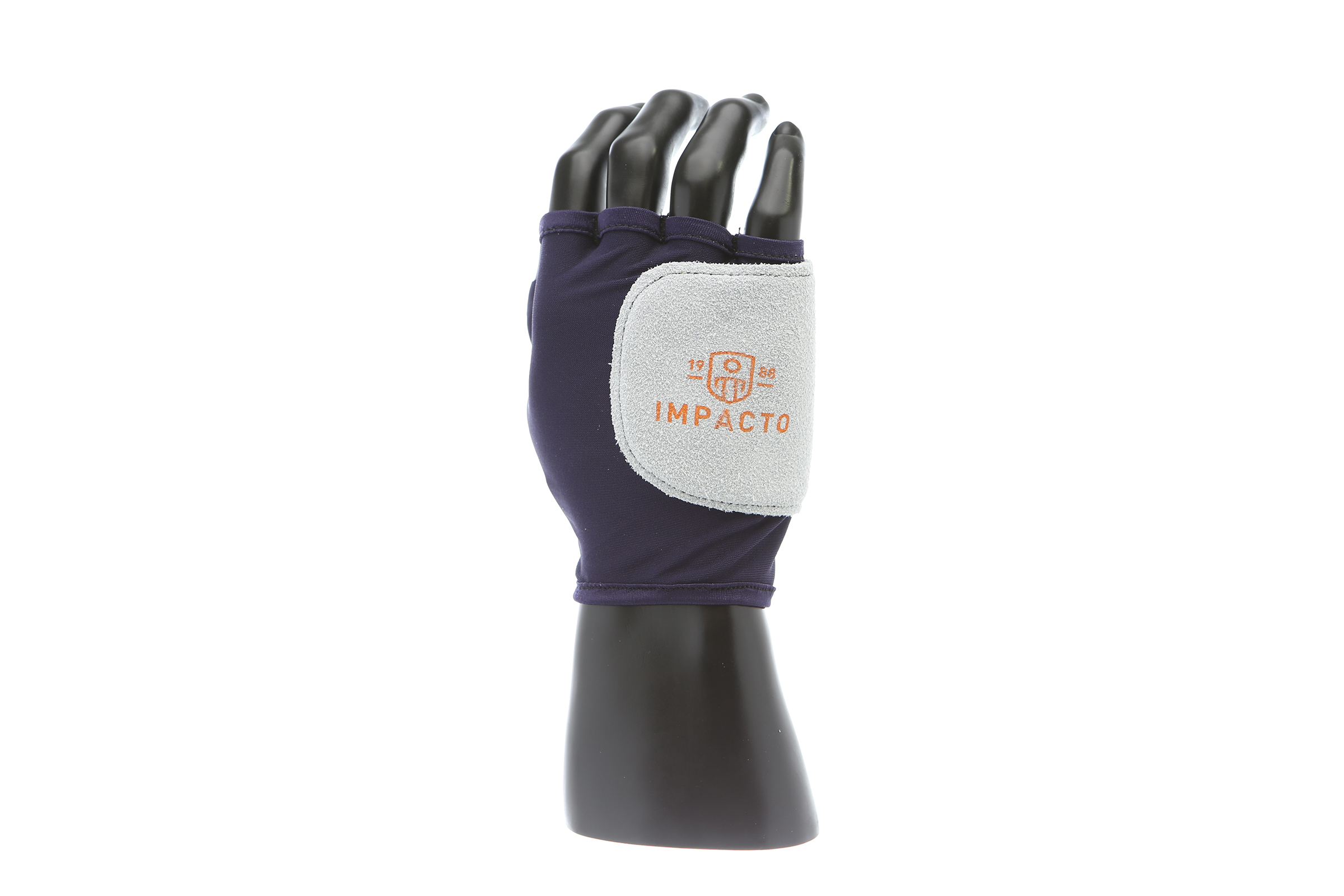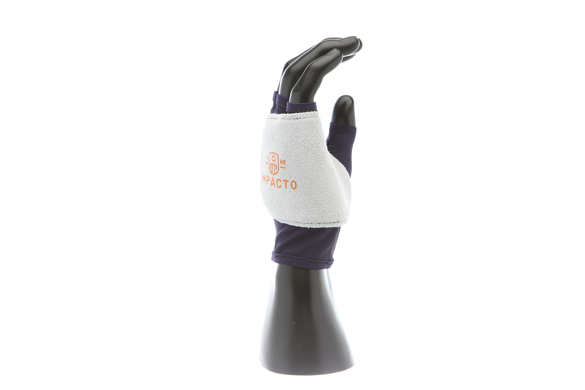 IMPACTO Fingerless nylon glove. Suede leather facing ensures abrasion protection. Impact and vibration reducing Viscolas 1/8″ padding protects the palm, edge and back of the hand.