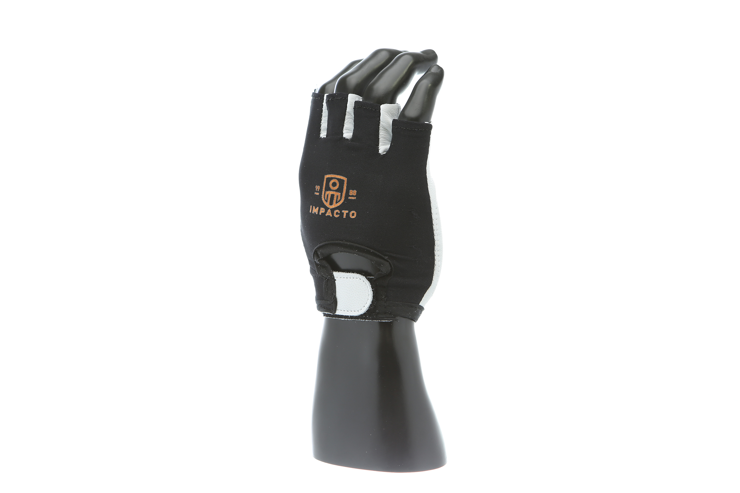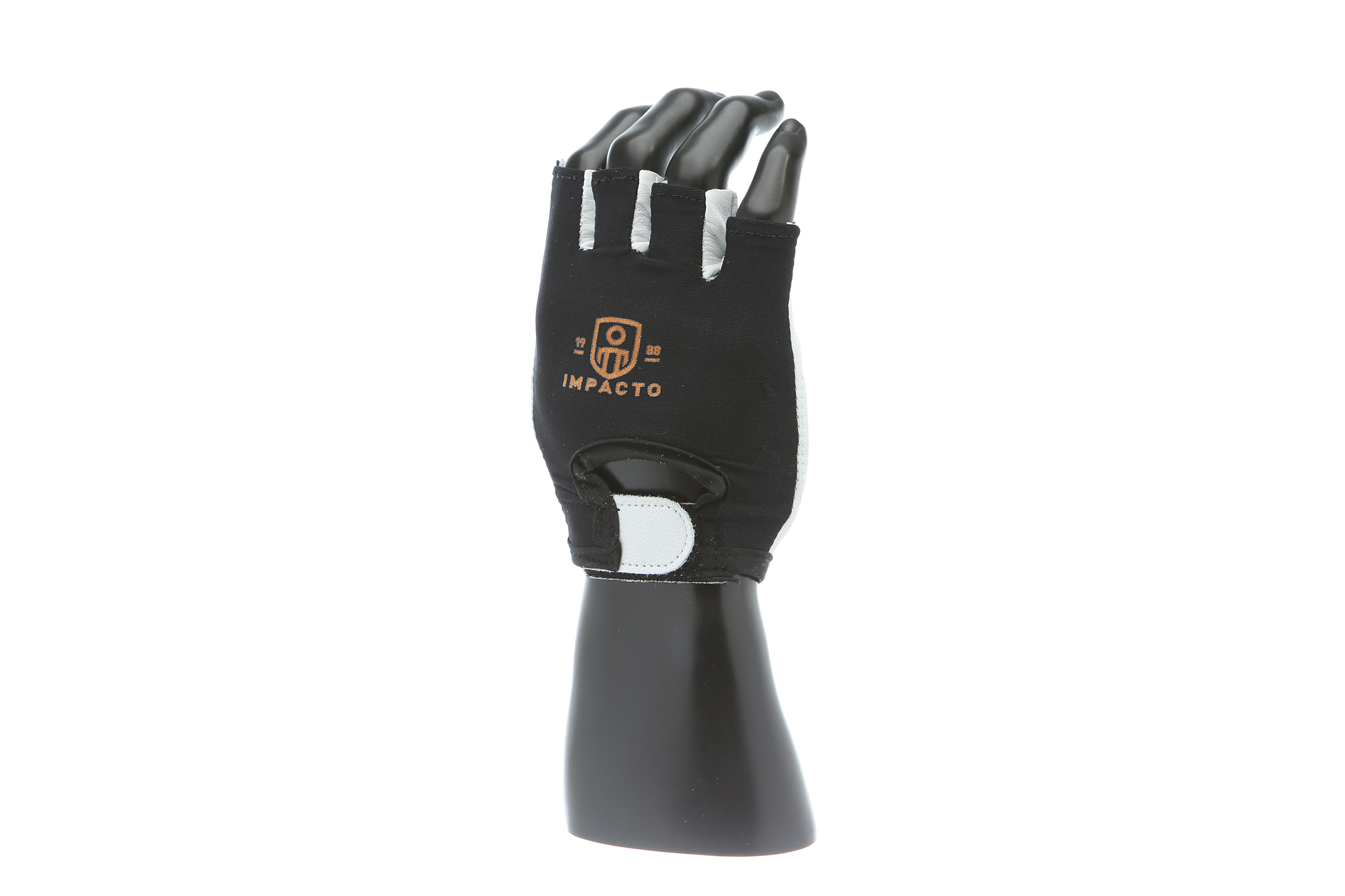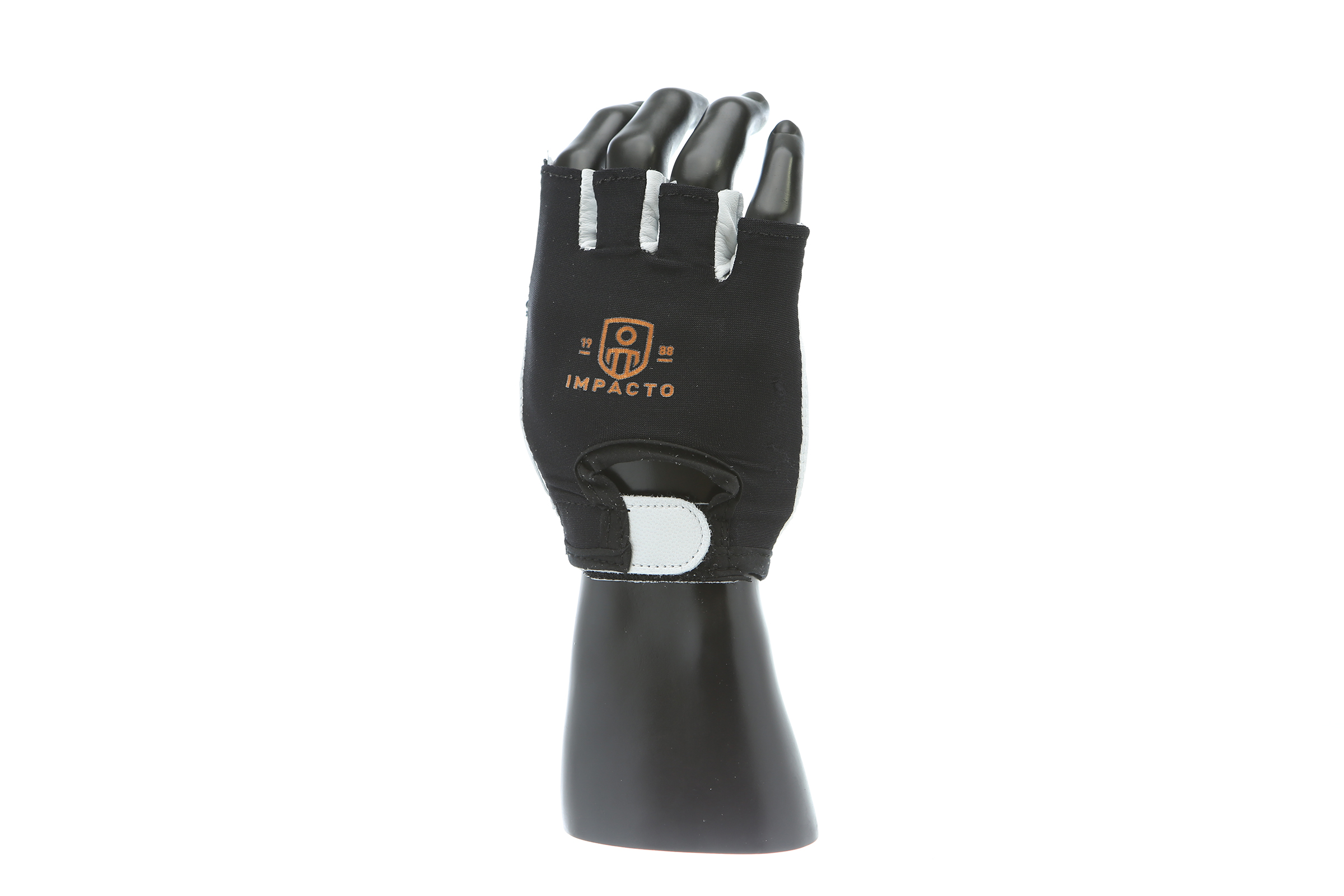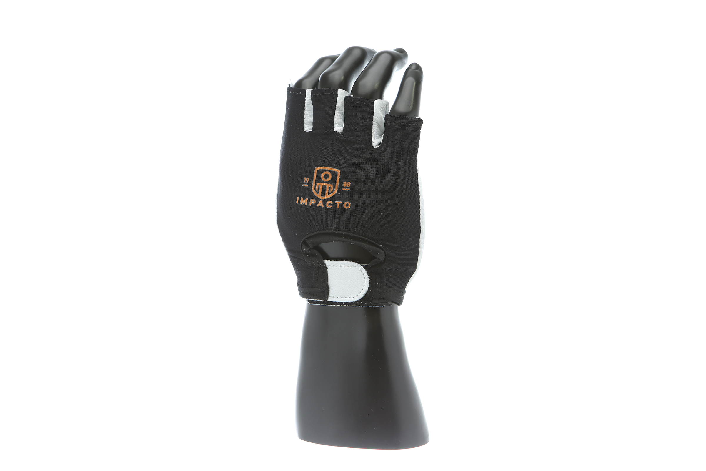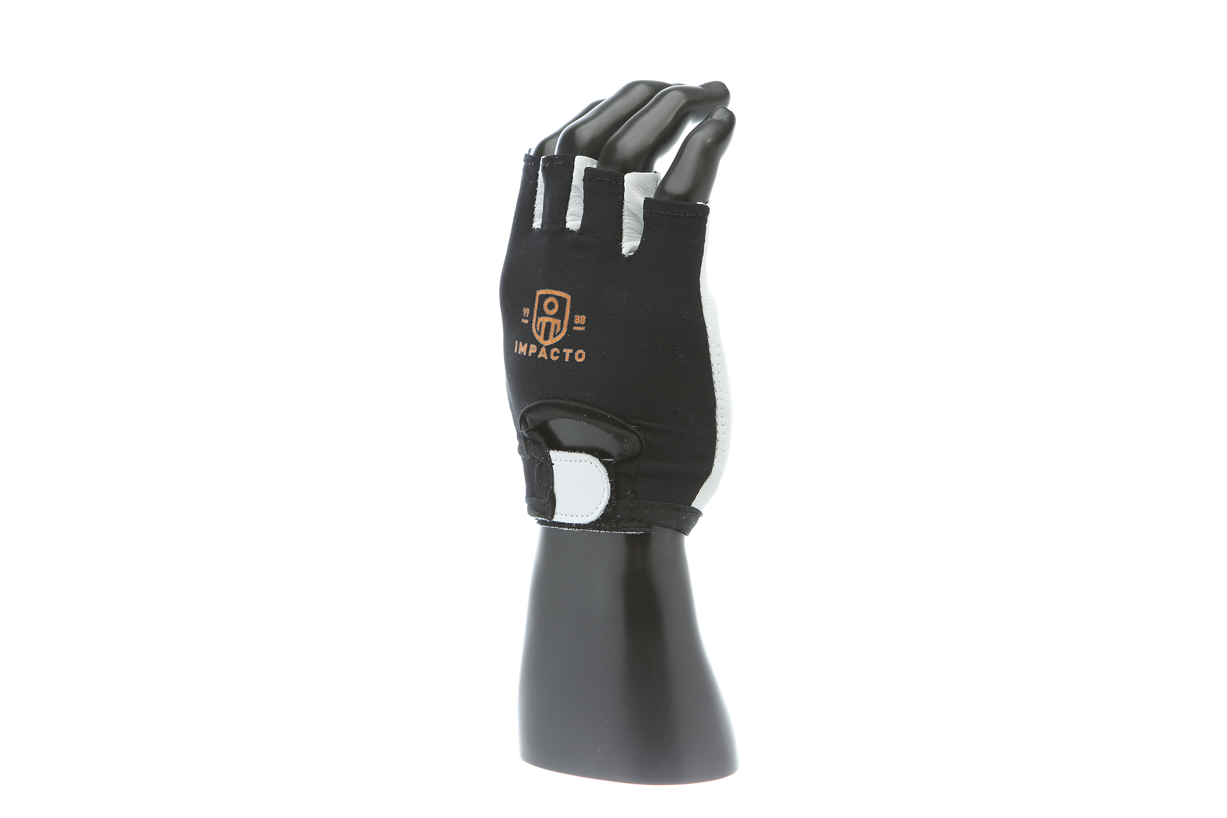 IMPACTO Anti-Impact Gloves. Half finger, nylon back with soft pearl leather palm ensure outstanding dexterity and comfort. Impact absorbing visco-elastic polymer VEP padding in the palm. Adjustable hook and loop wrist closure.