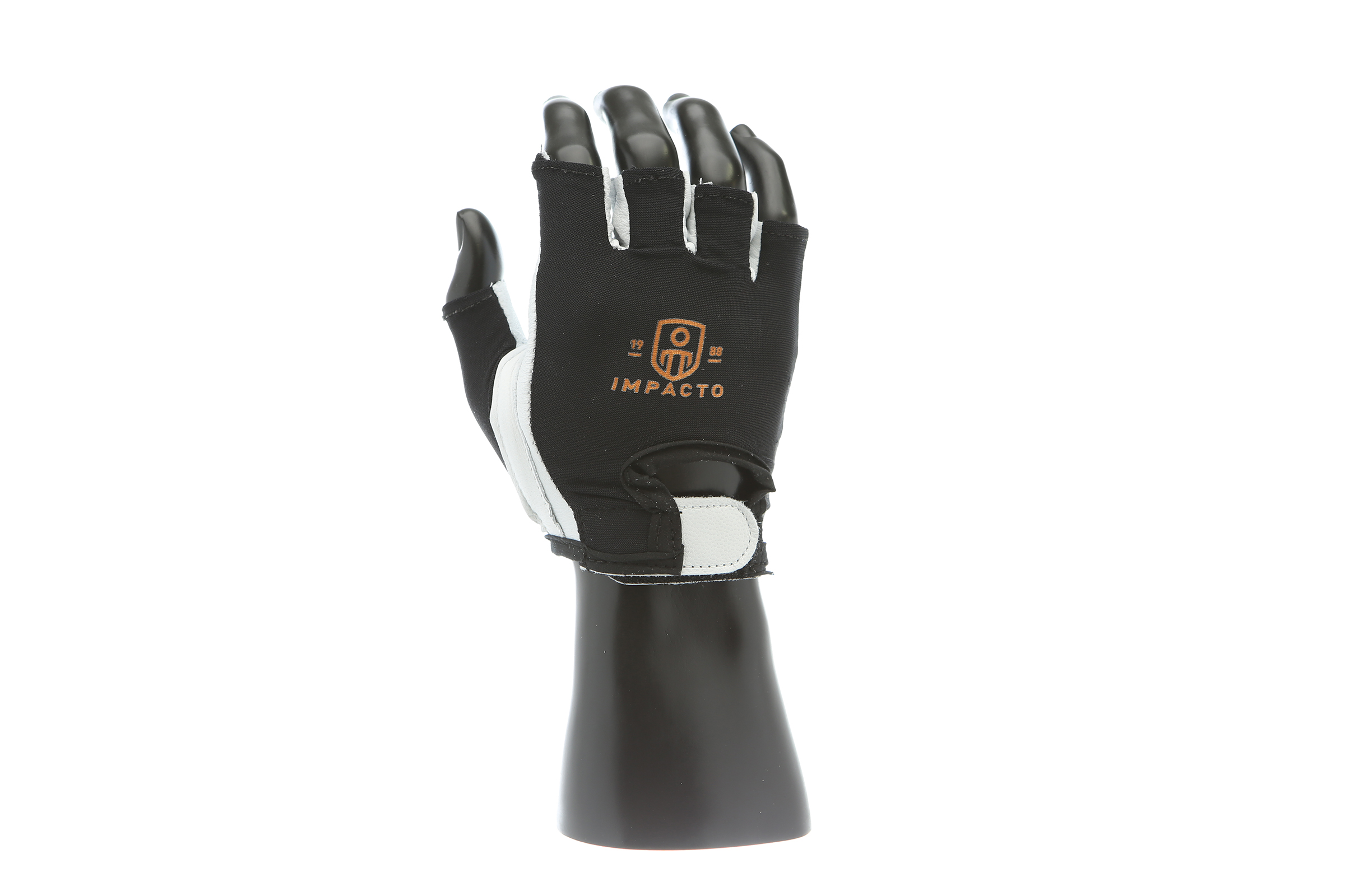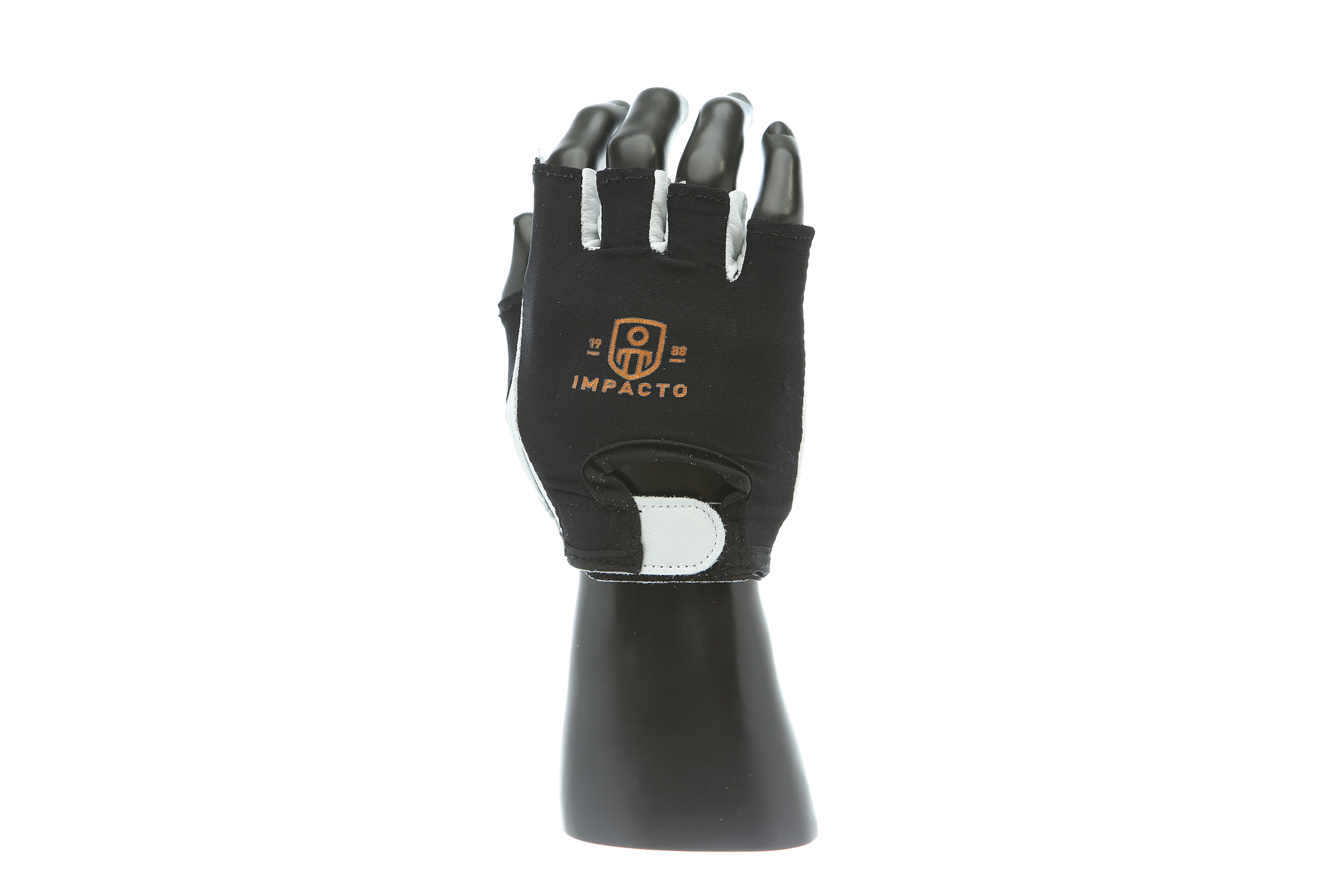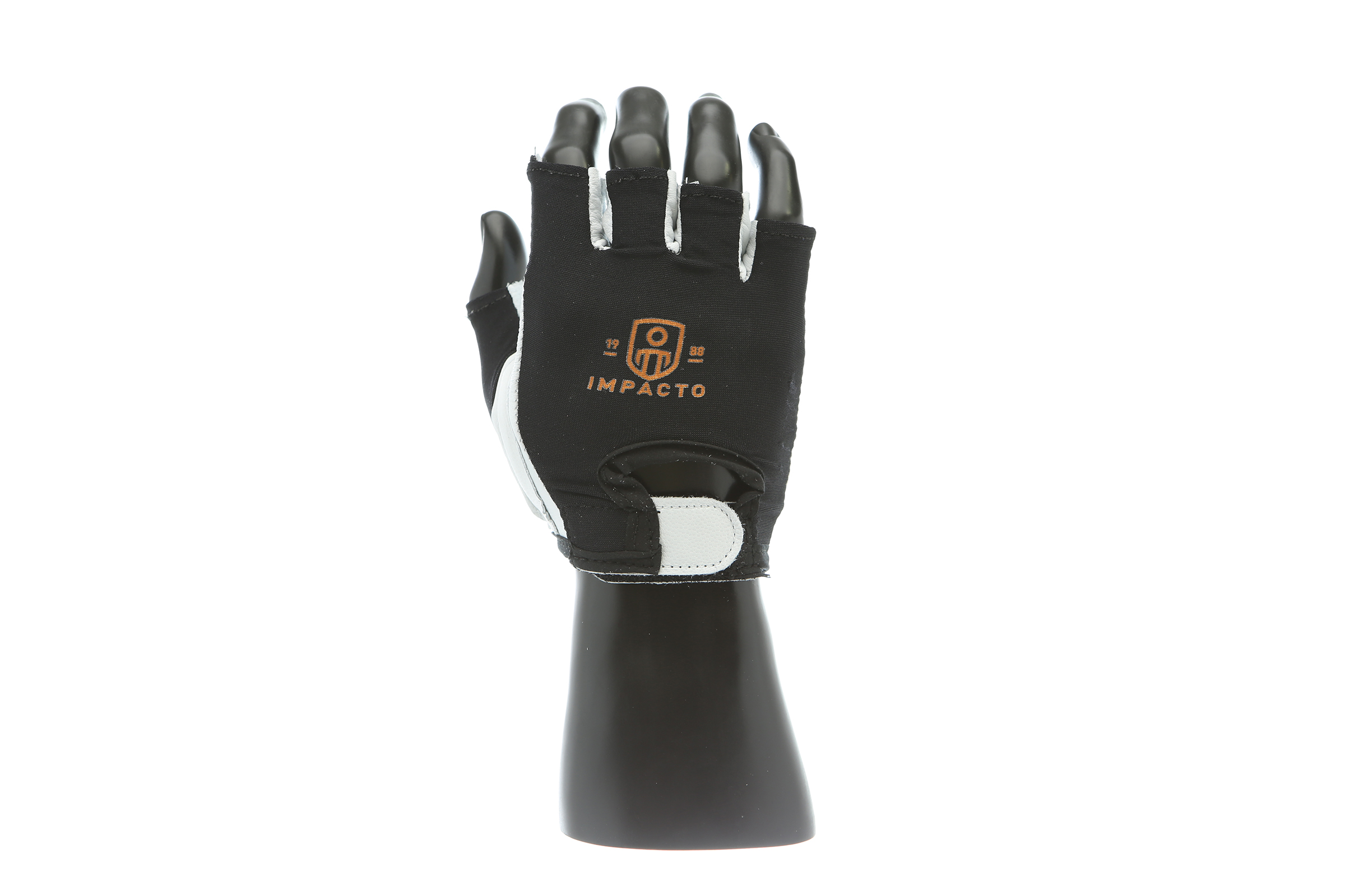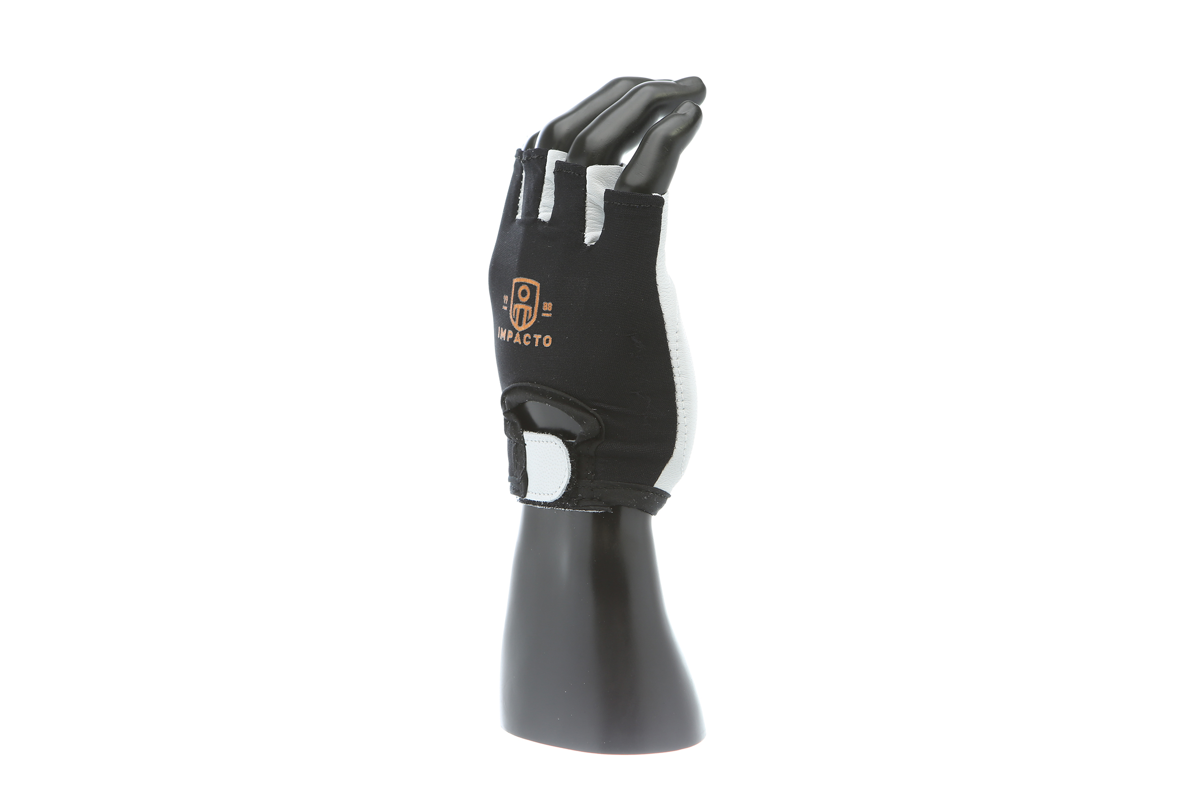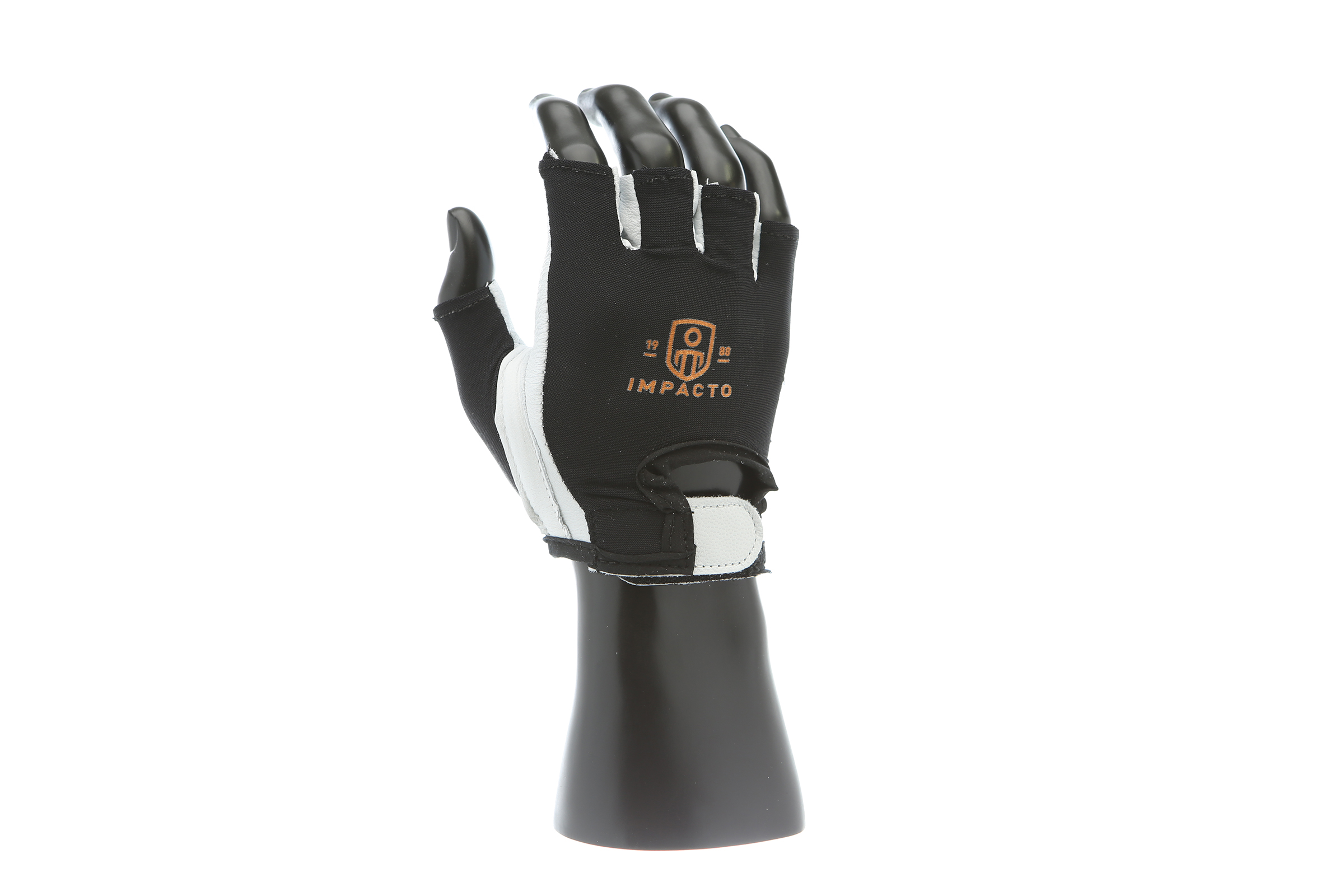 IMPACTO Anti-Impact Gloves. Half finger, nylon back with soft pearl leather palm ensure outstanding dexterity and comfort. Impact absorbing visco-elastic polymer VEP padding in the palm. Adjustable hook and loop wrist closure.
