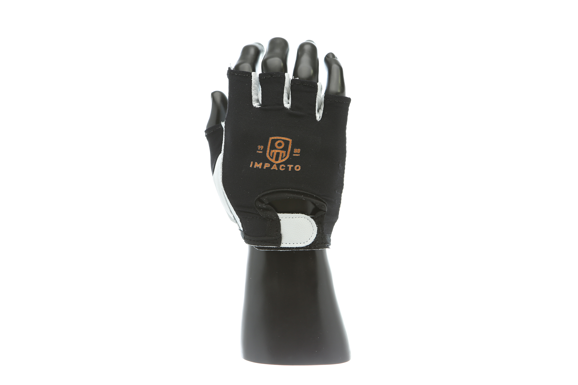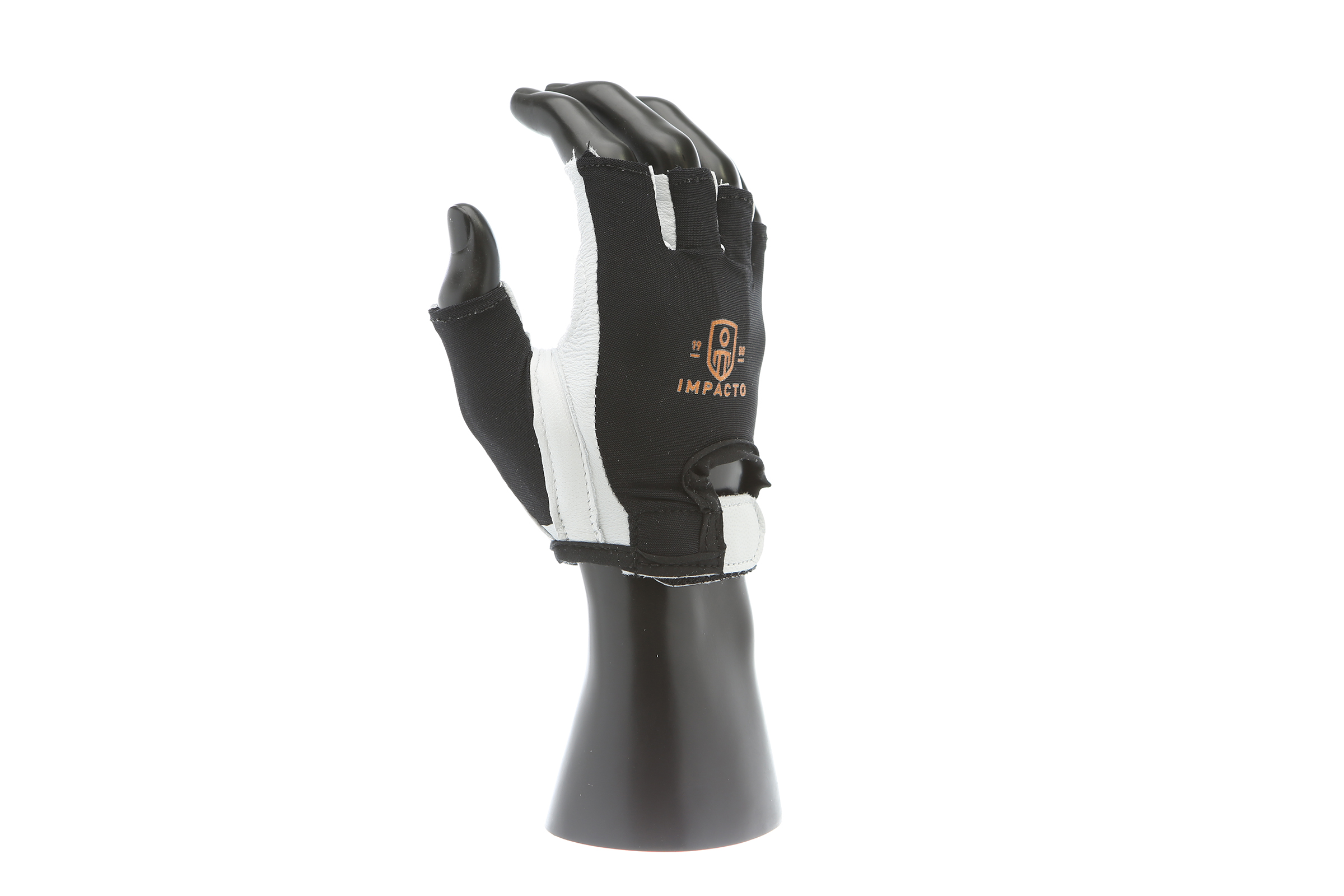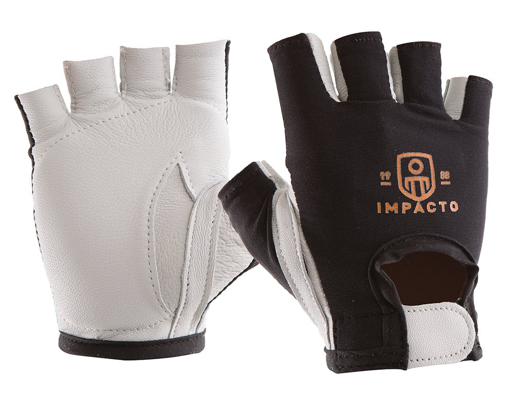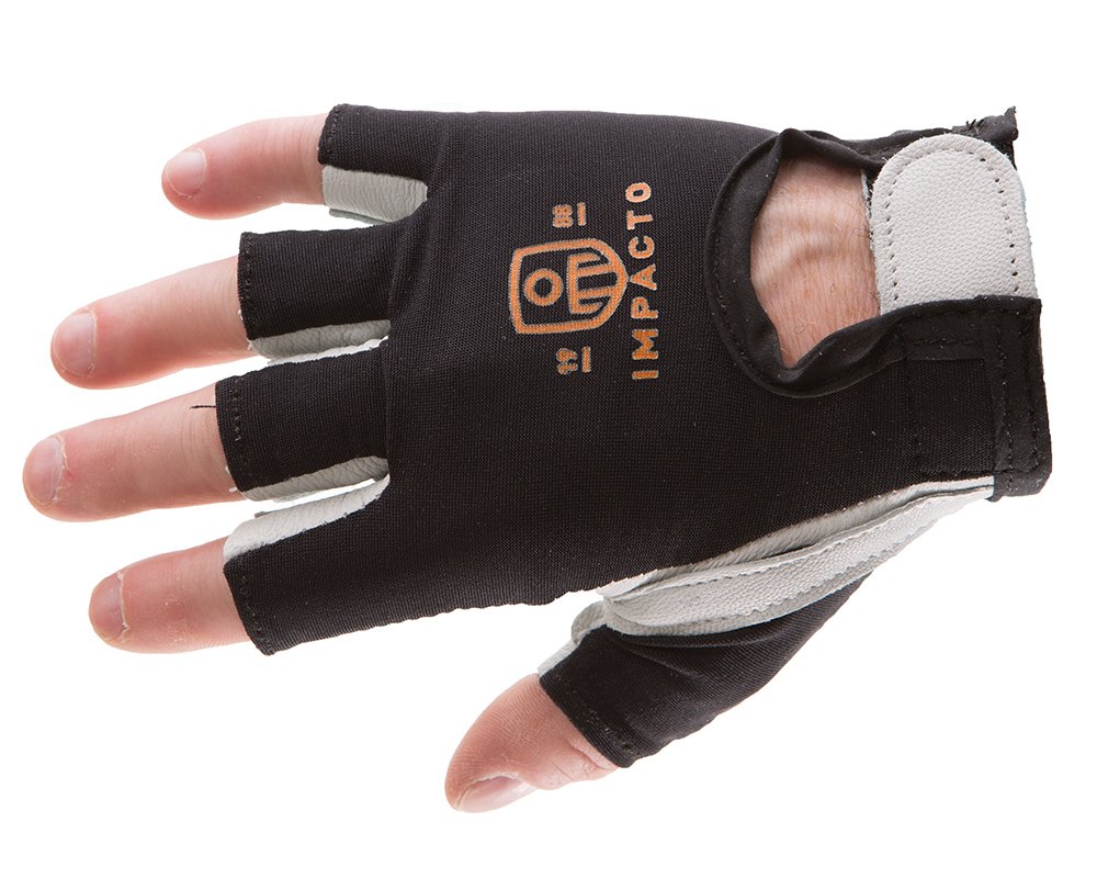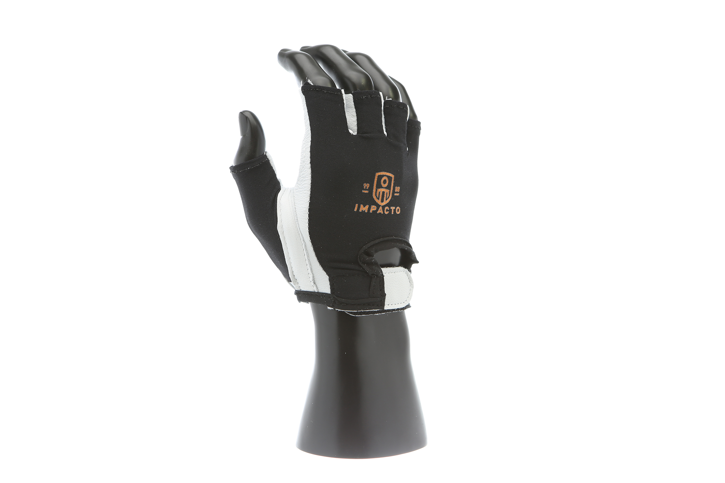 IMPACTO Anti-Impact Gloves. Half finger, nylon back with soft pearl leather palm ensure outstanding dexterity and comfort. Impact absorbing visco-elastic polymer VEP padding in the palm. Adjustable hook and loop wrist closure.