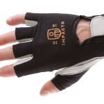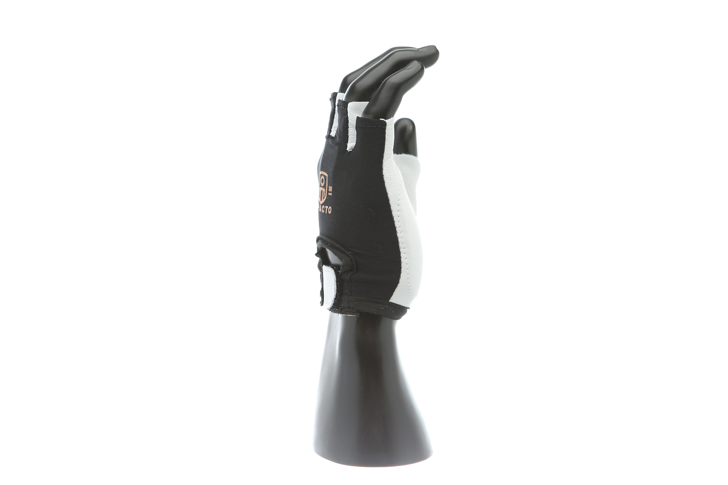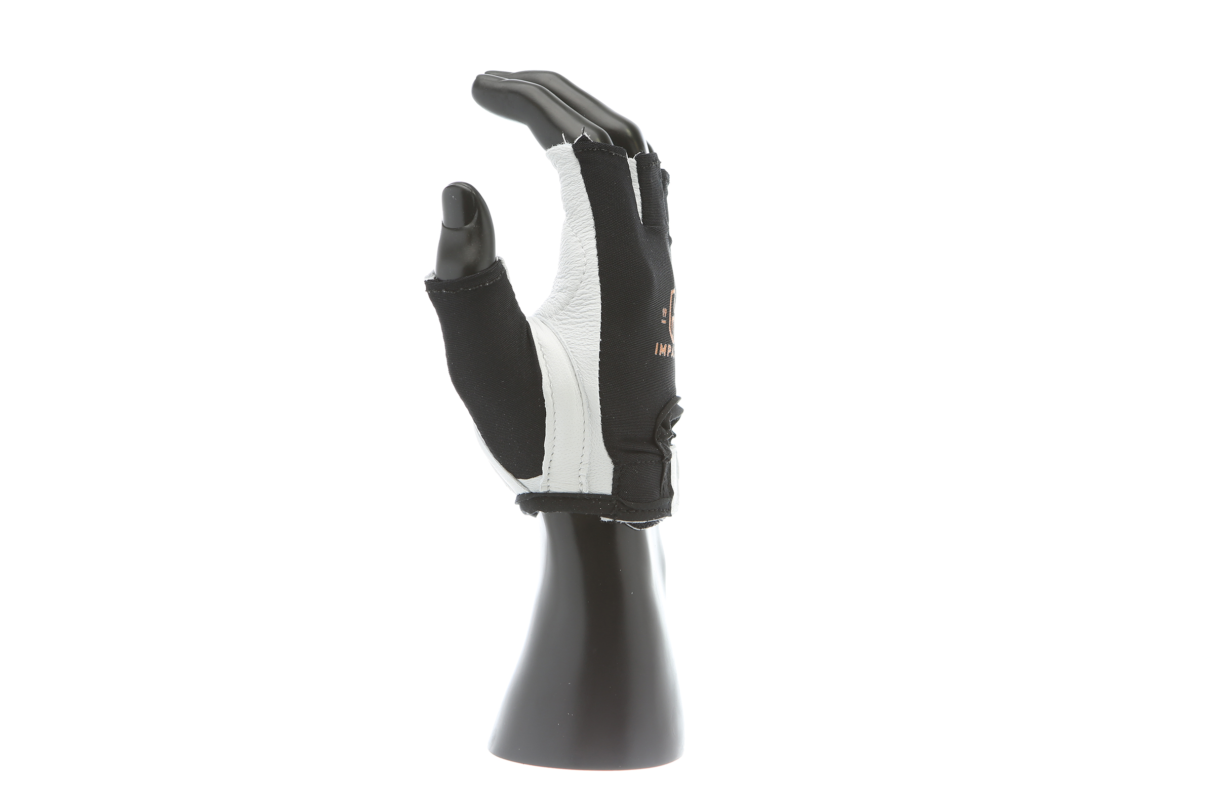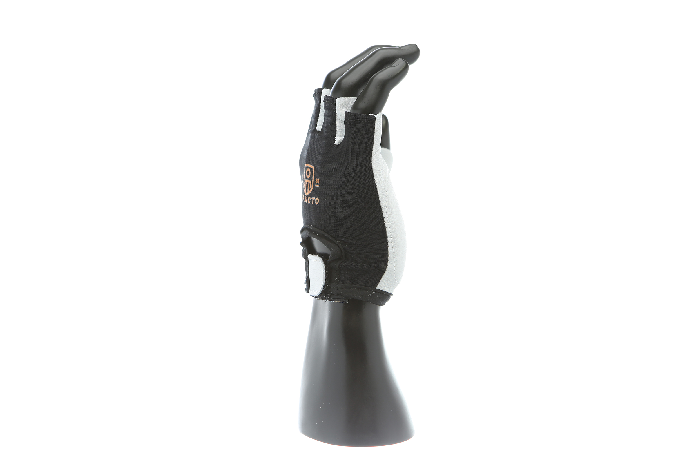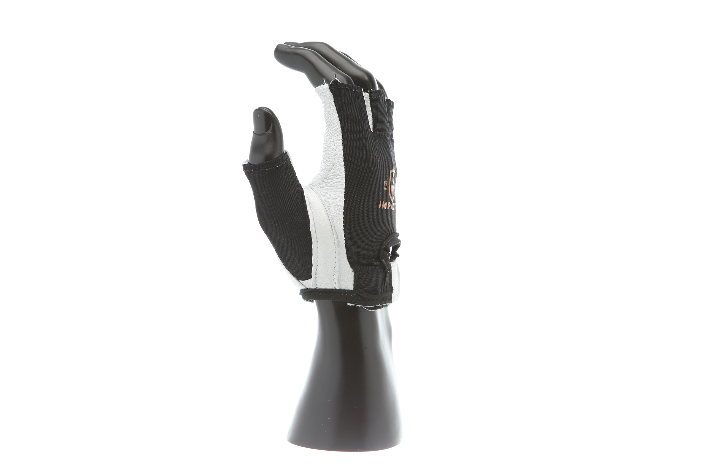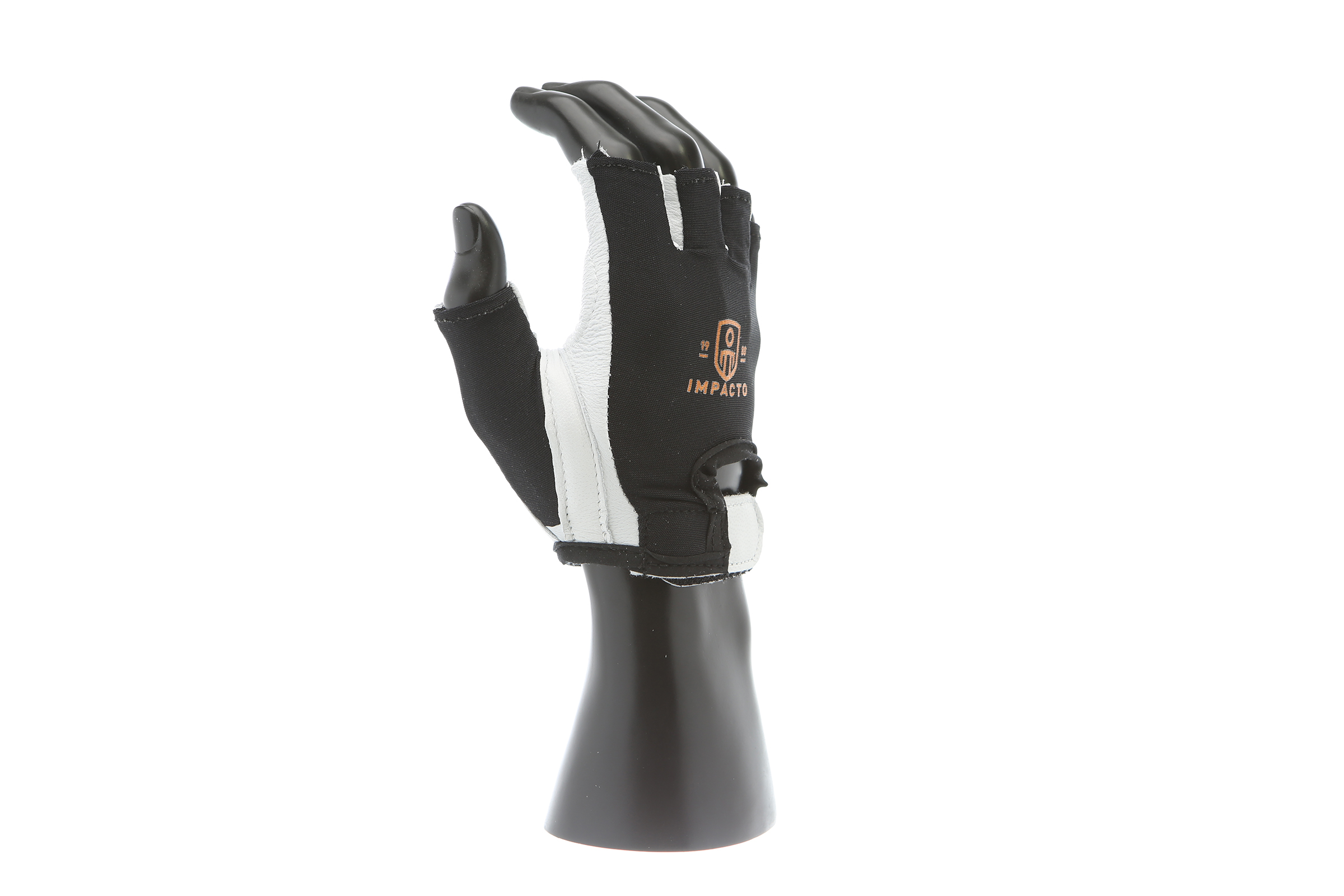 IMPACTO Anti-Impact Gloves. Half finger, nylon back with soft pearl leather palm ensure outstanding dexterity and comfort. Impact absorbing visco-elastic polymer VEP padding in the palm. Adjustable hook and loop wrist closure.