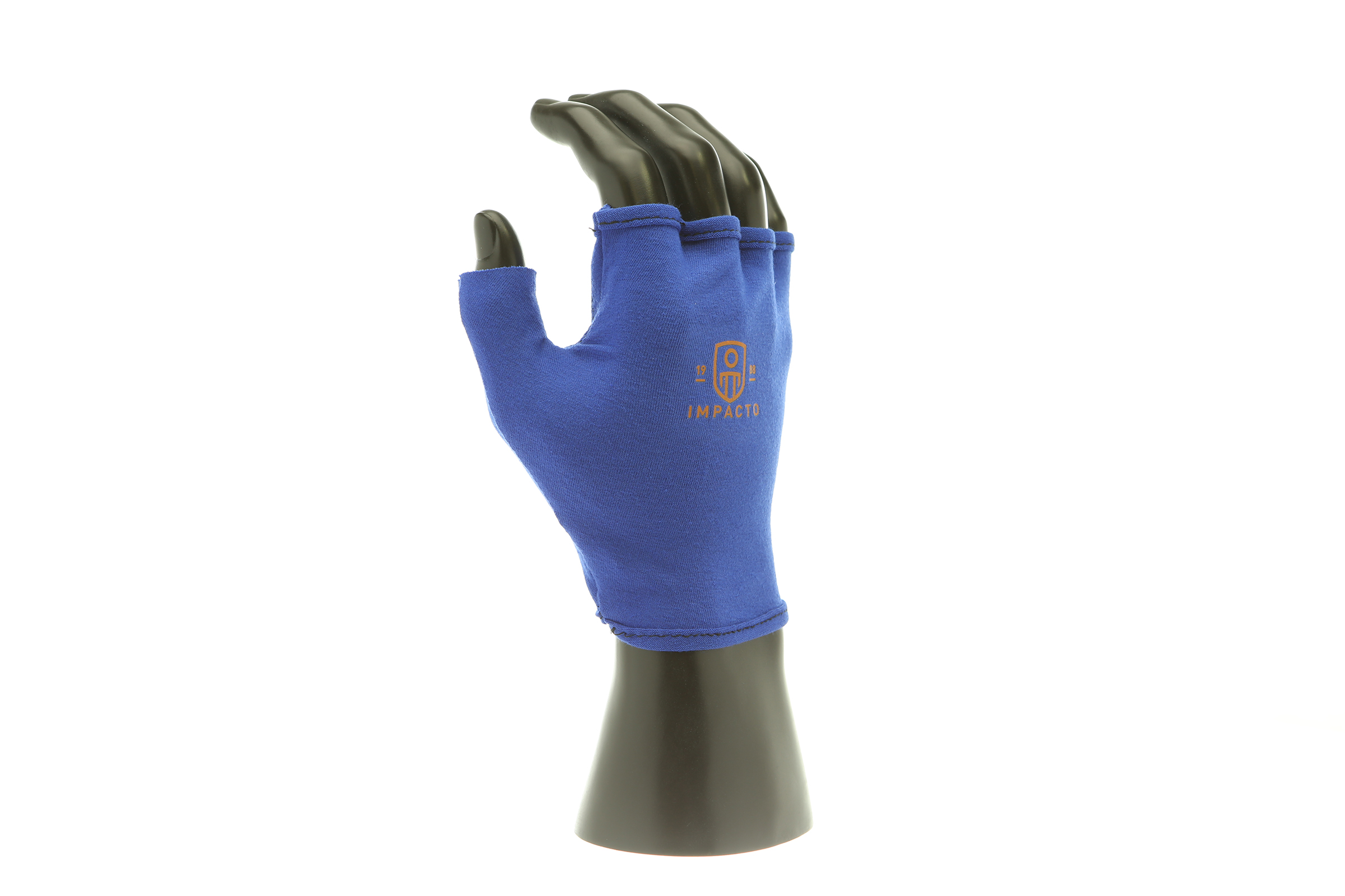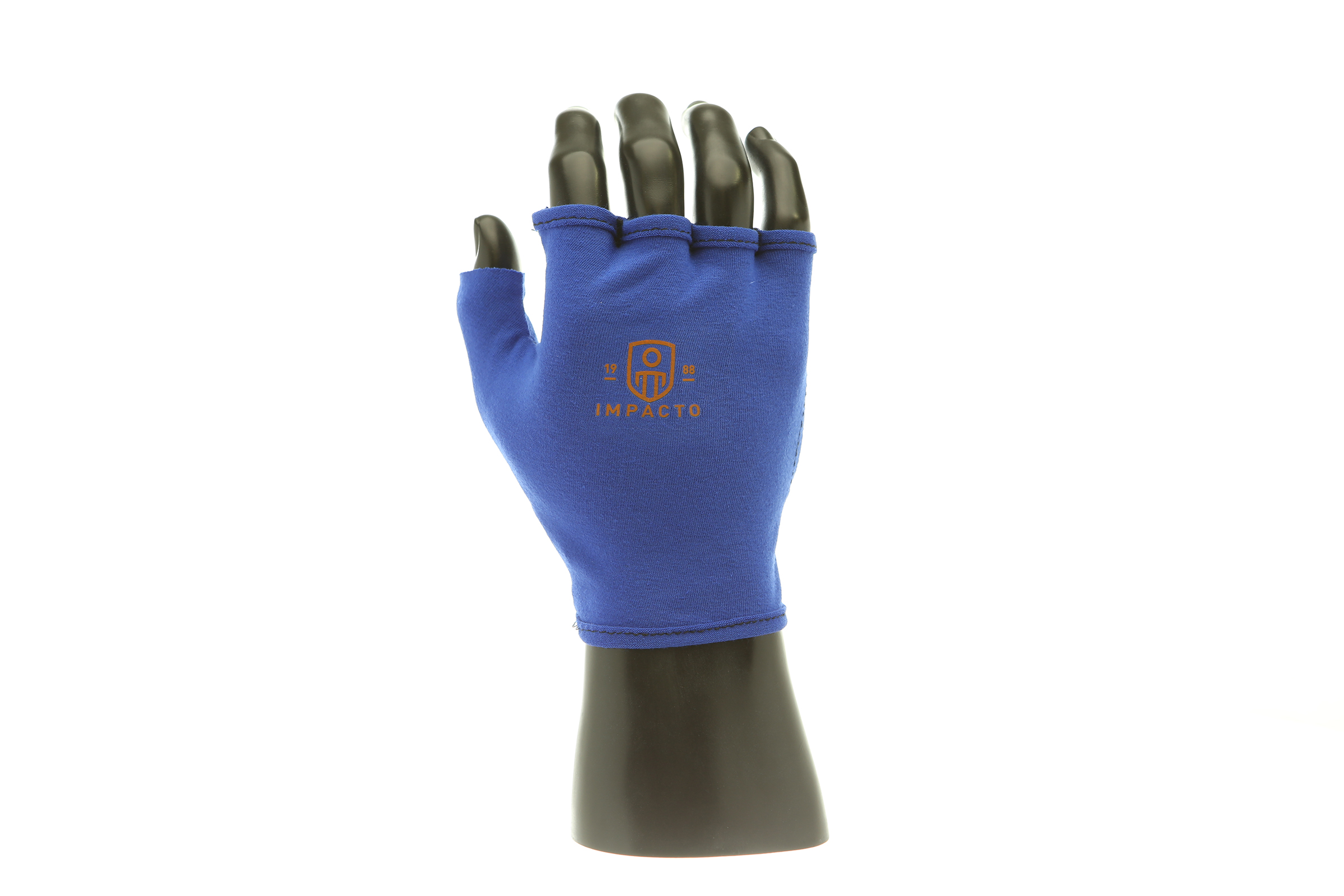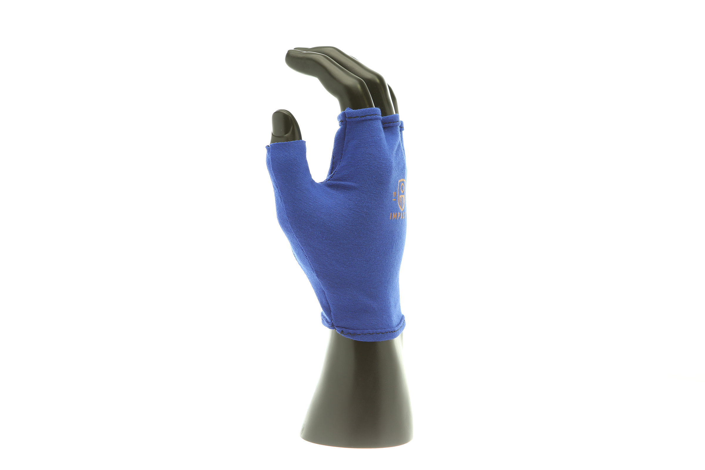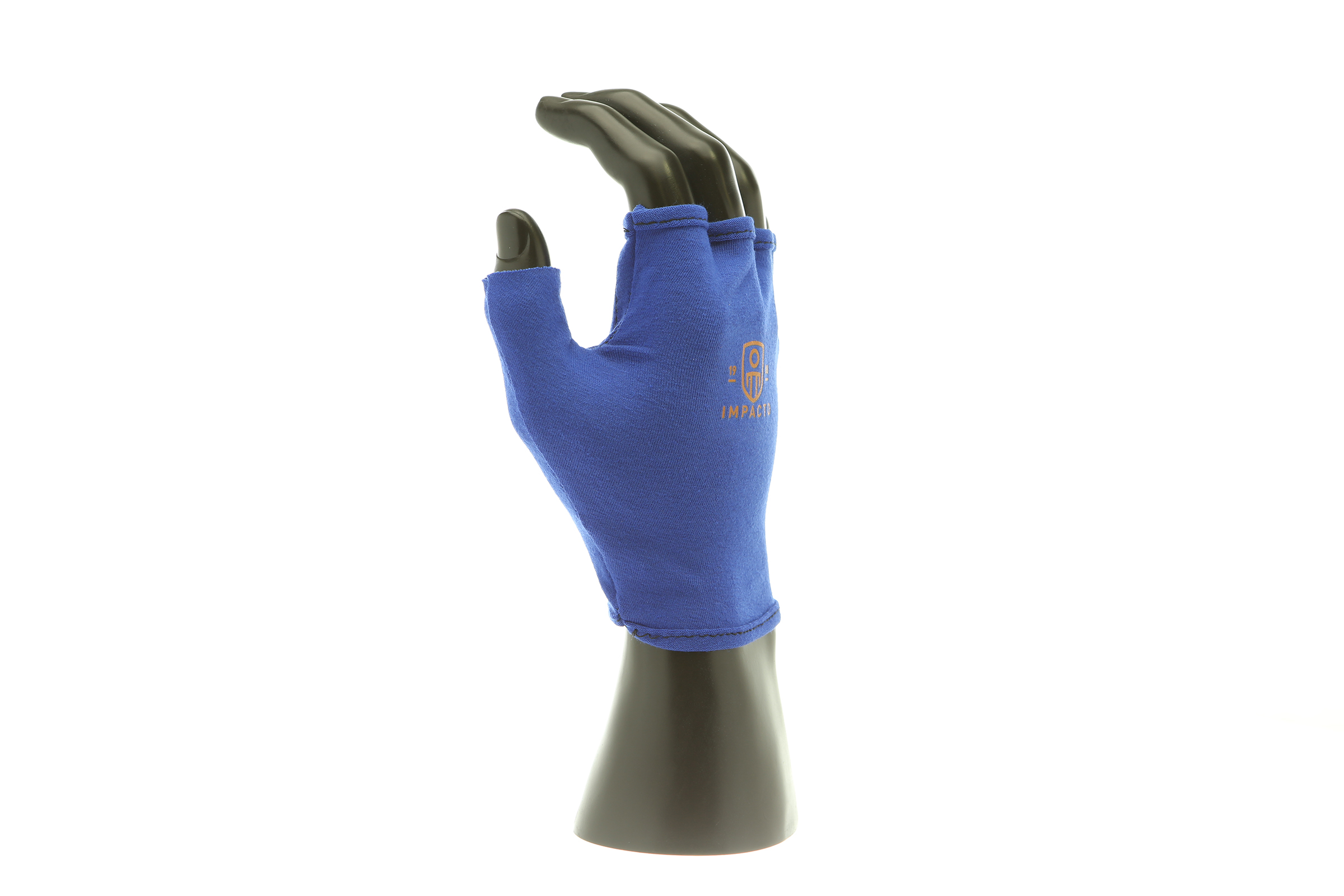 IMPACTO Fingerless four-way stretch polycotton glove liner. Contoured visco-elastic polymer (VEP) padding in the palm protects from vibration and impact.