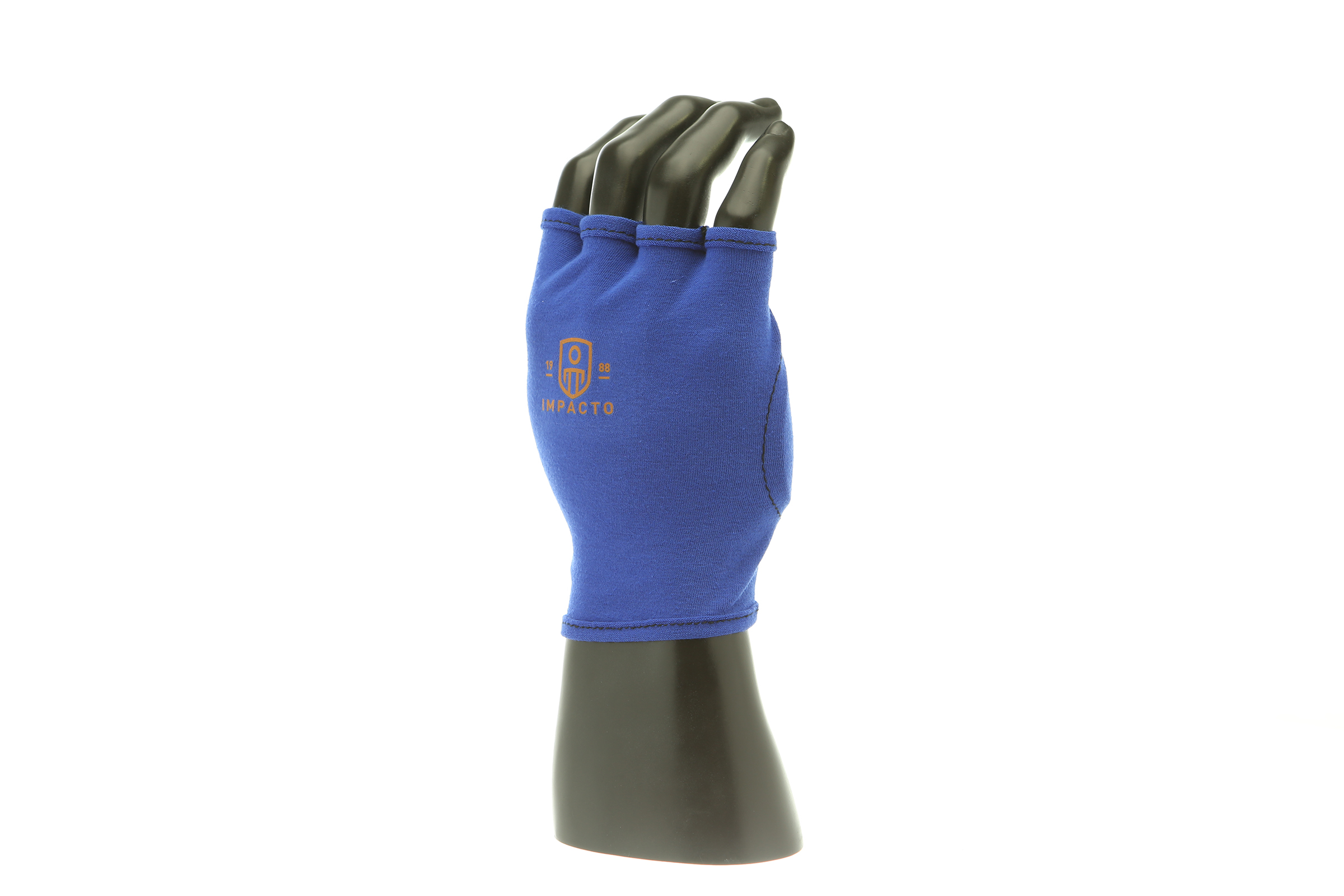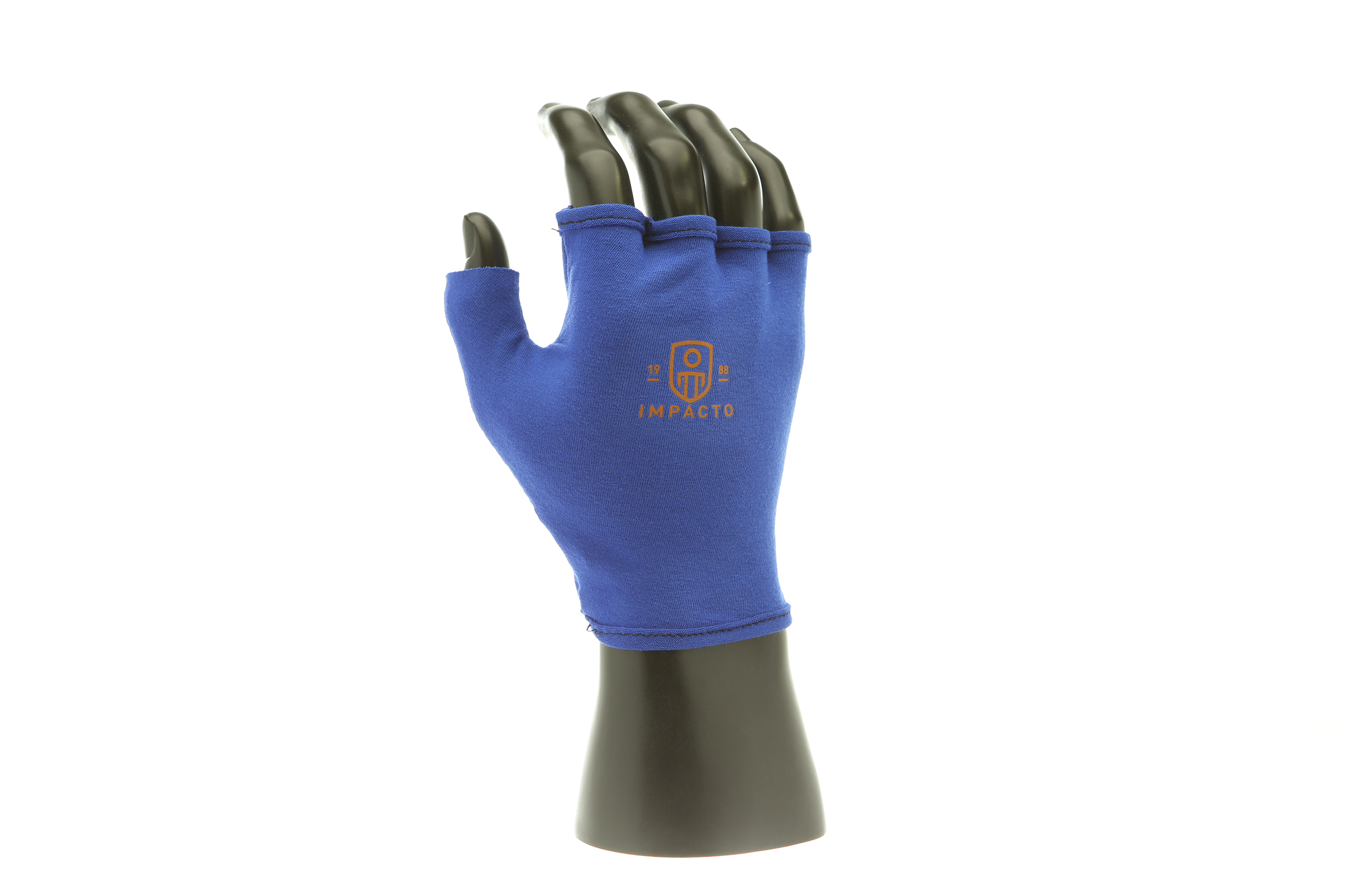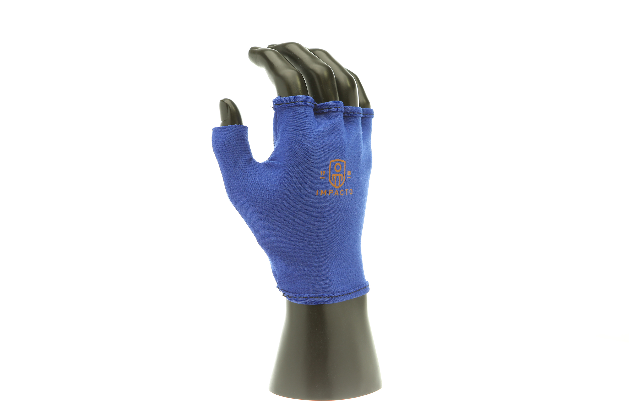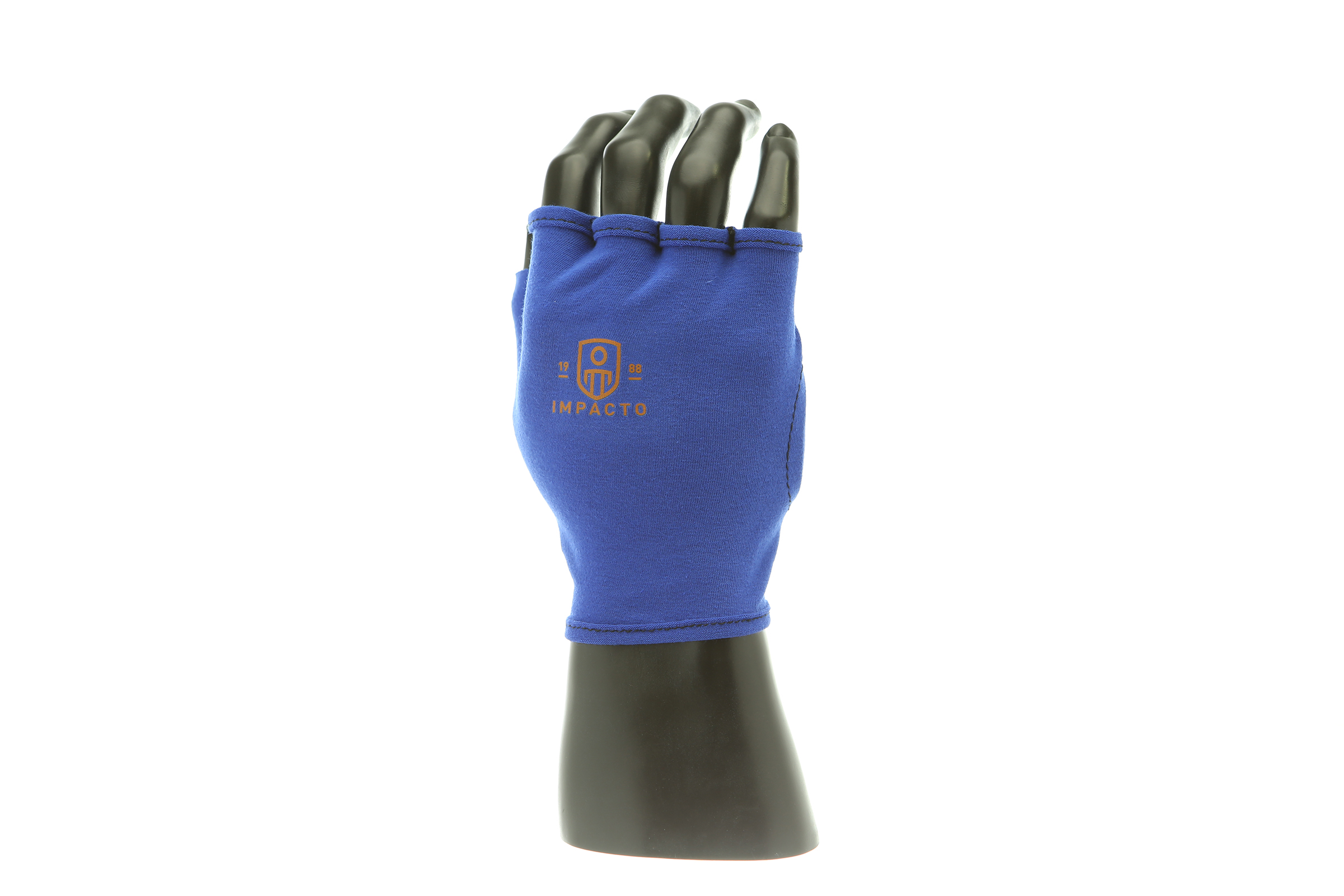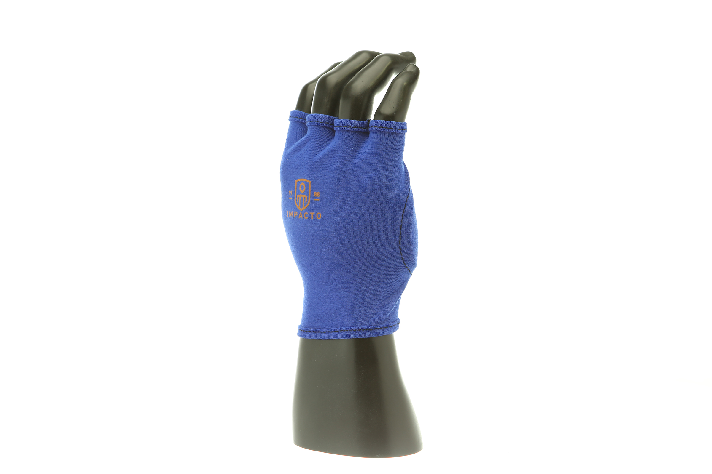 IMPACTO Fingerless four-way stretch polycotton glove liner. Contoured visco-elastic polymer (VEP) padding in the palm protects from vibration and impact.