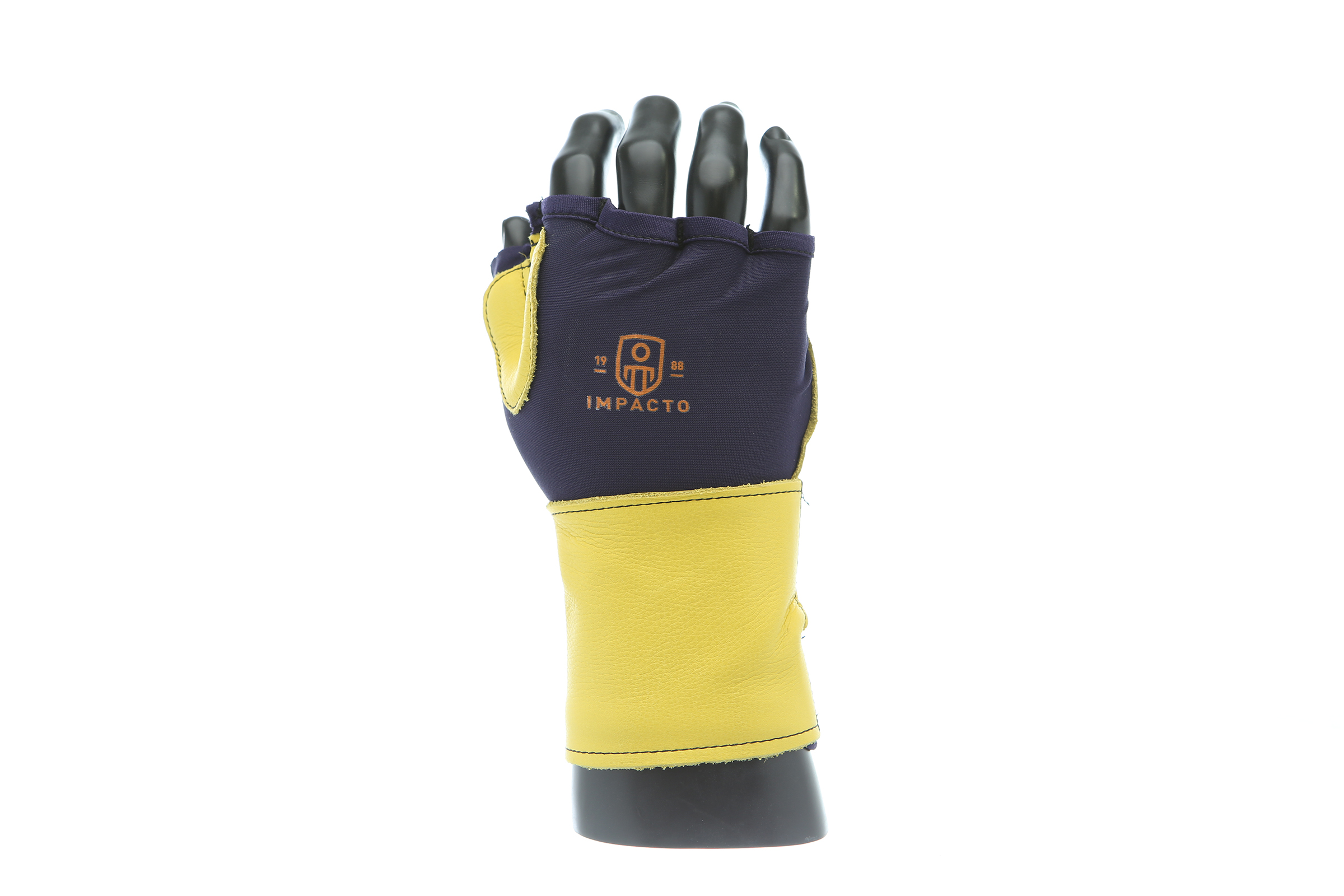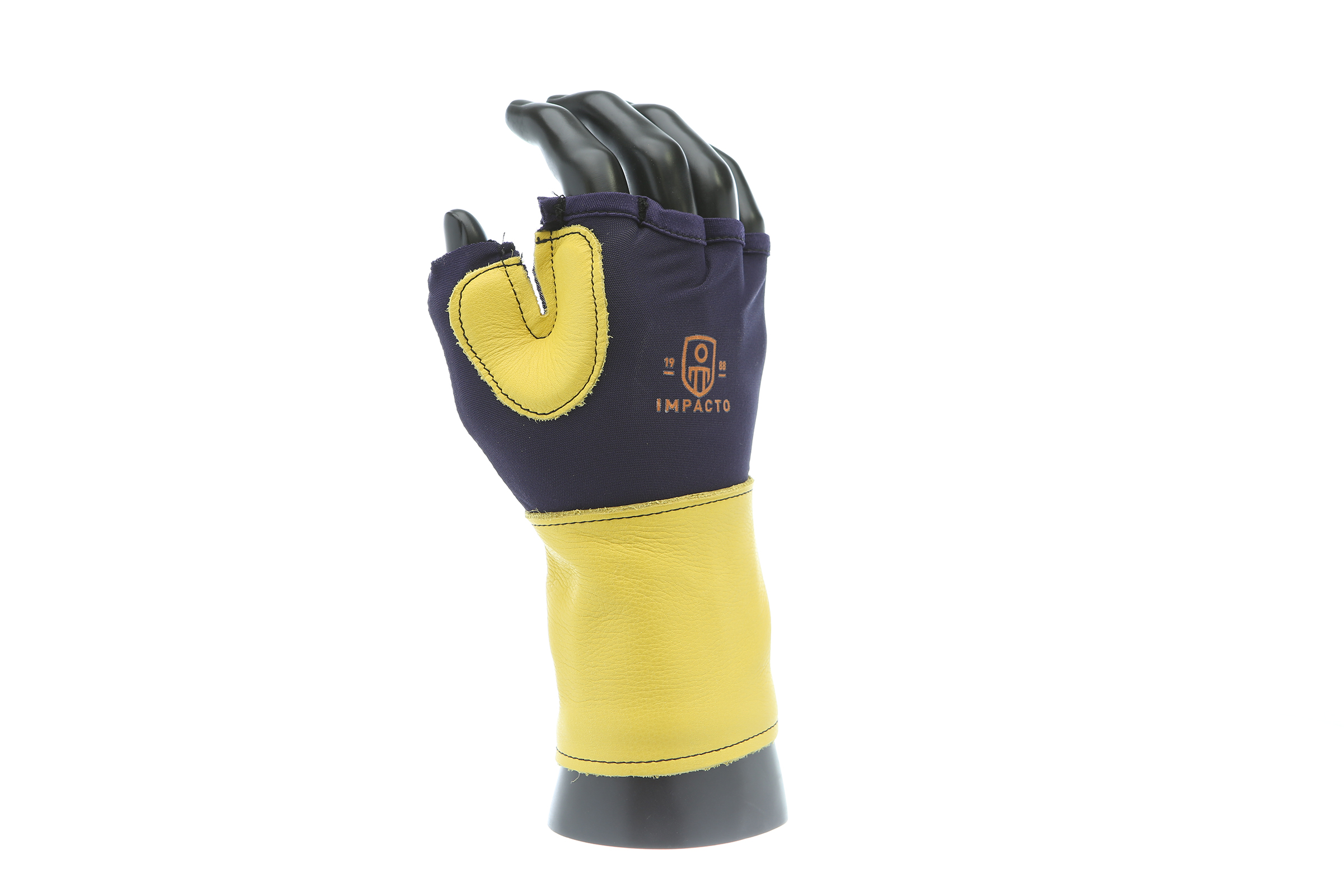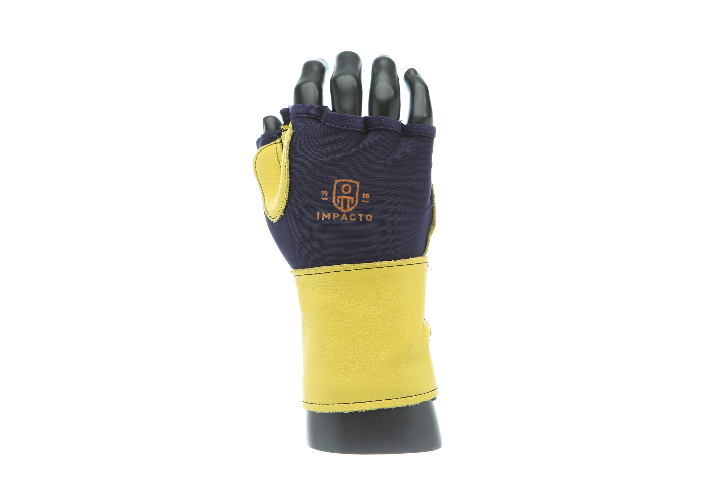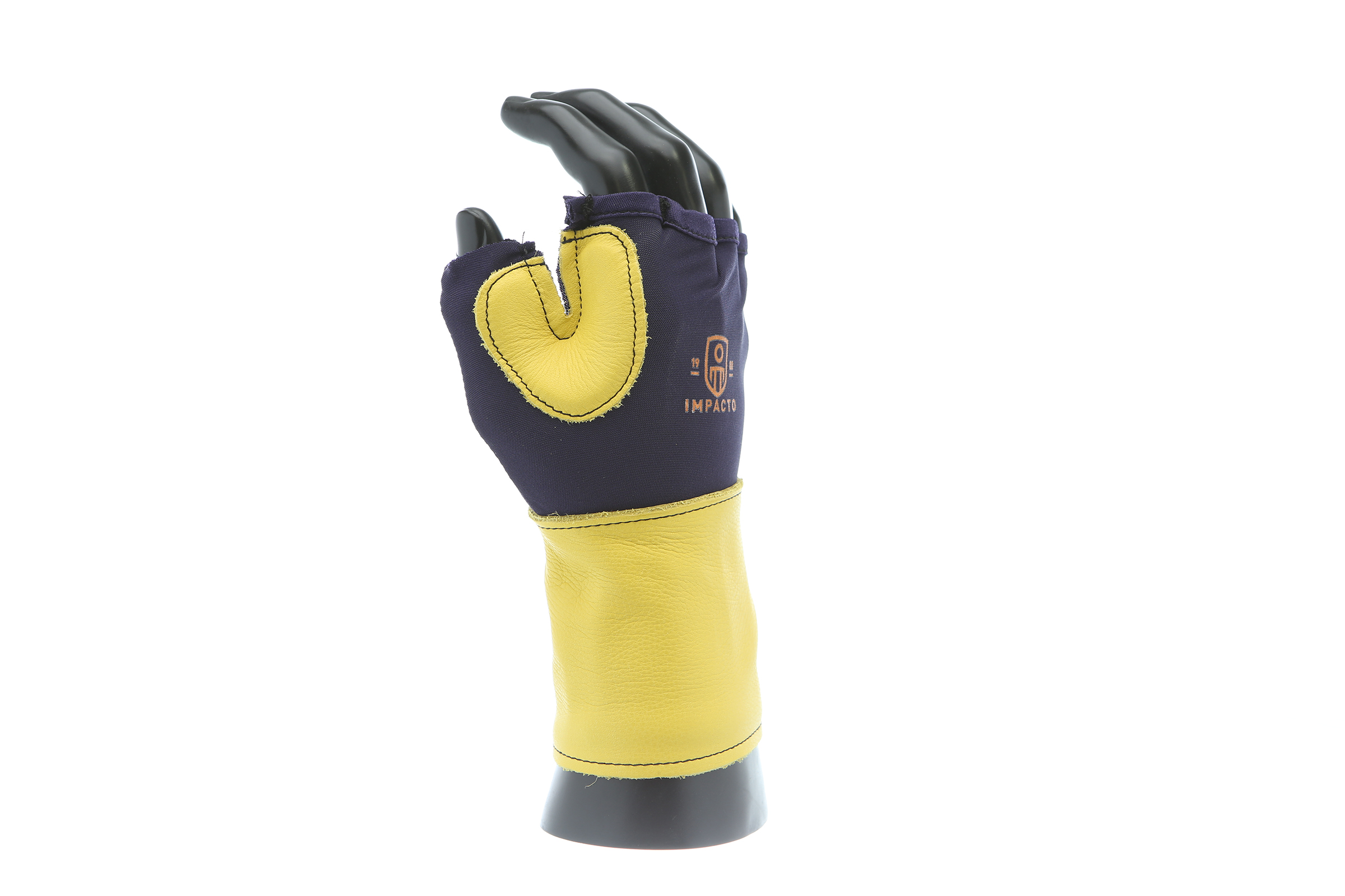 IMPACTO Fingerless nylon Lycra and grain leather glove with VEP padding in the palm and thumb web area. Detachable grain leather wrist support.