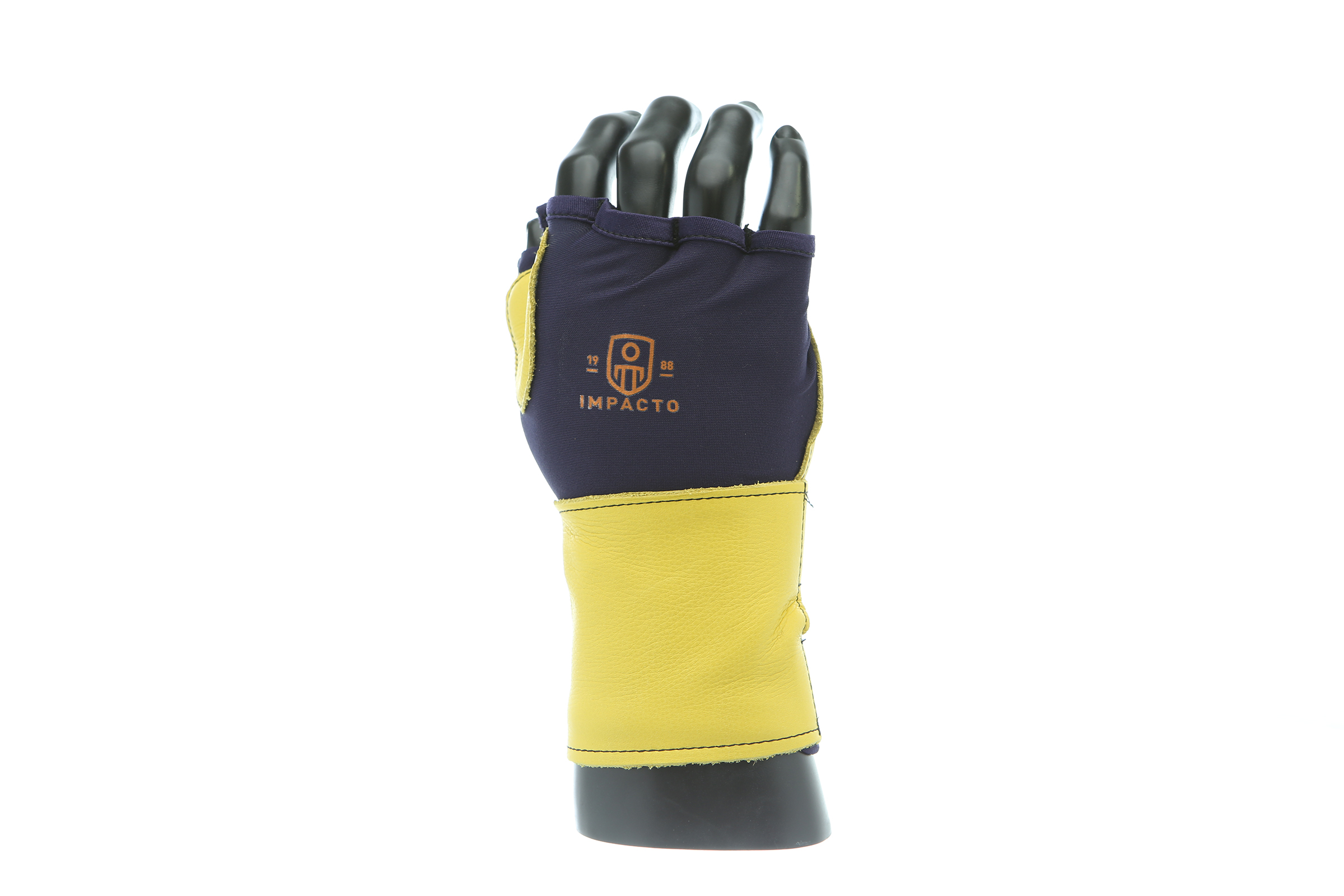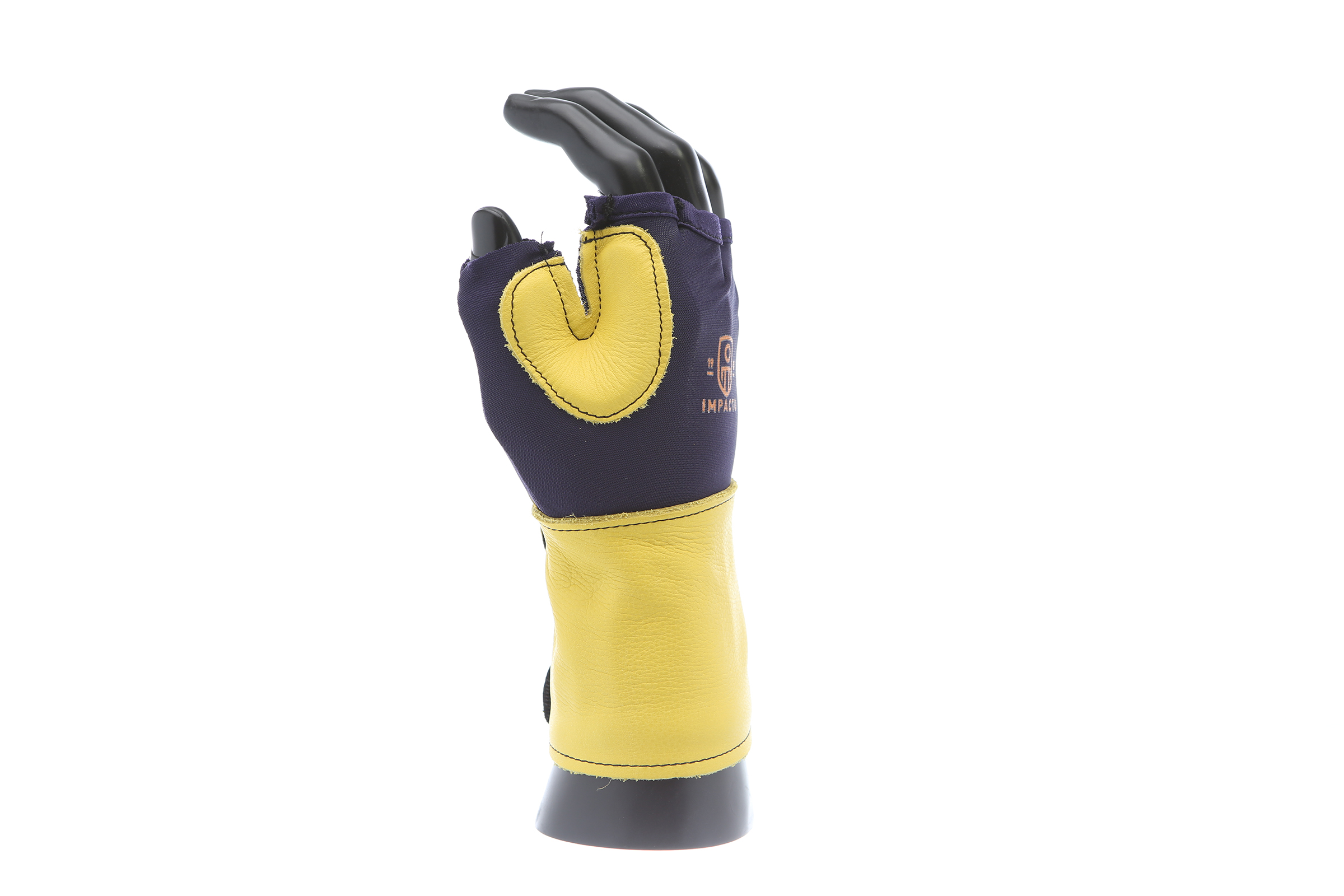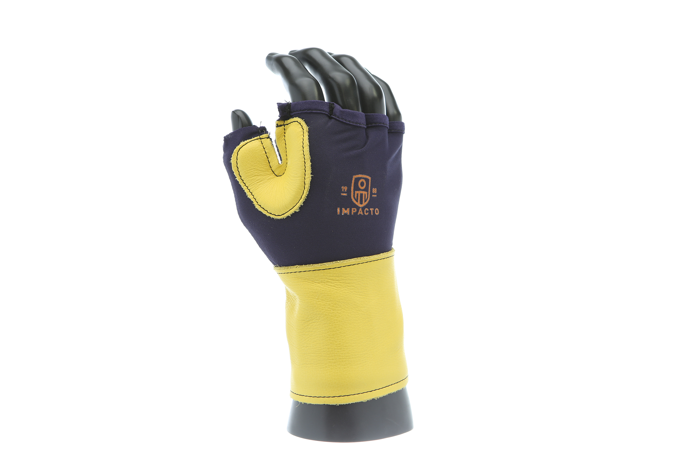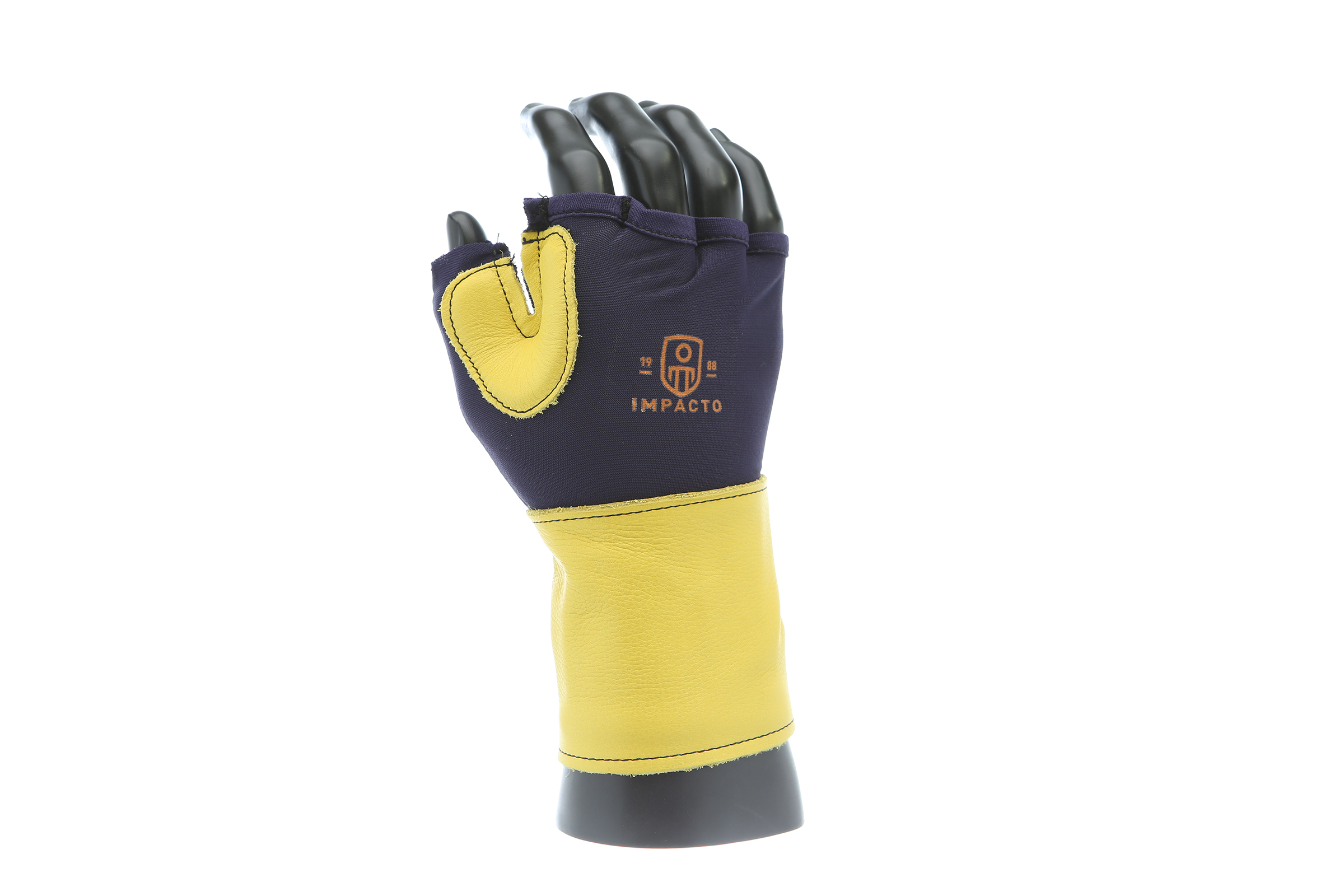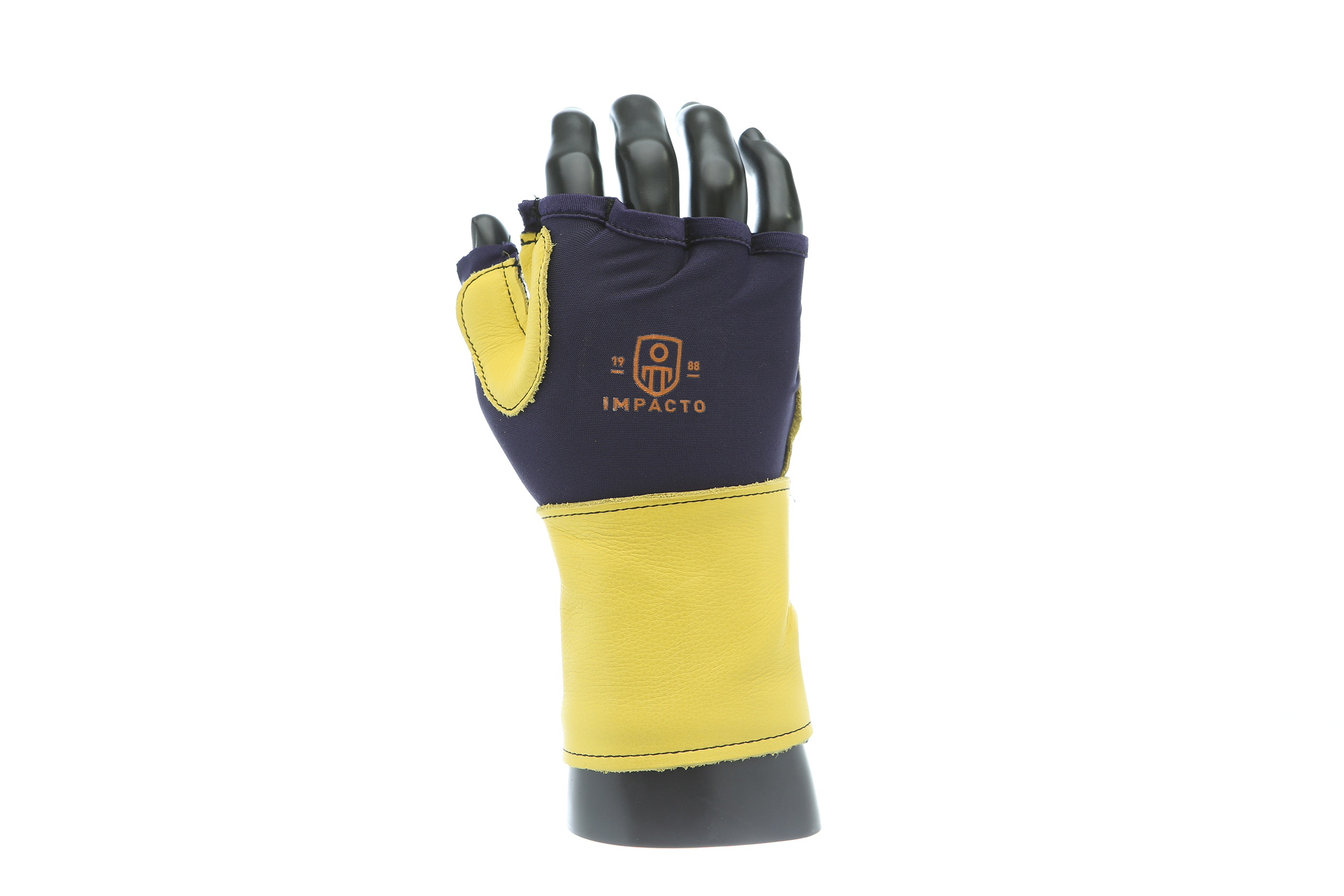 IMPACTO Fingerless nylon Lycra and grain leather glove with VEP padding in the palm and thumb web area. Detachable grain leather wrist support.