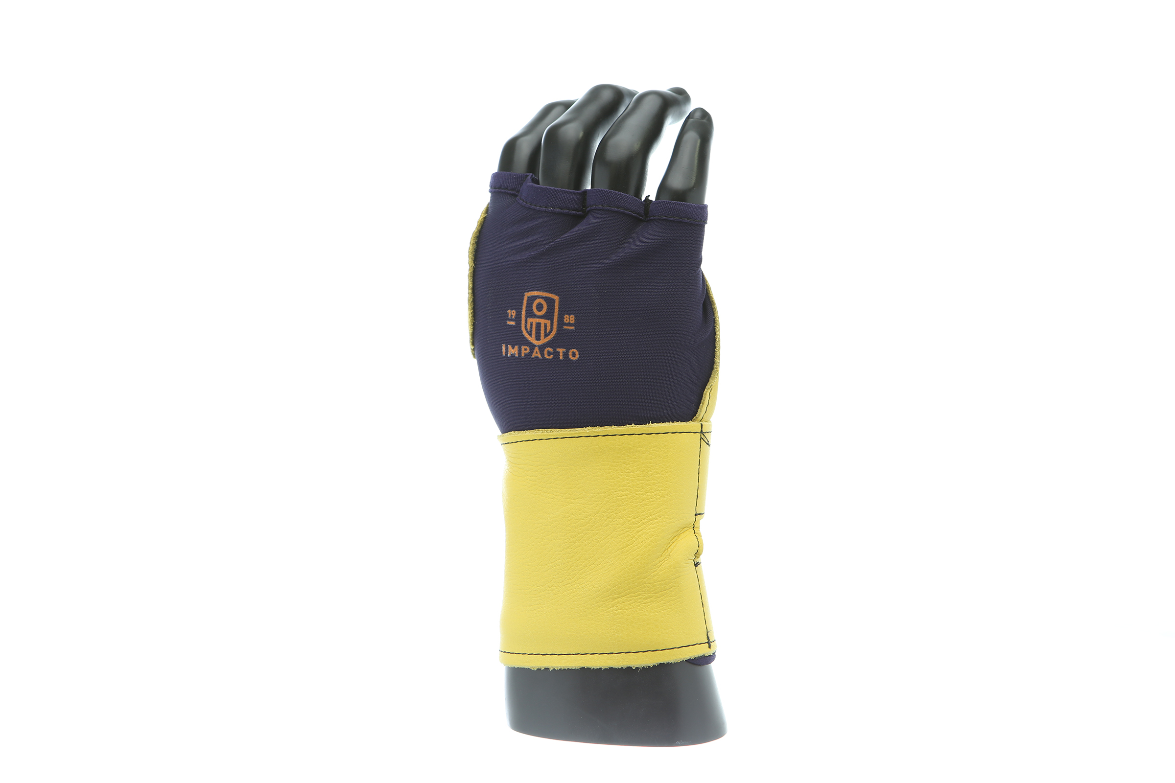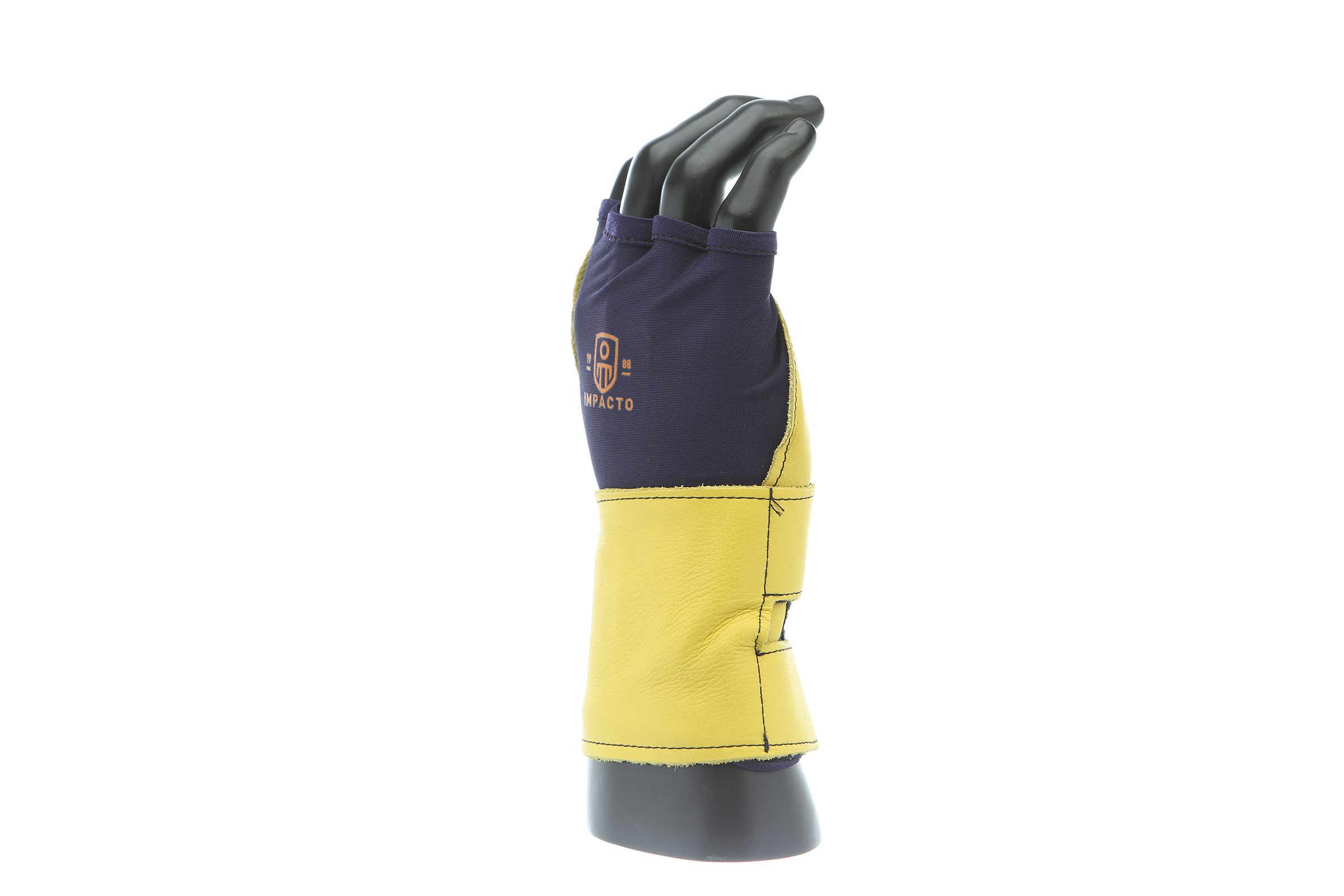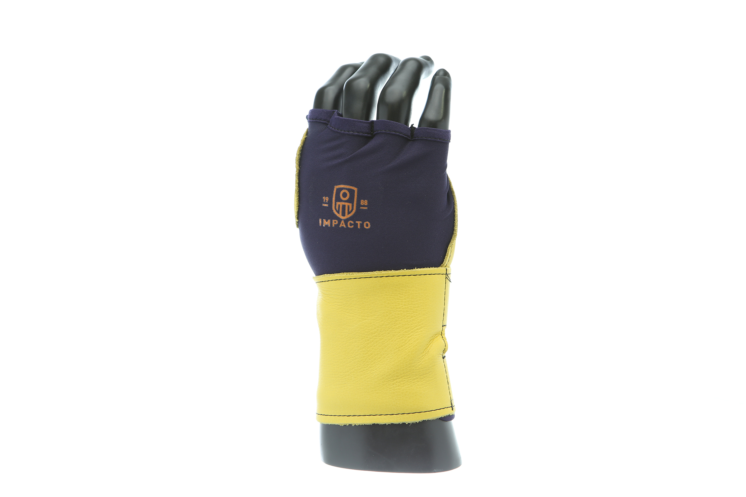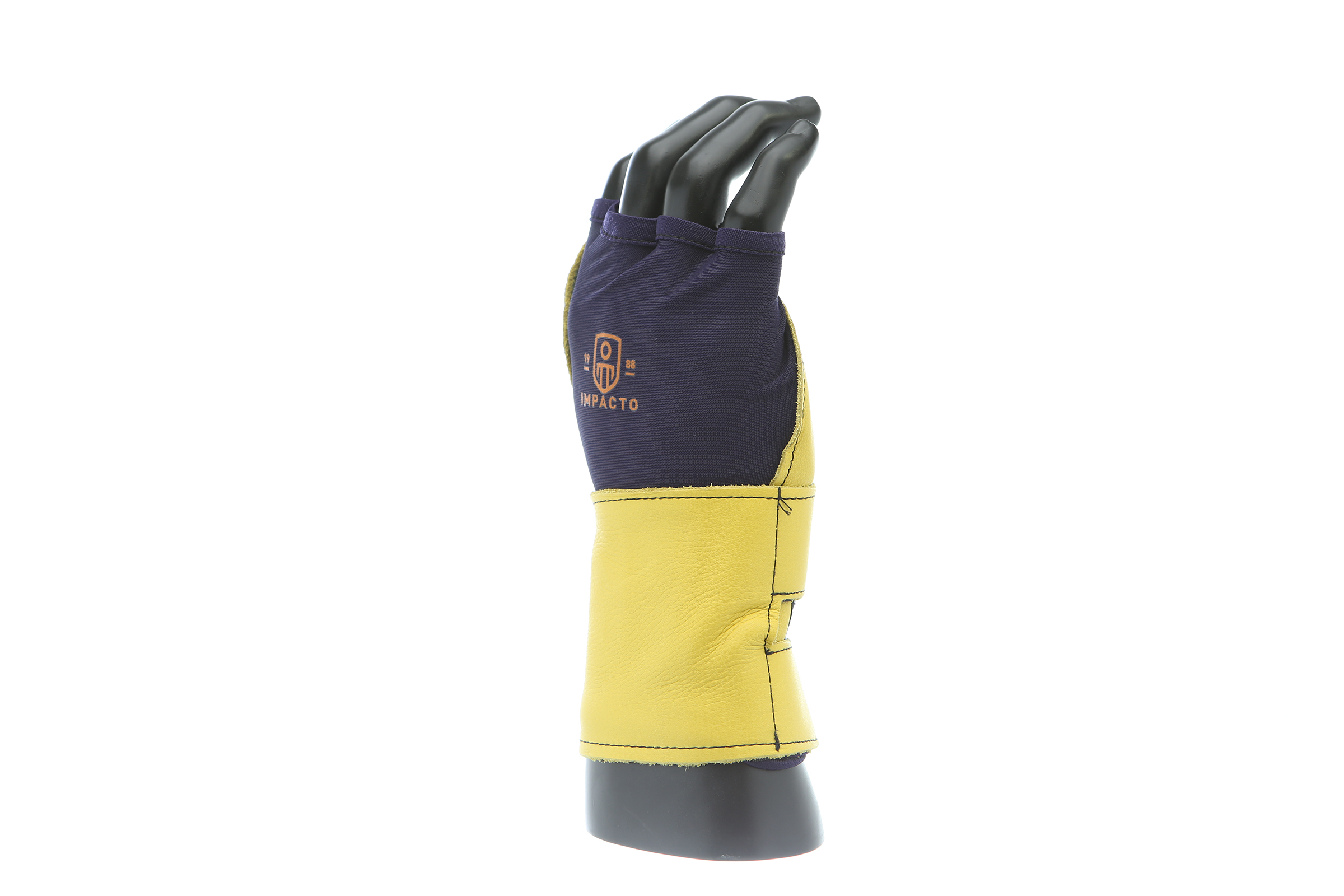 IMPACTO Fingerless nylon Lycra and grain leather glove with VEP padding in the palm and thumb web area. Detachable grain leather wrist support.