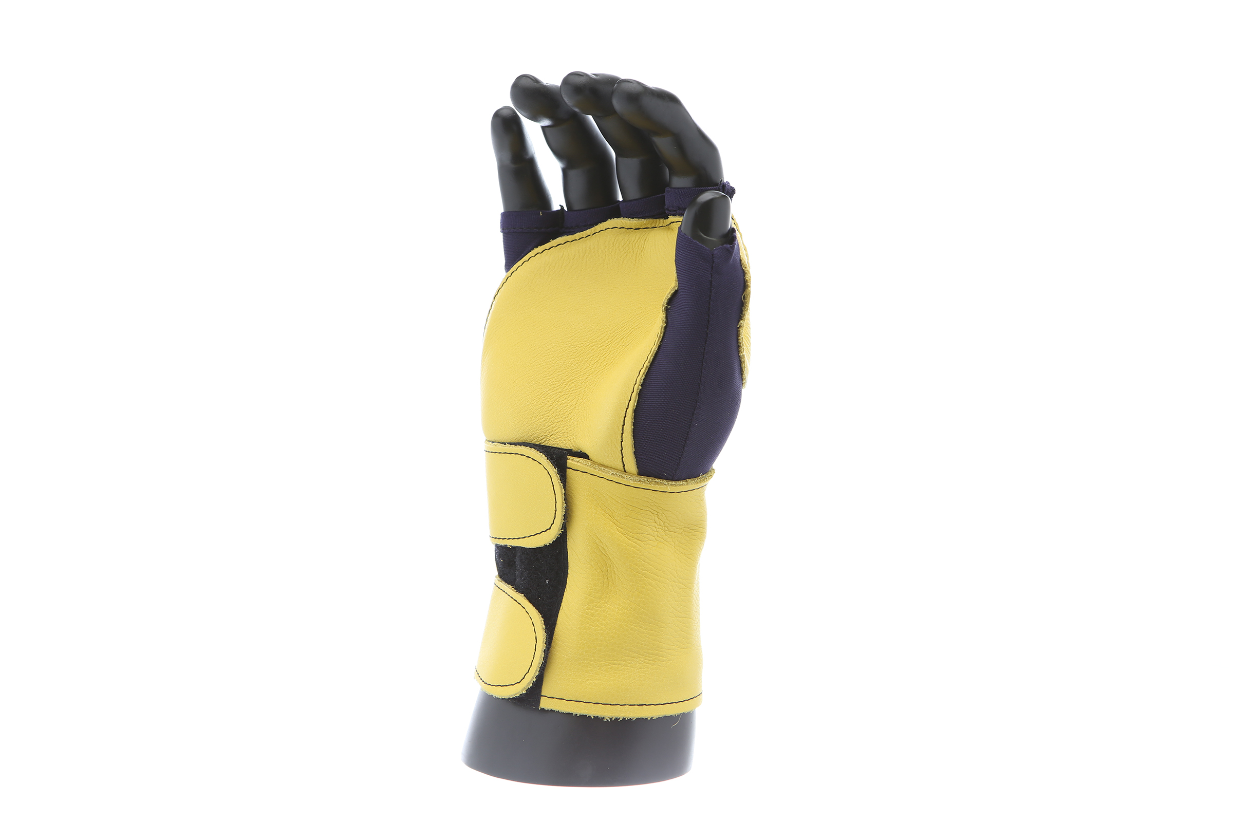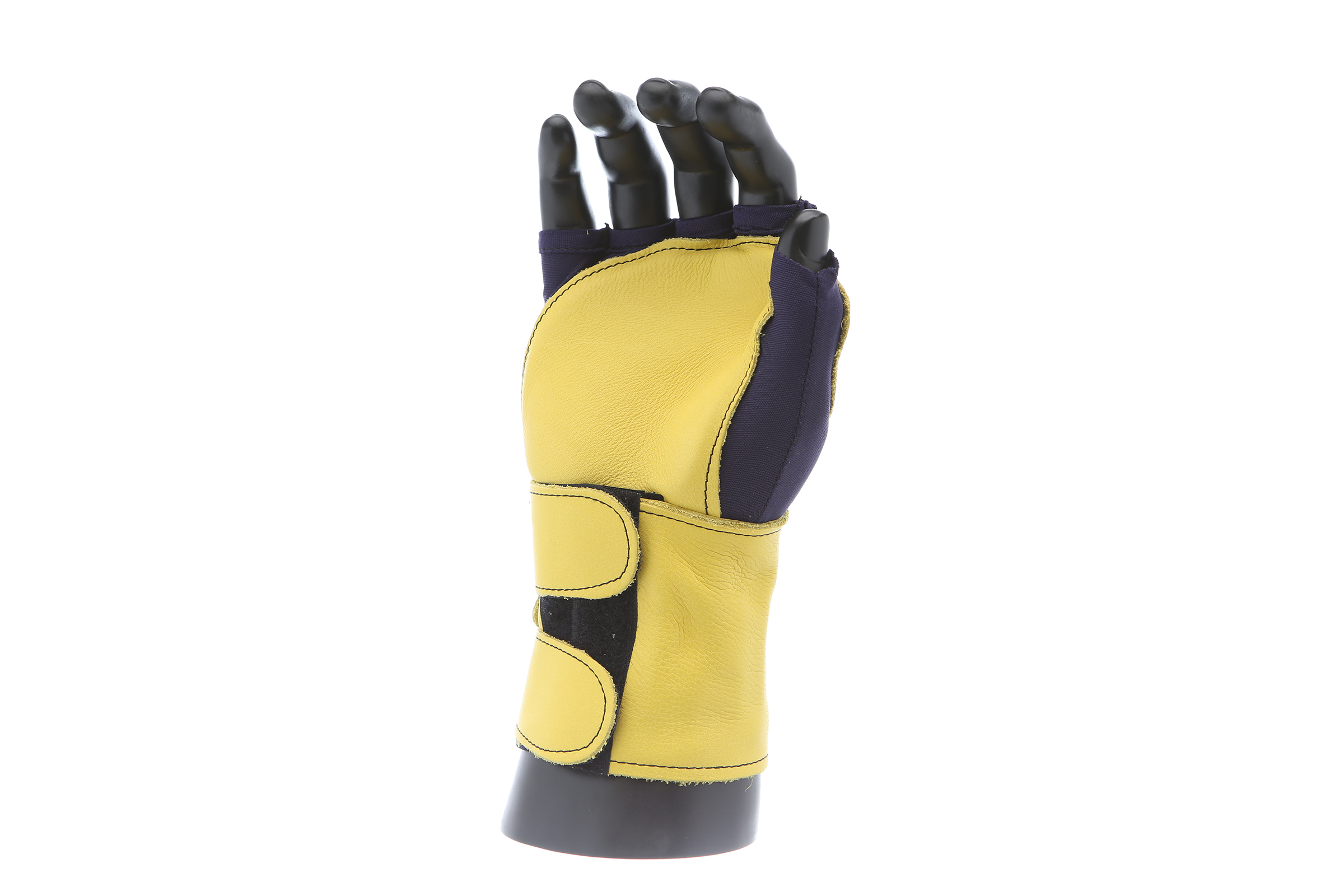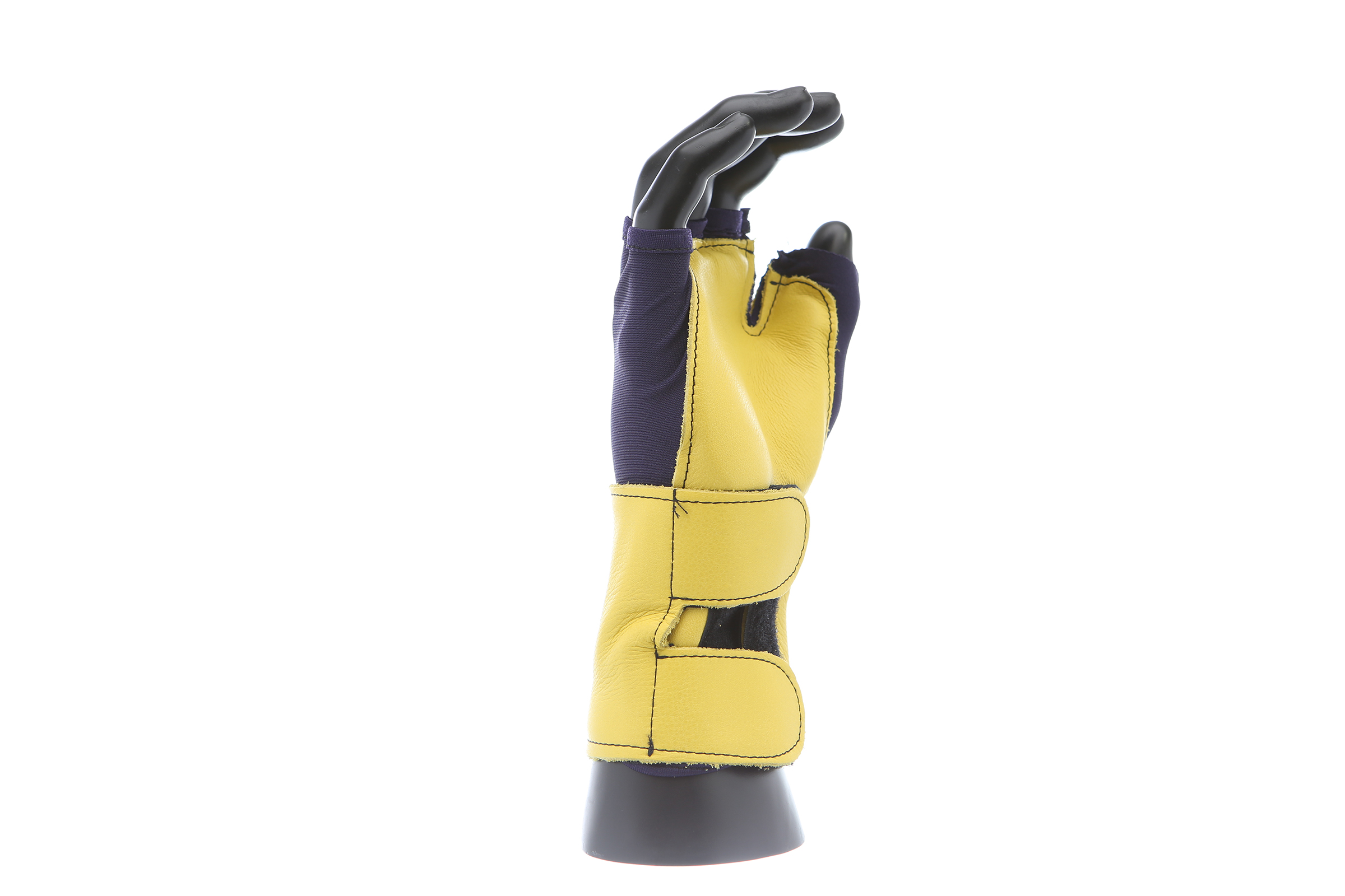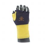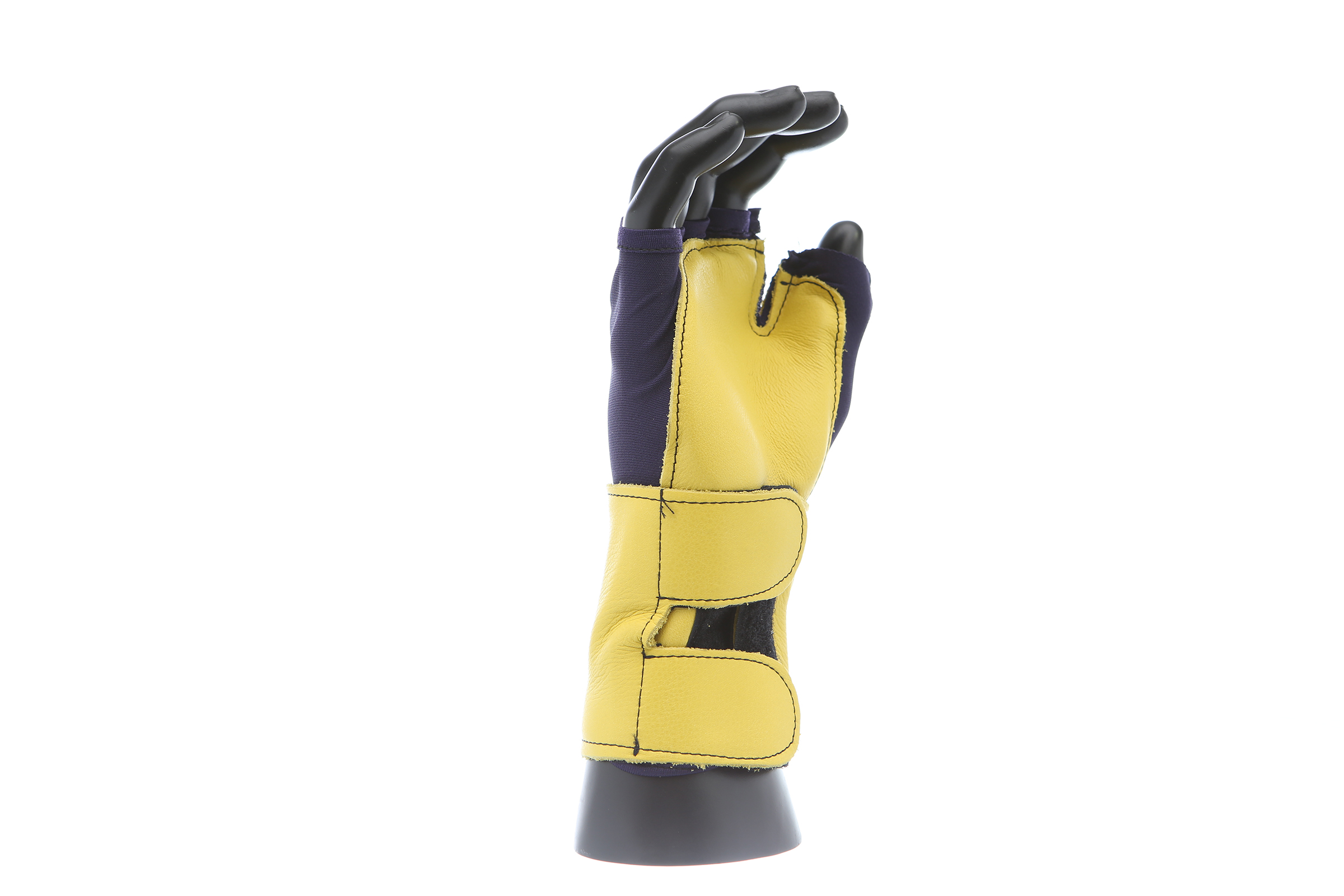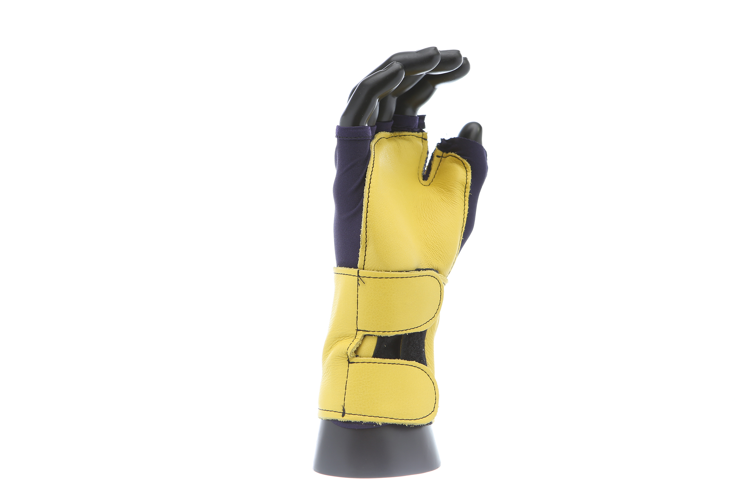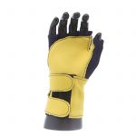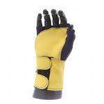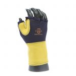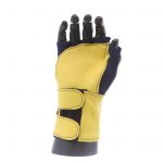 Fingerless nylon Lycra and grain leather glove with VEP padding in the palm and thumb web area. Detachable grain leather wrist support.