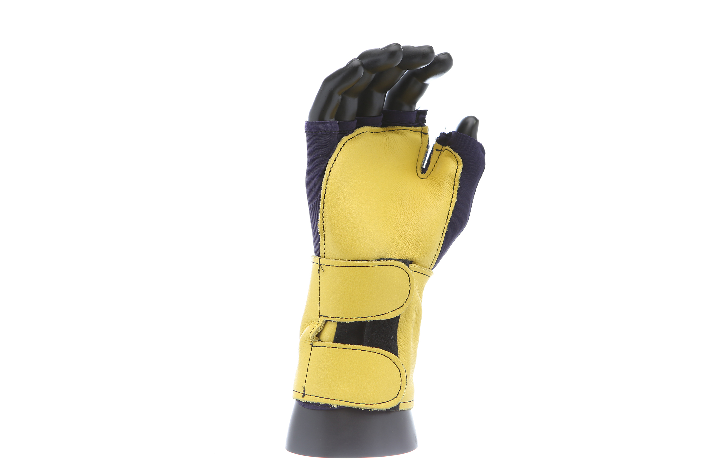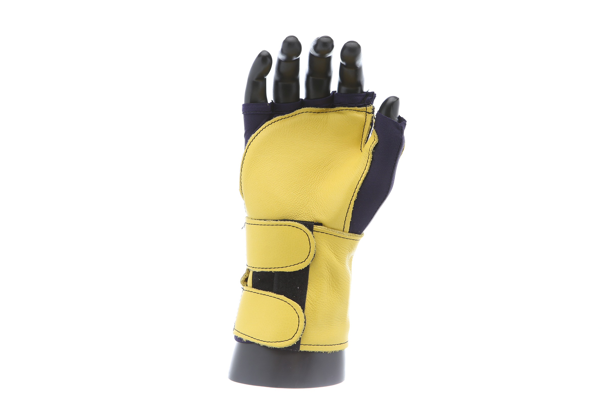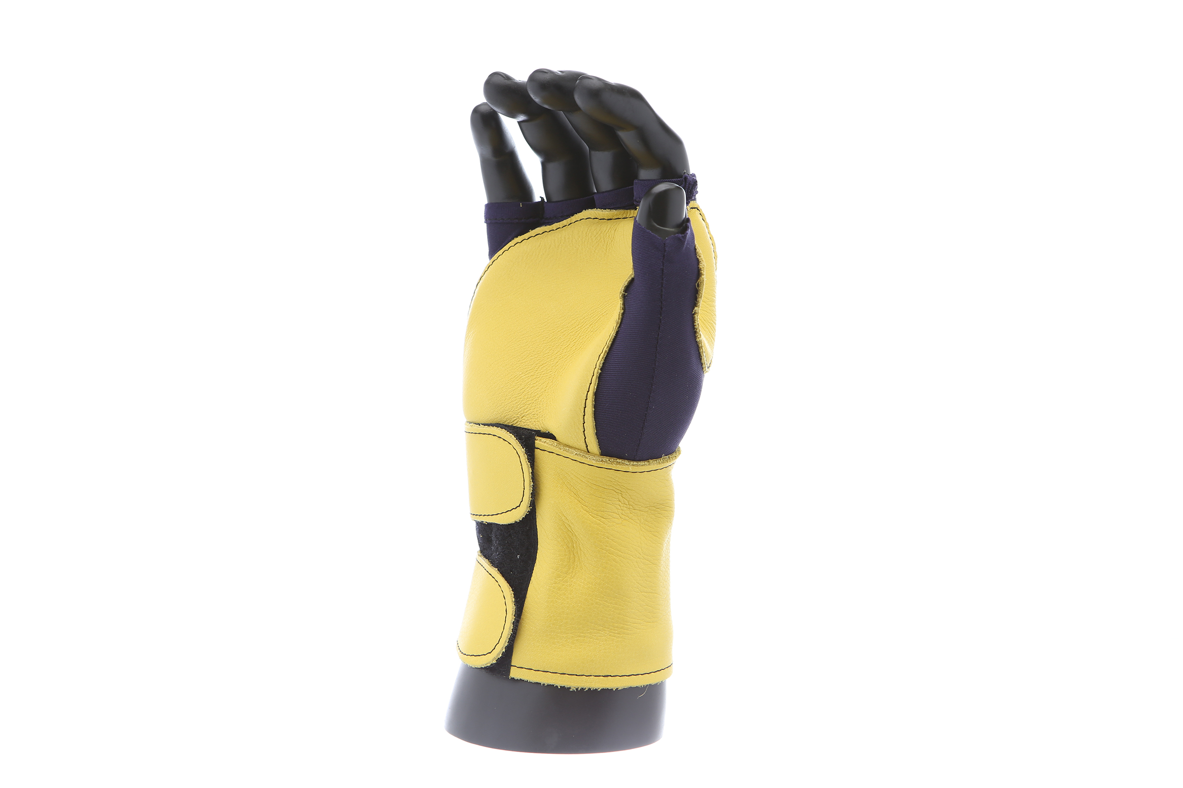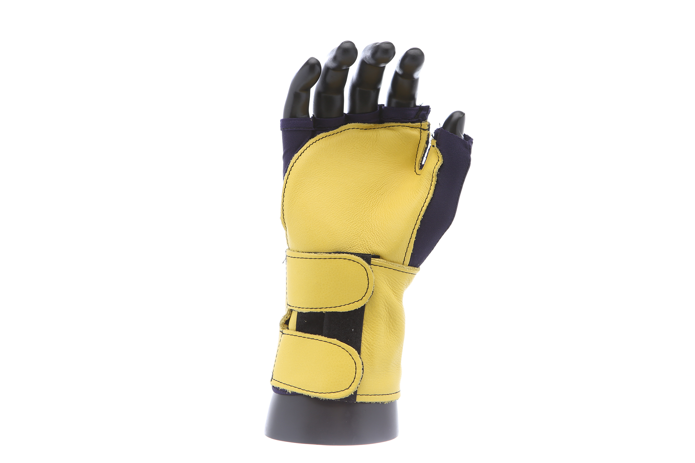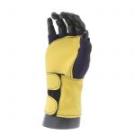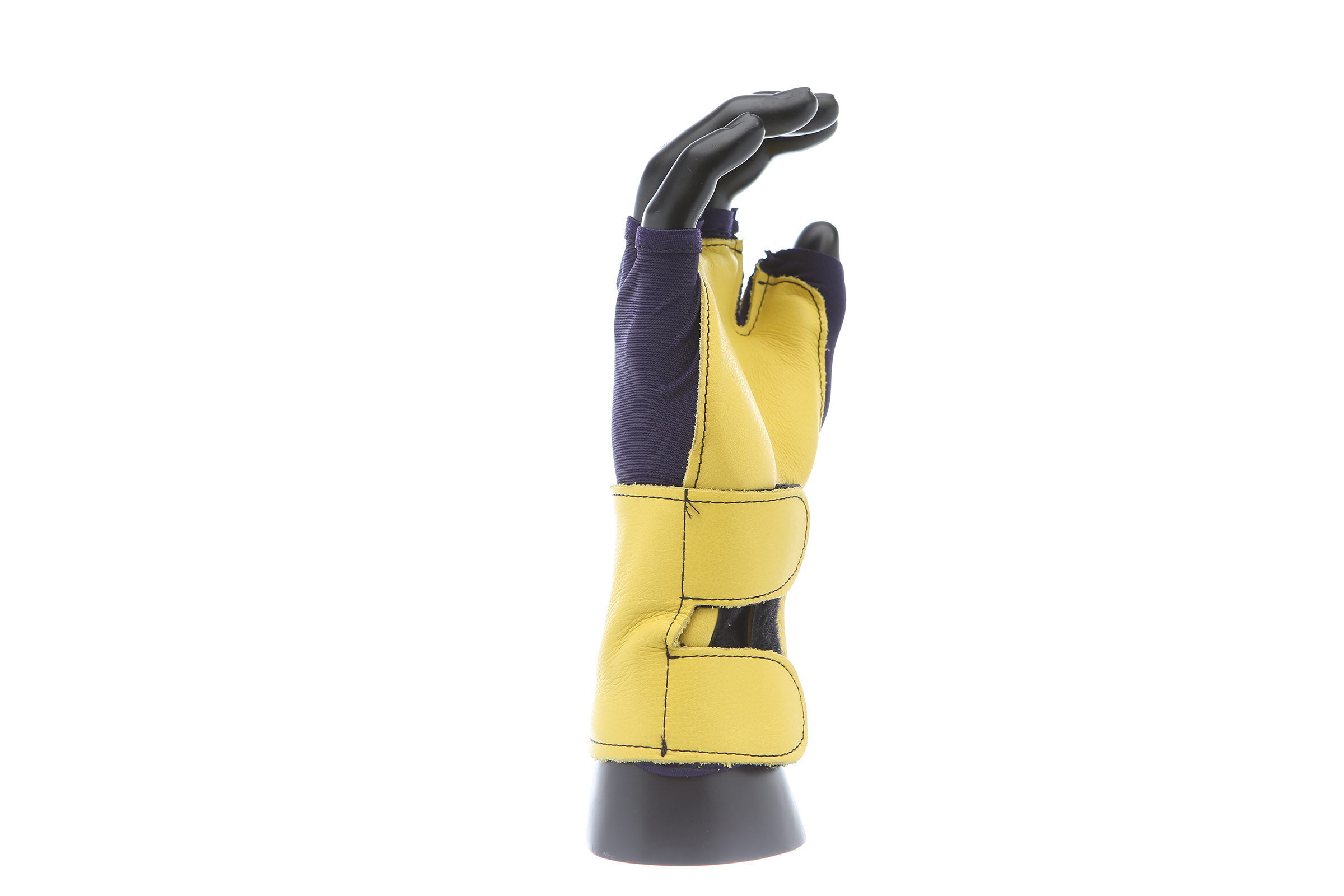 Fingerless nylon Lycra and grain leather glove with VEP padding in the palm and thumb web area. Detachable grain leather wrist support.