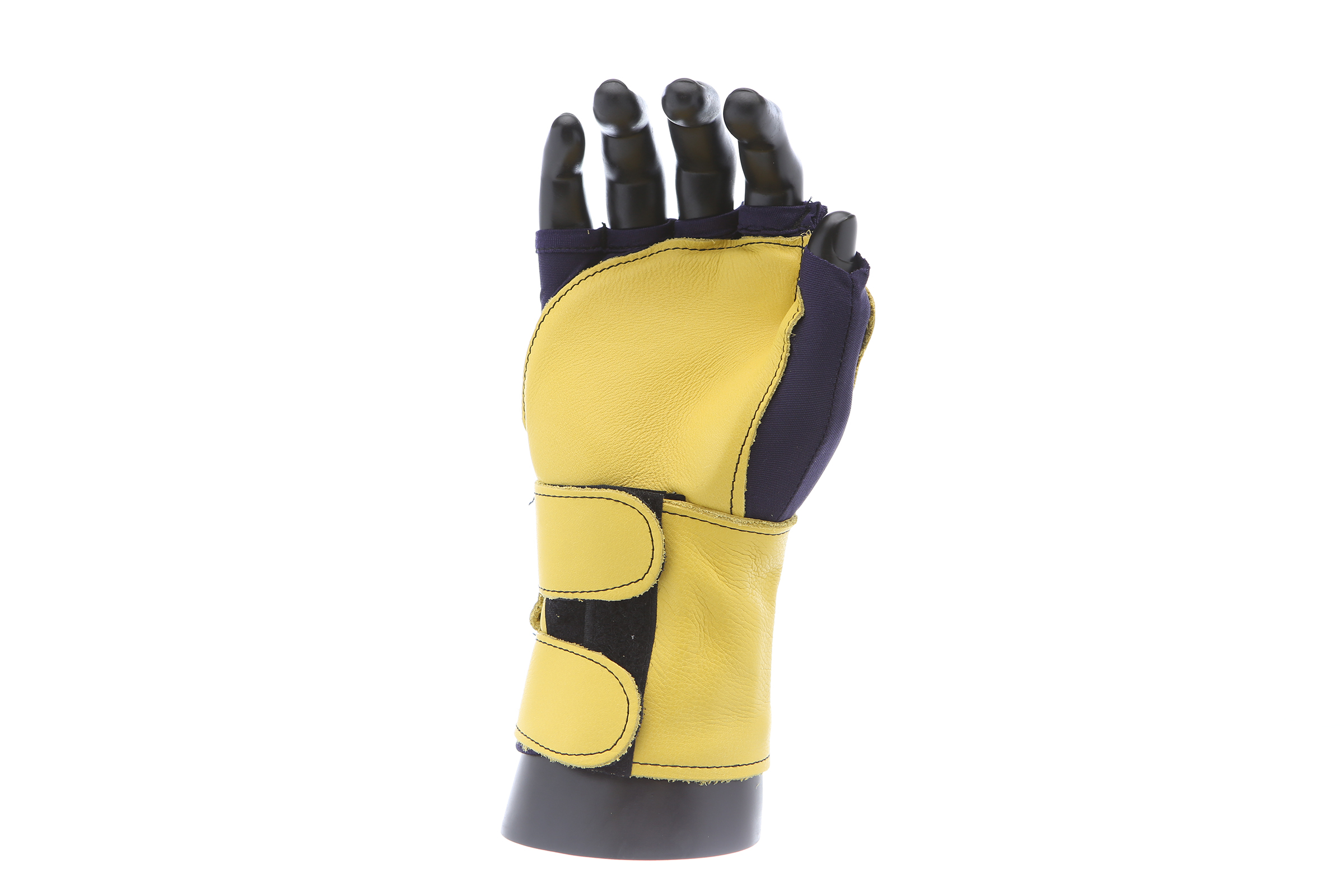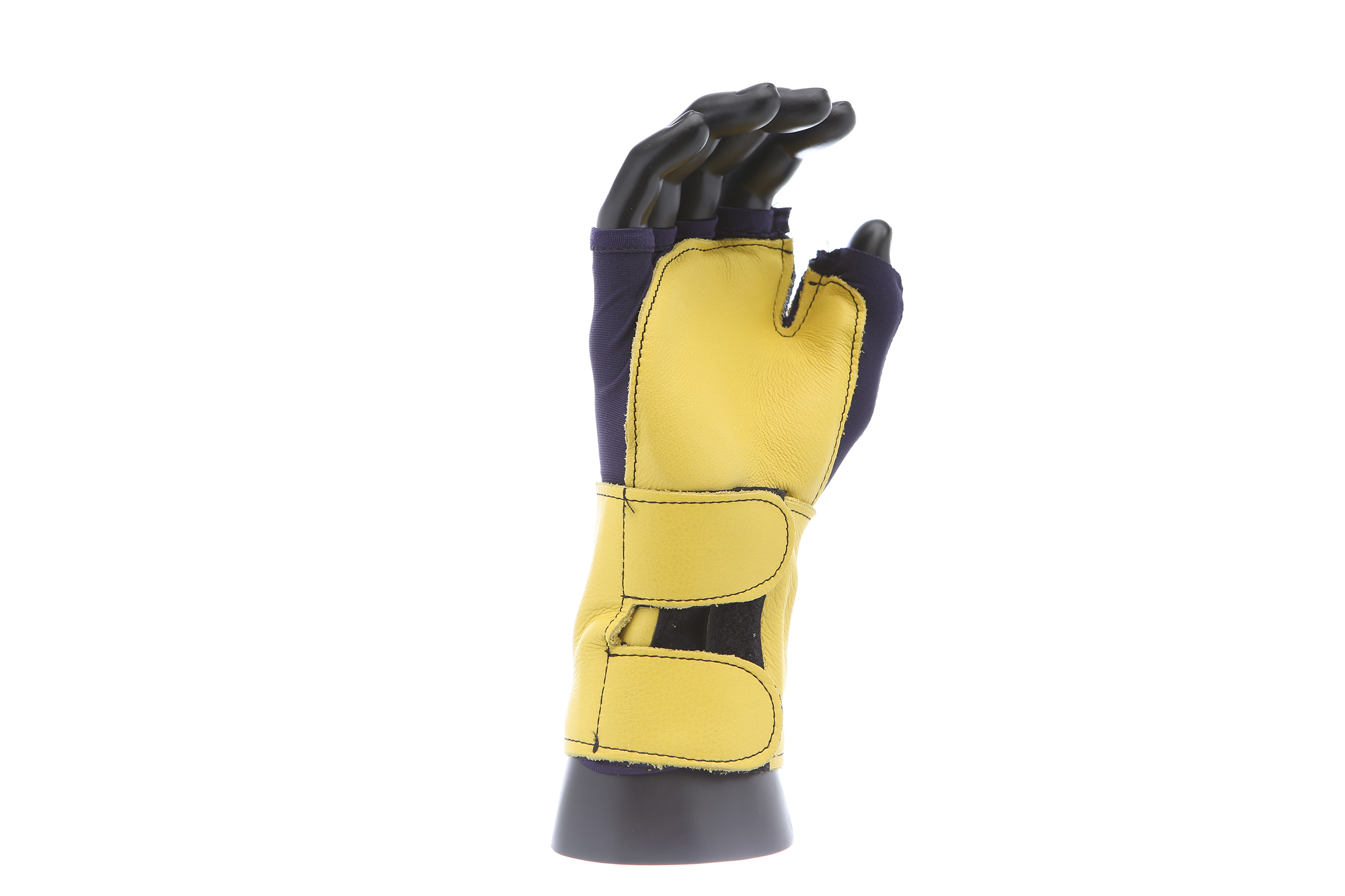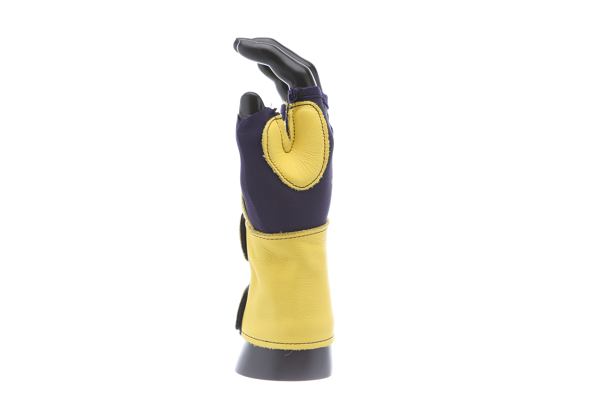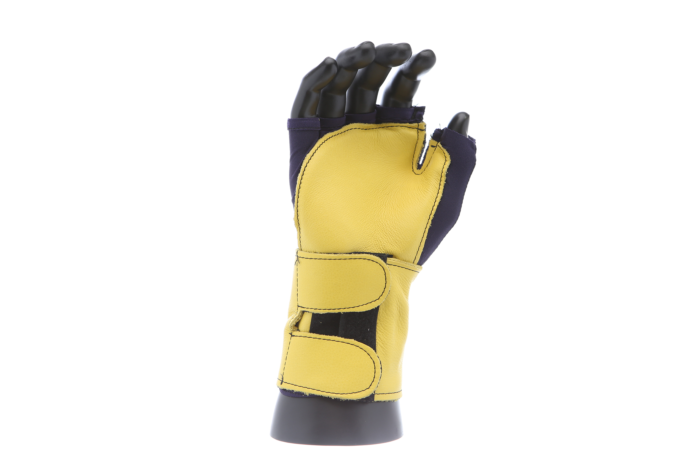 Fingerless nylon Lycra and grain leather glove with VEP padding in the palm and thumb web area. Detachable grain leather wrist support.