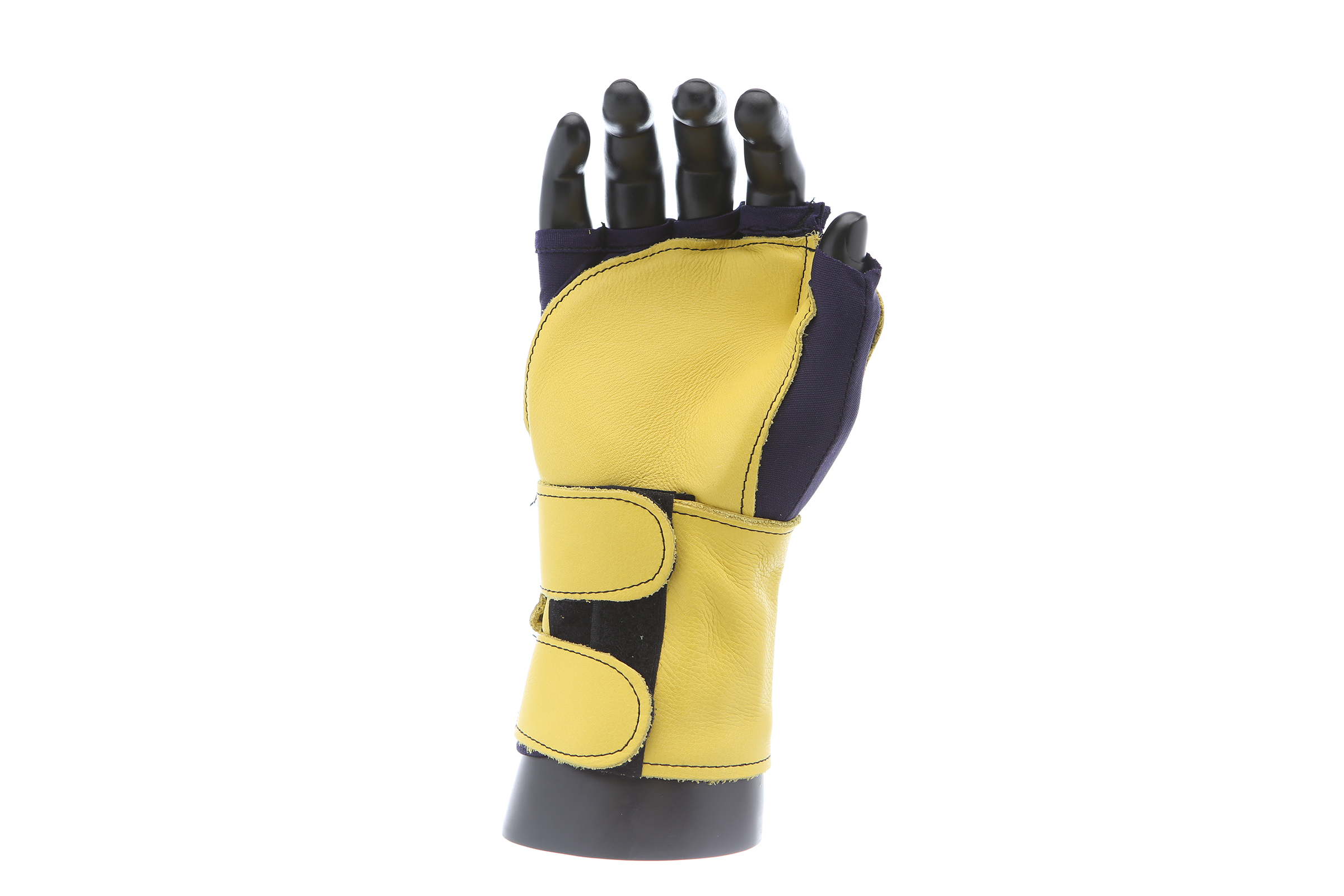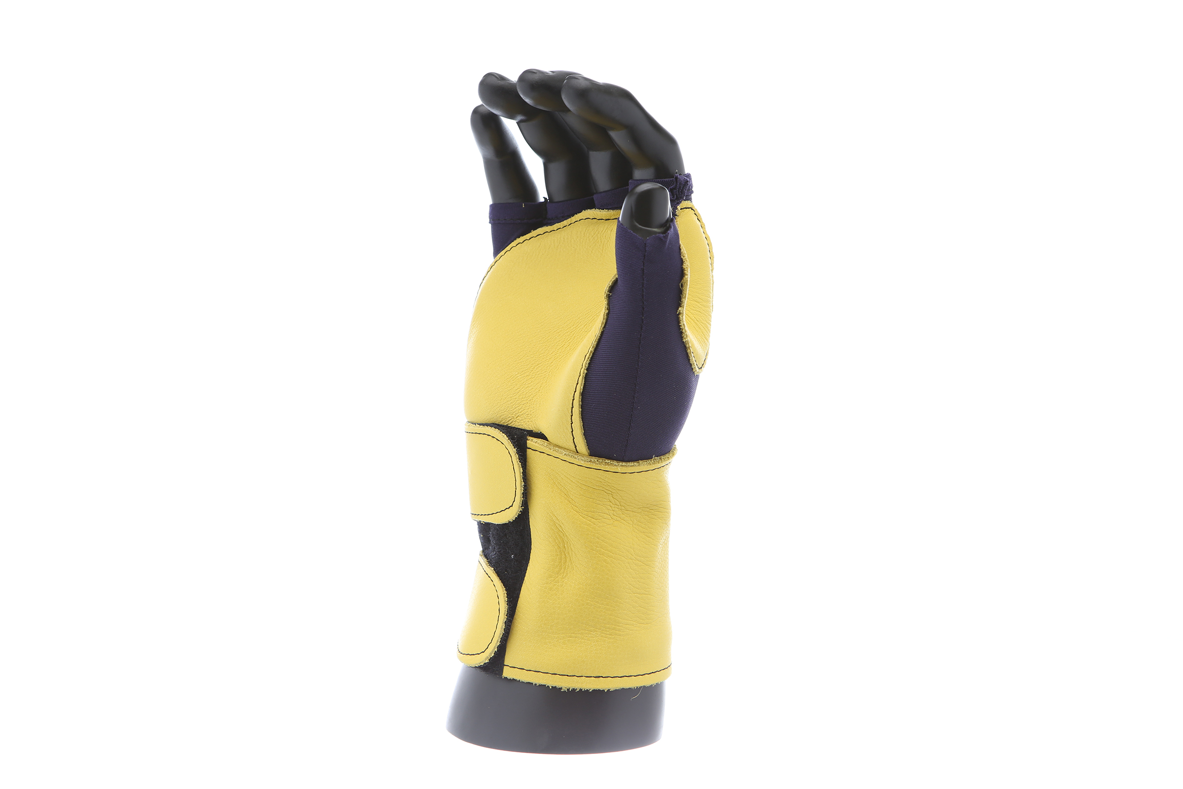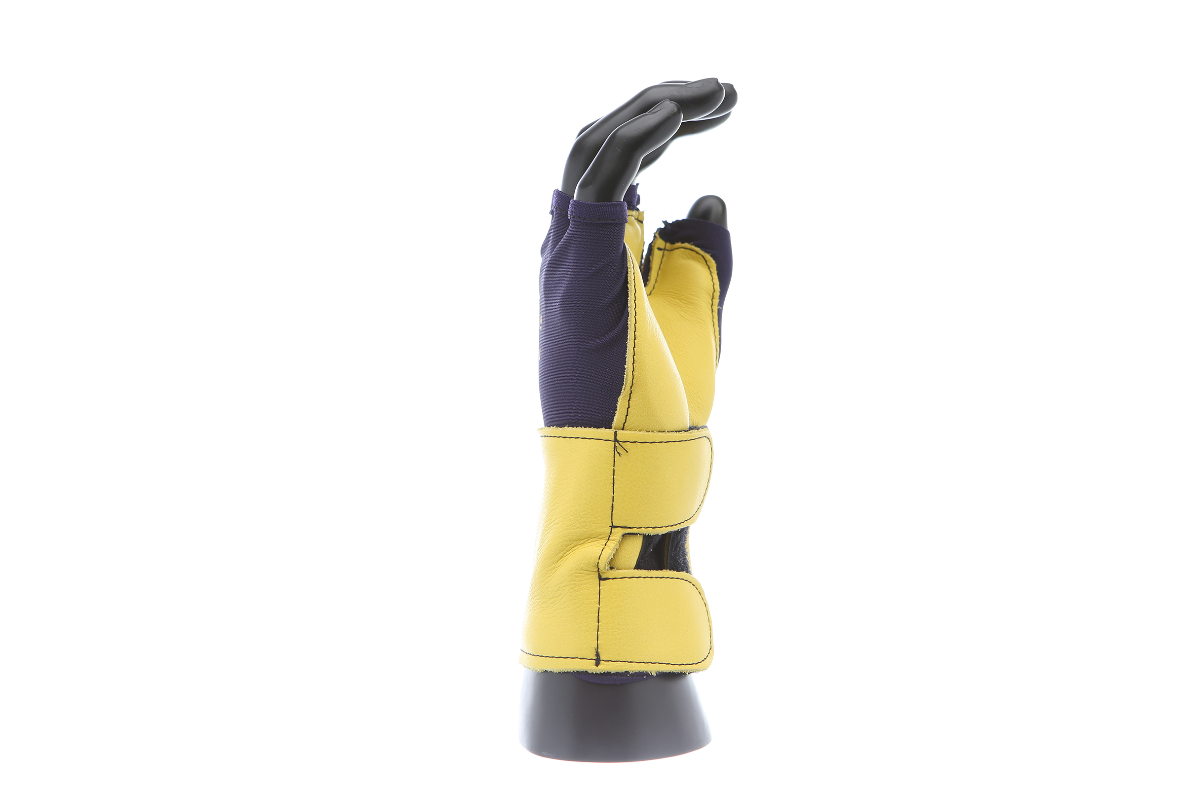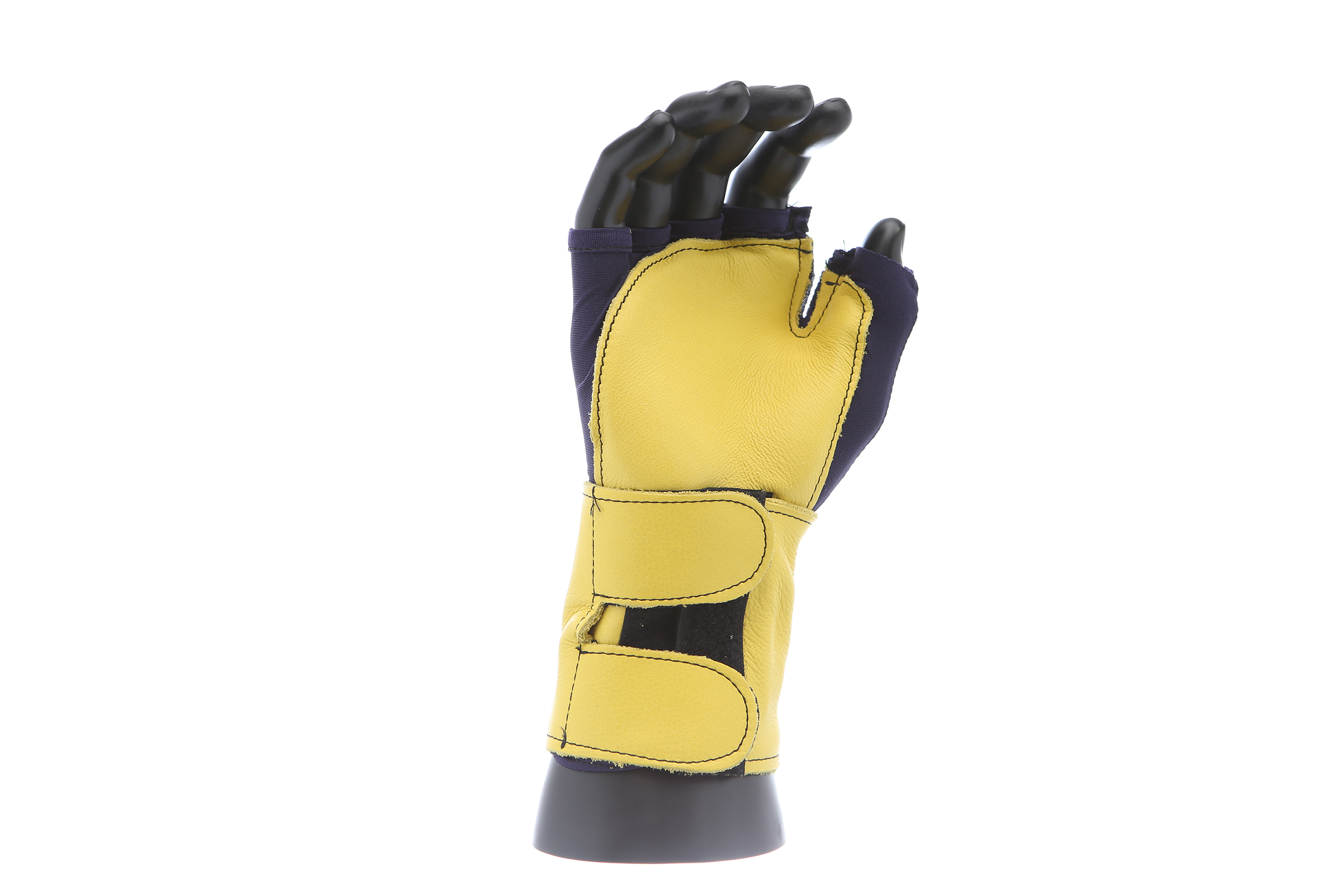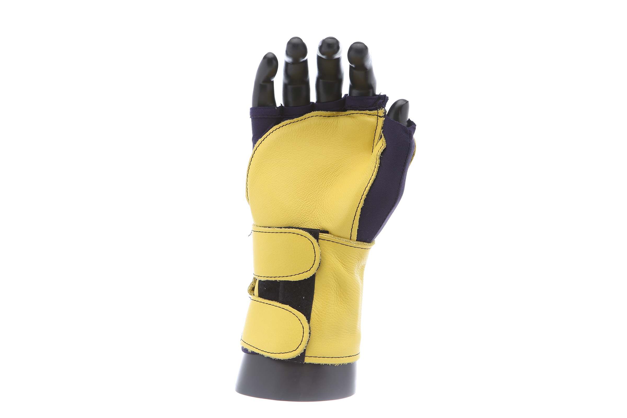 Fingerless nylon Lycra and grain leather glove with VEP padding in the palm and thumb web area. Detachable grain leather wrist support.