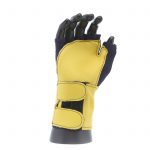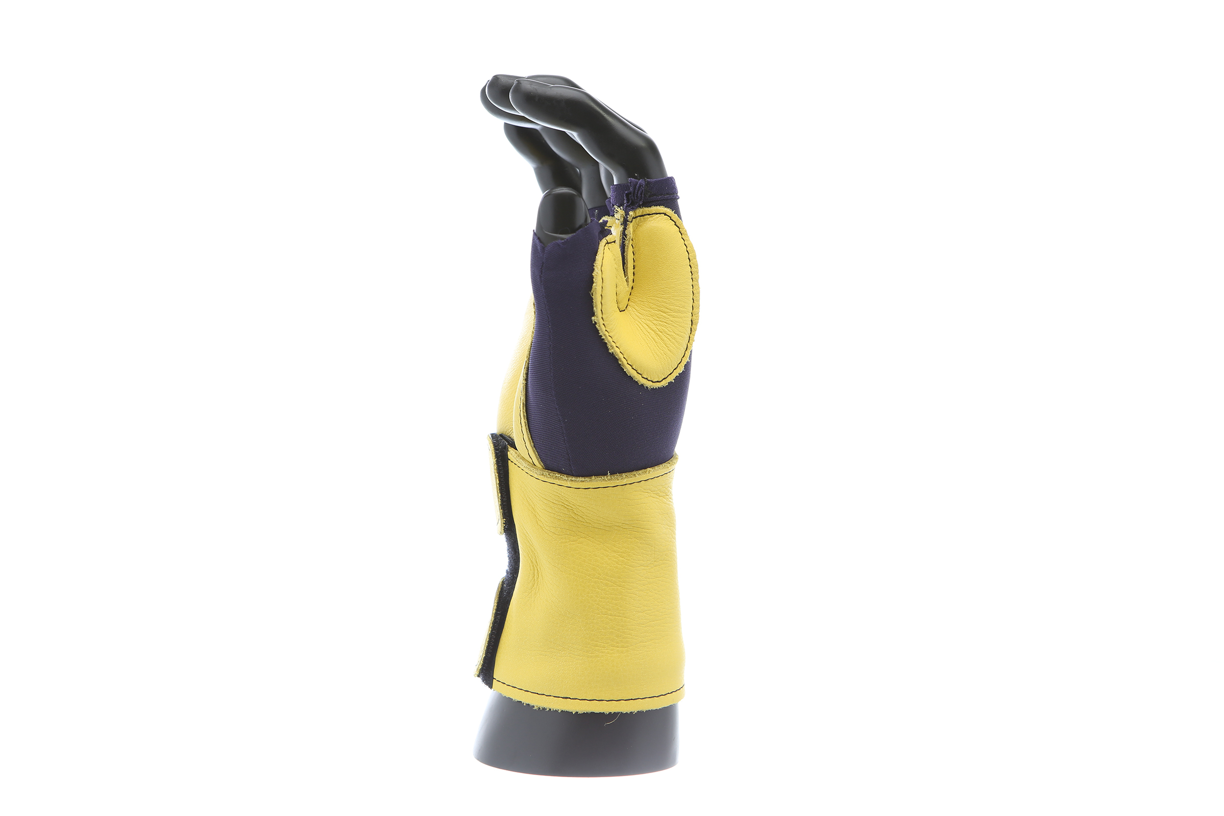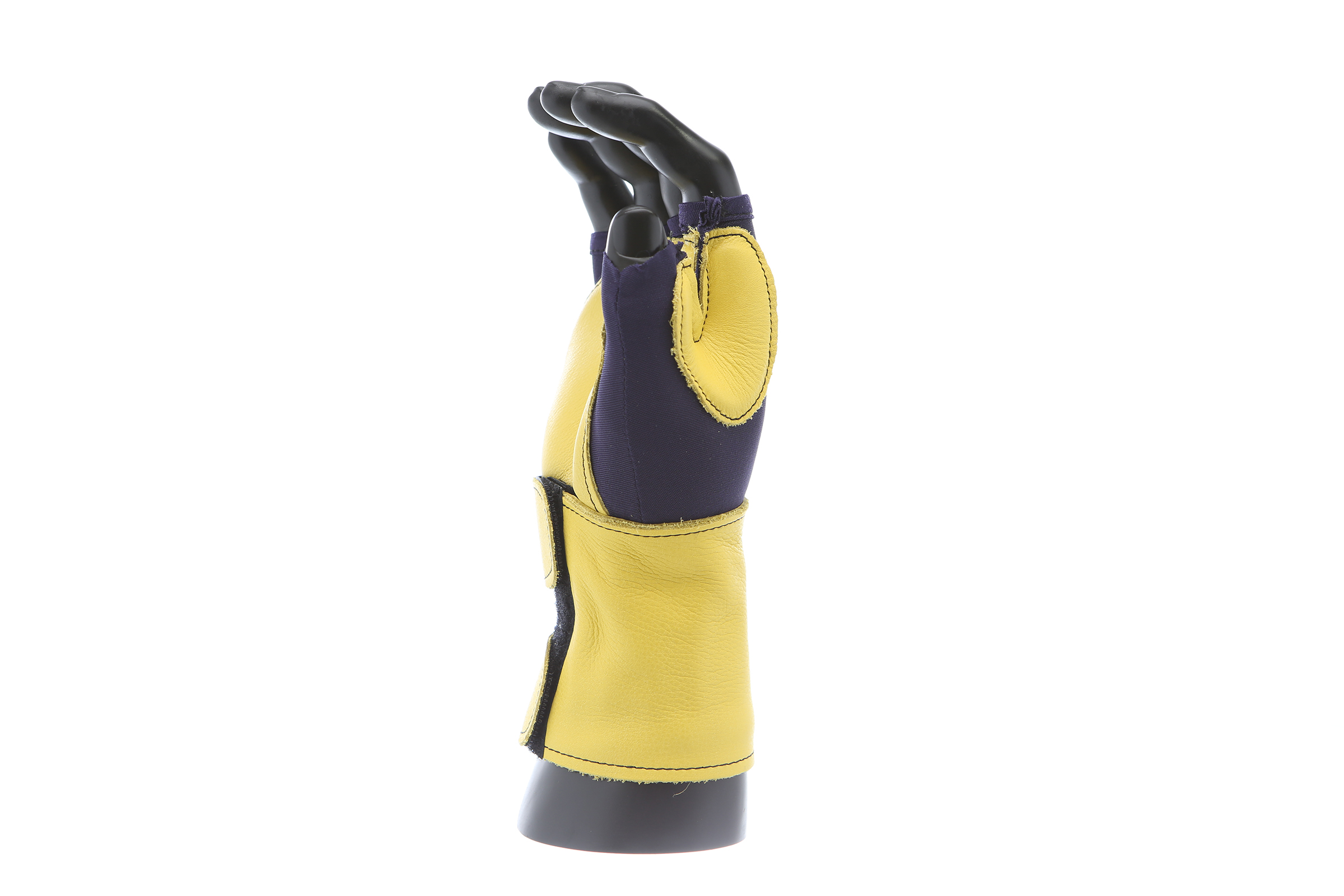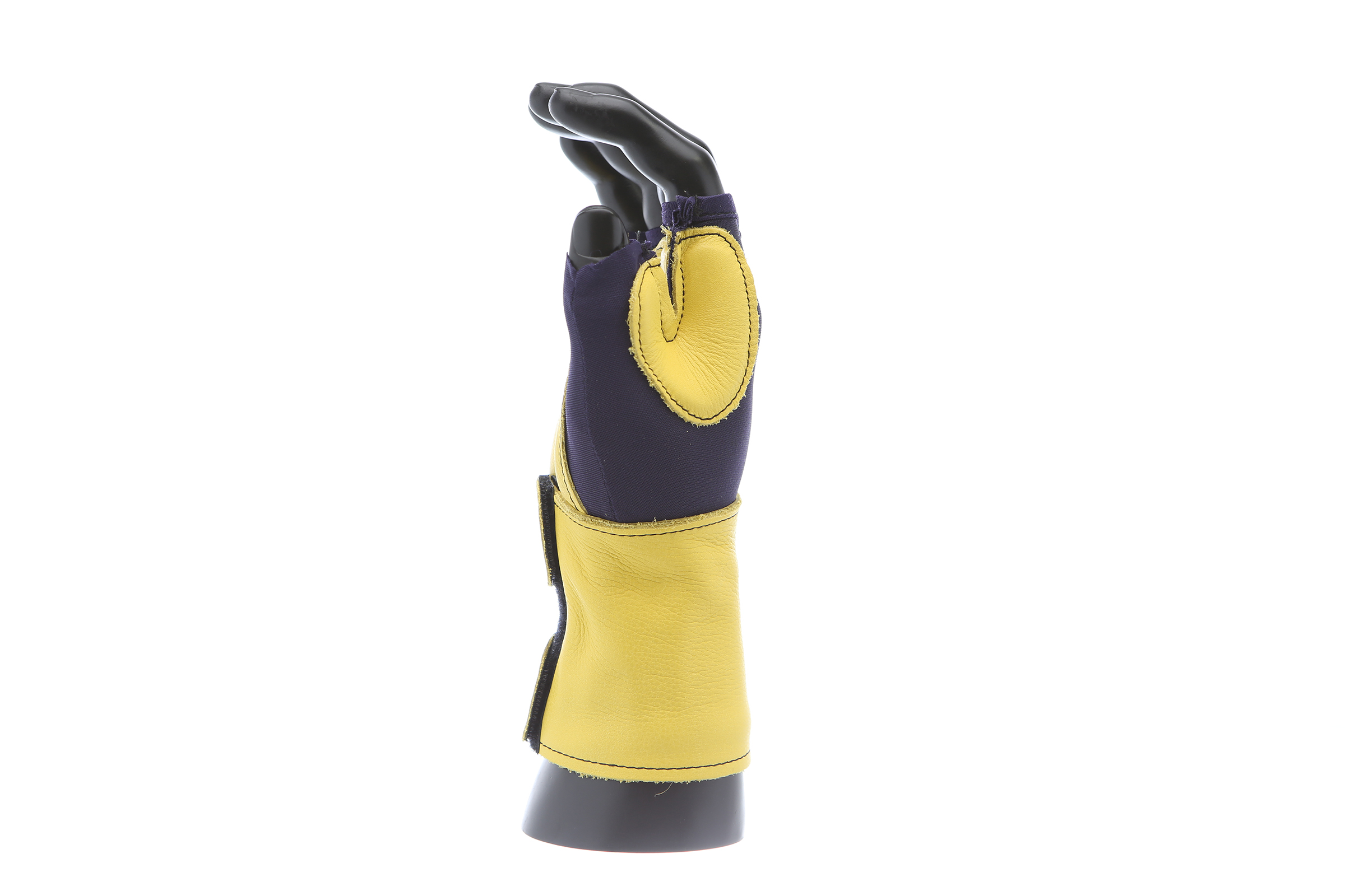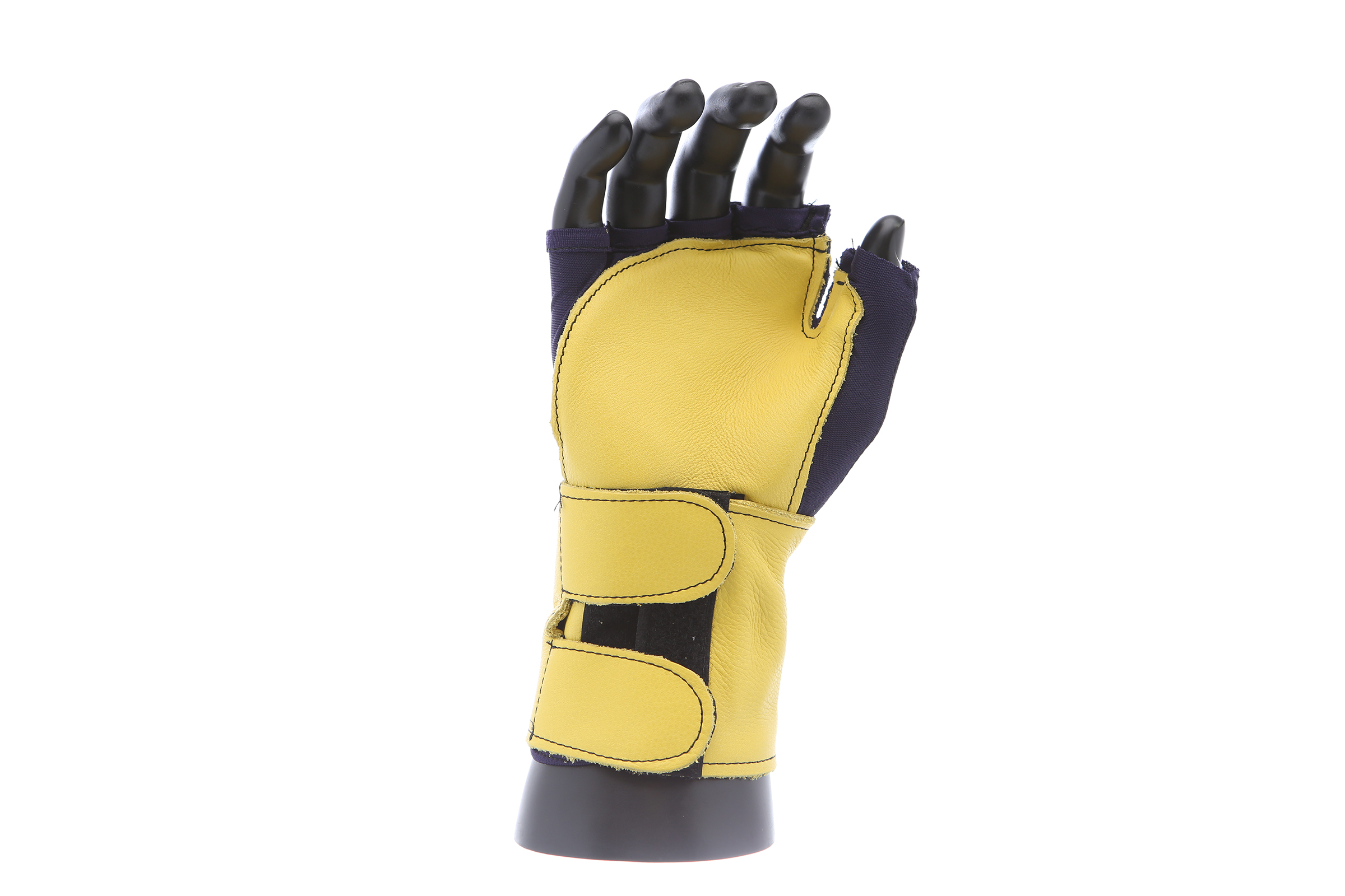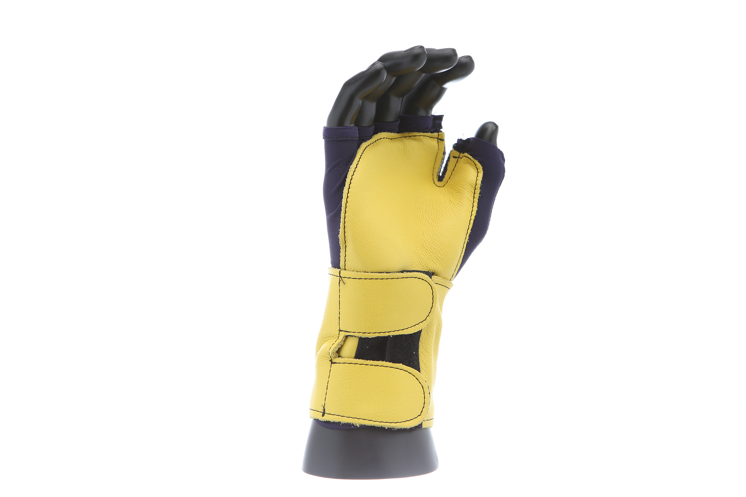 Fingerless nylon Lycra and grain leather glove with VEP padding in the palm and thumb web area. Detachable grain leather wrist support.